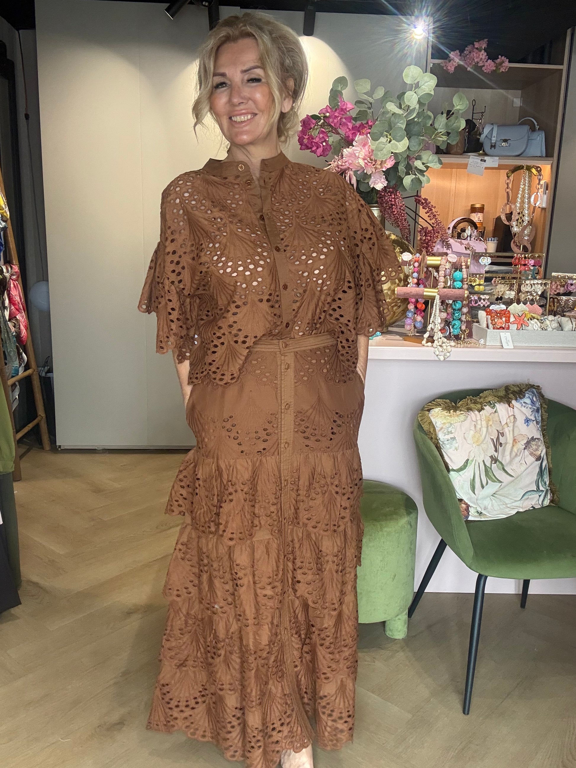 Sikke et smukt, feminint skørt! Denne mørkebrune skønhed udstråler stil og elegance med et legende boheme-touch takket være de flotte paneler og de fine detaljer. Det glatte passtykke fra talje til hofter giver en flot, slank pasform, mens skørtet derfra folder sig ud i yndefulde paneler, der bevæger sig blødt ved hvert skridt.