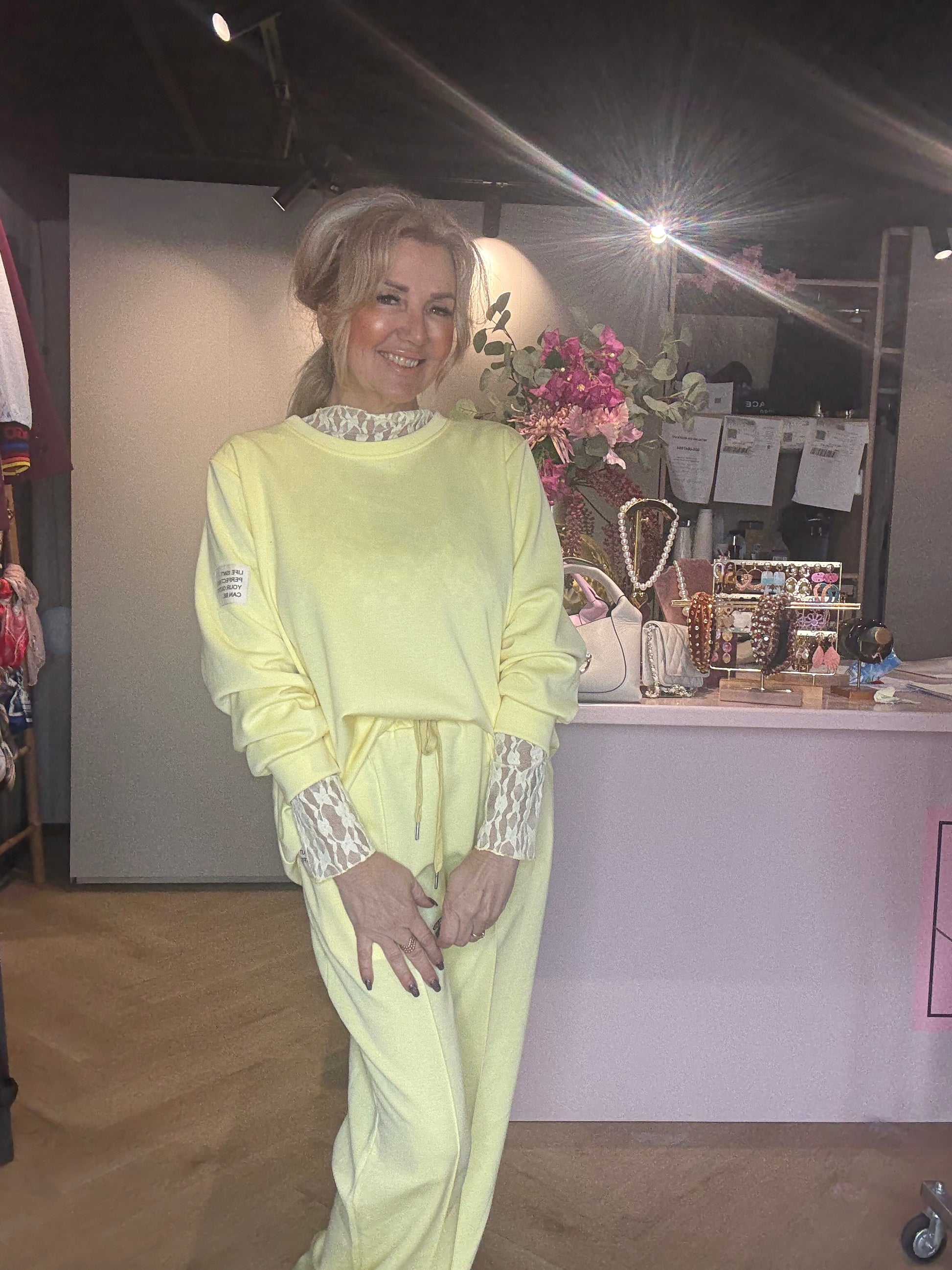 Dit tweedelige Comfy-pak in een stralende gele tint is echt zo’n set waar je meteen blij van wordt. Lekker makkelijk zittend, soepel vallend en perfect voor dagen waarop je er stijlvol uit wilt zien zónder in te leveren op comfort. De stof draagt heerlijk en door de fijne pasvorm kun je dit pak supermakkelijk zowel casual als wat chiquer stylen.