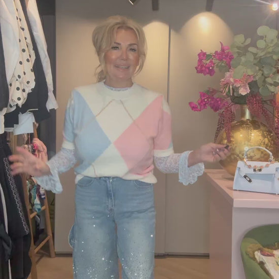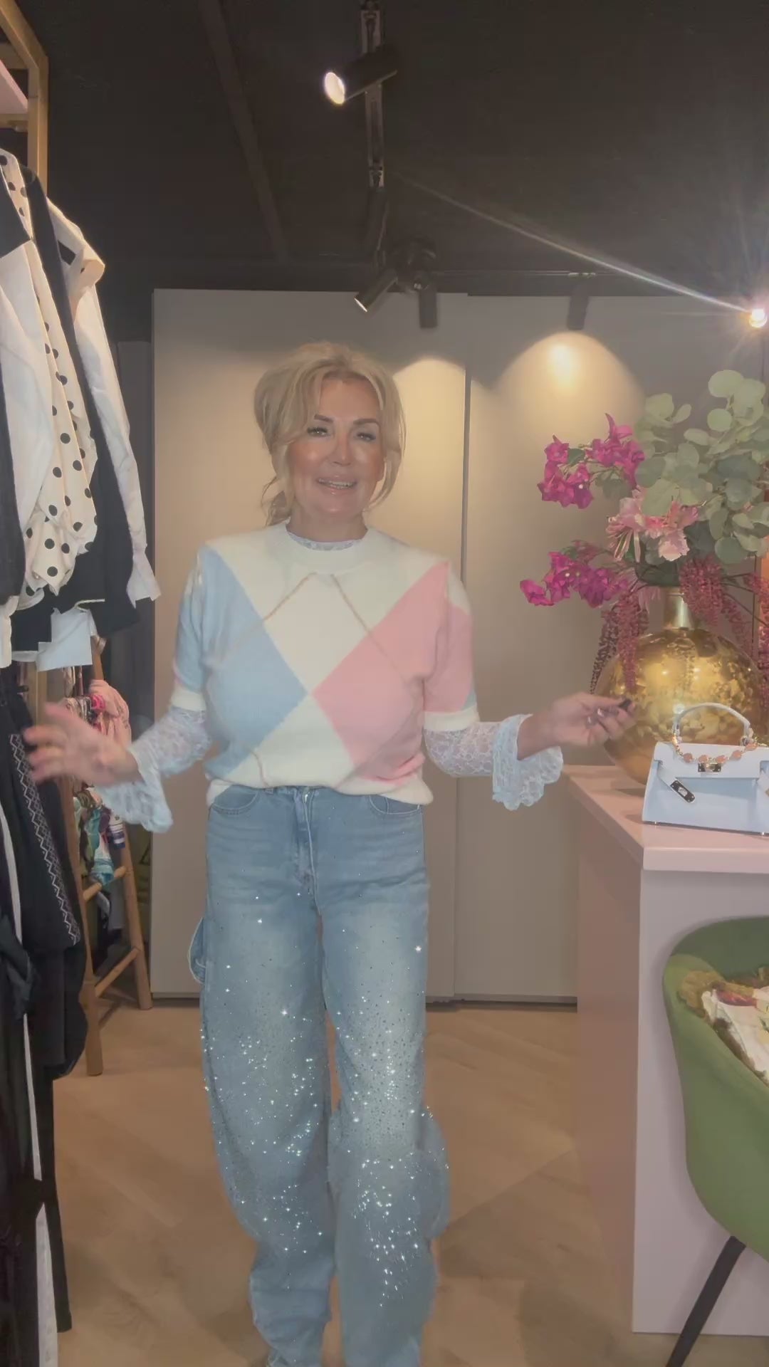 Dit is een echt worker model, helemaal on trend en het nieuwste van het nieuwste. Wij hebben deze broek gecombineerd met een college style knitwear trui in lichtblauw met zacht roze en ecru, en daaronder een lace top in lichtblauw. Natuurlijk kun je deze lace top ook in ecru of zacht roze dragen – allemaal verkrijgbaar in onze webshop 💕