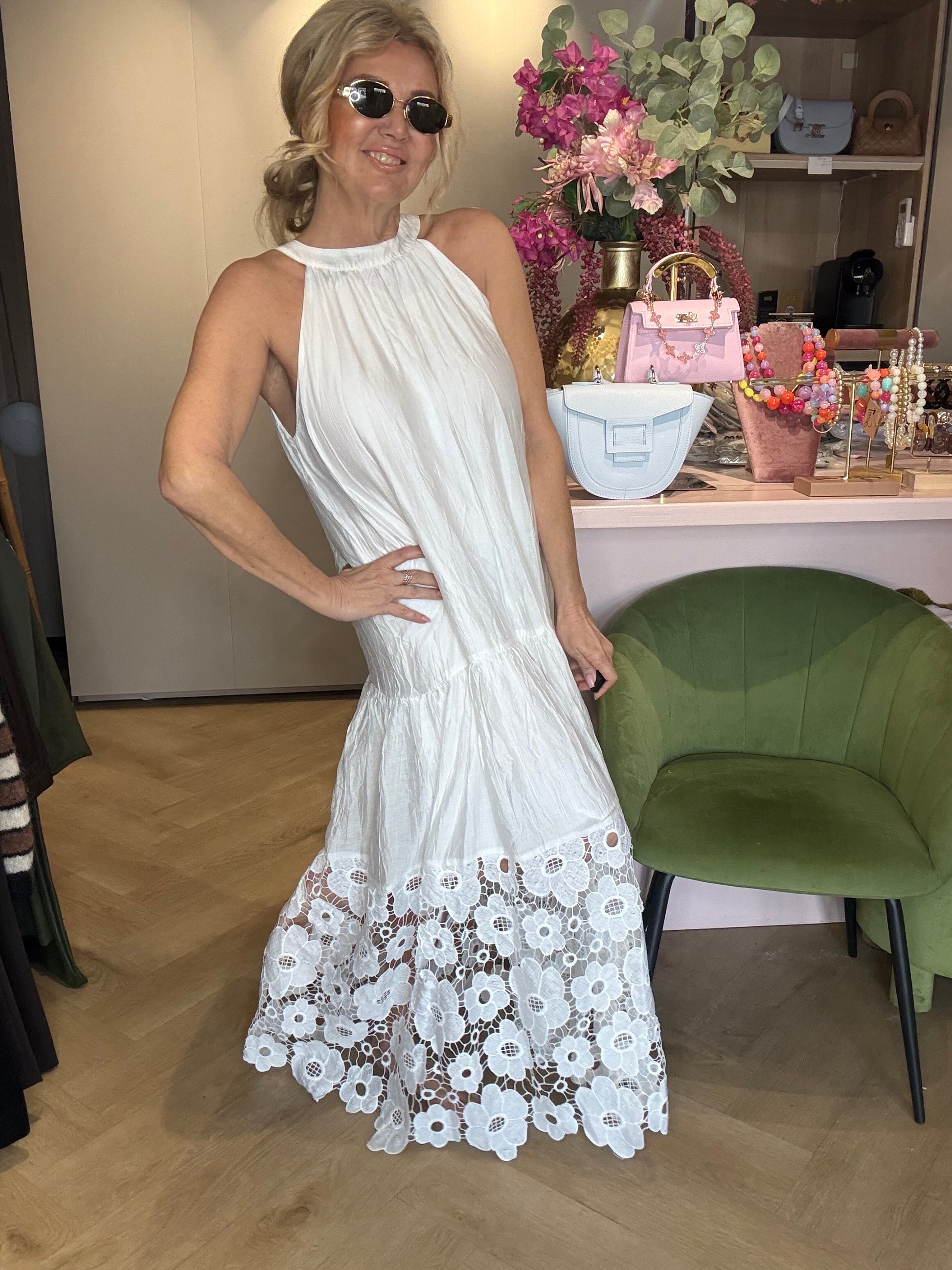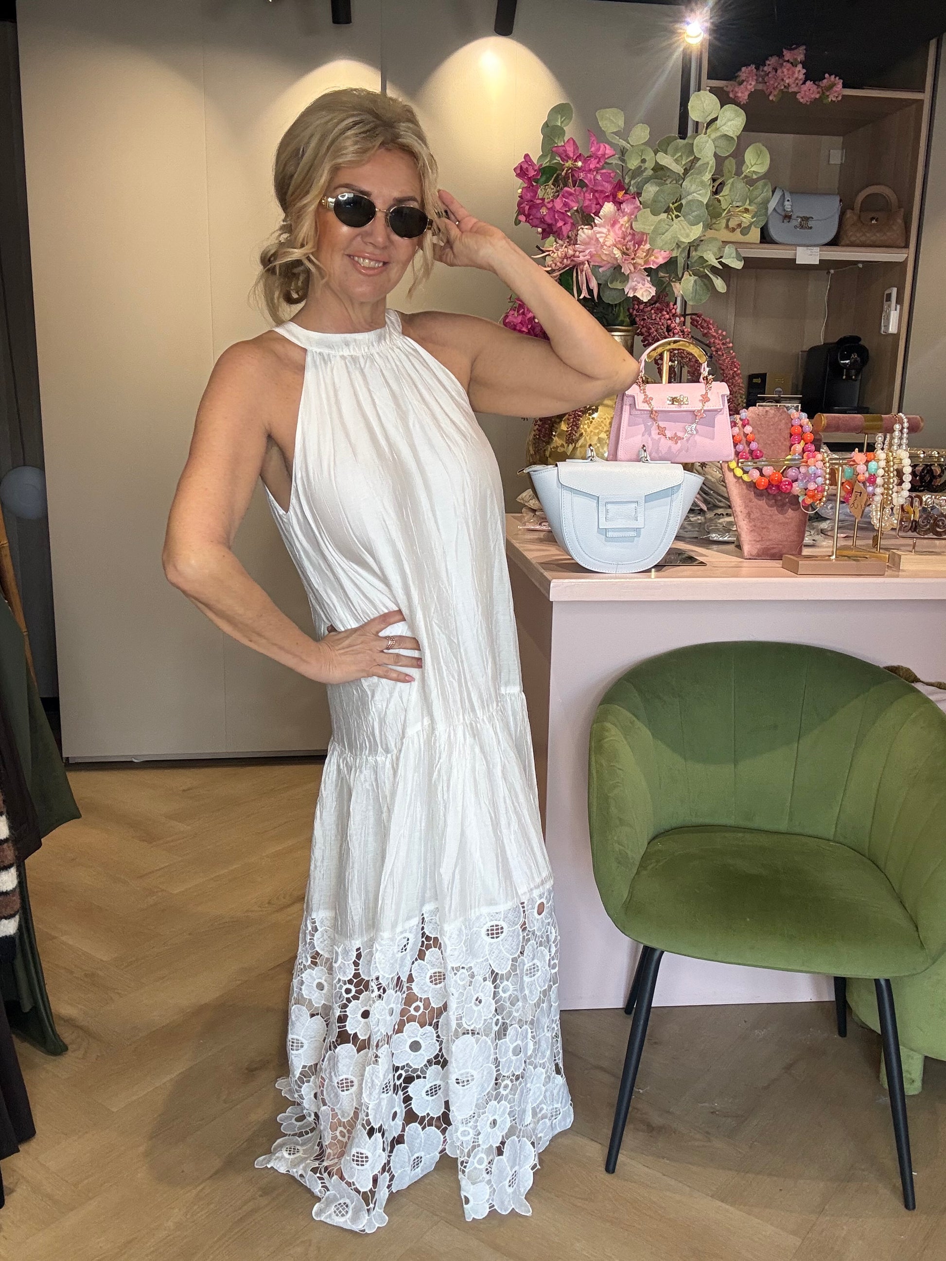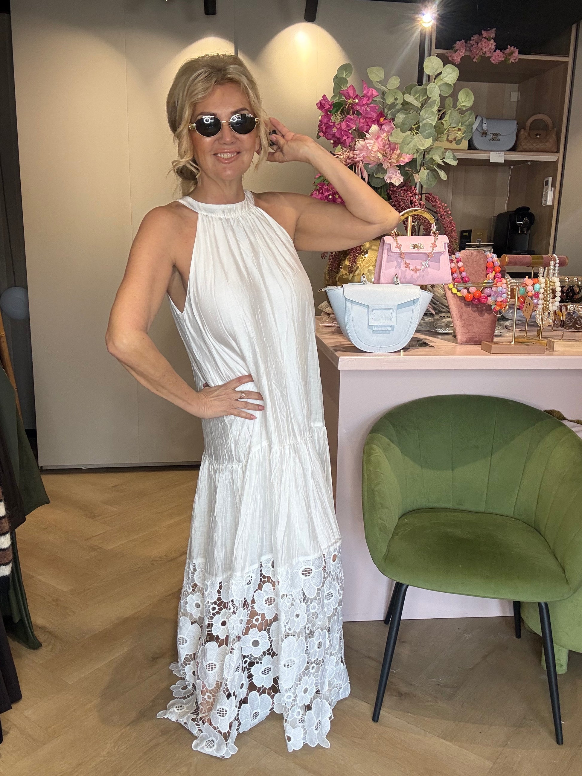 Witte Halterjurk met Opengewerkte Bloemenrand – Elegant & Zomers
