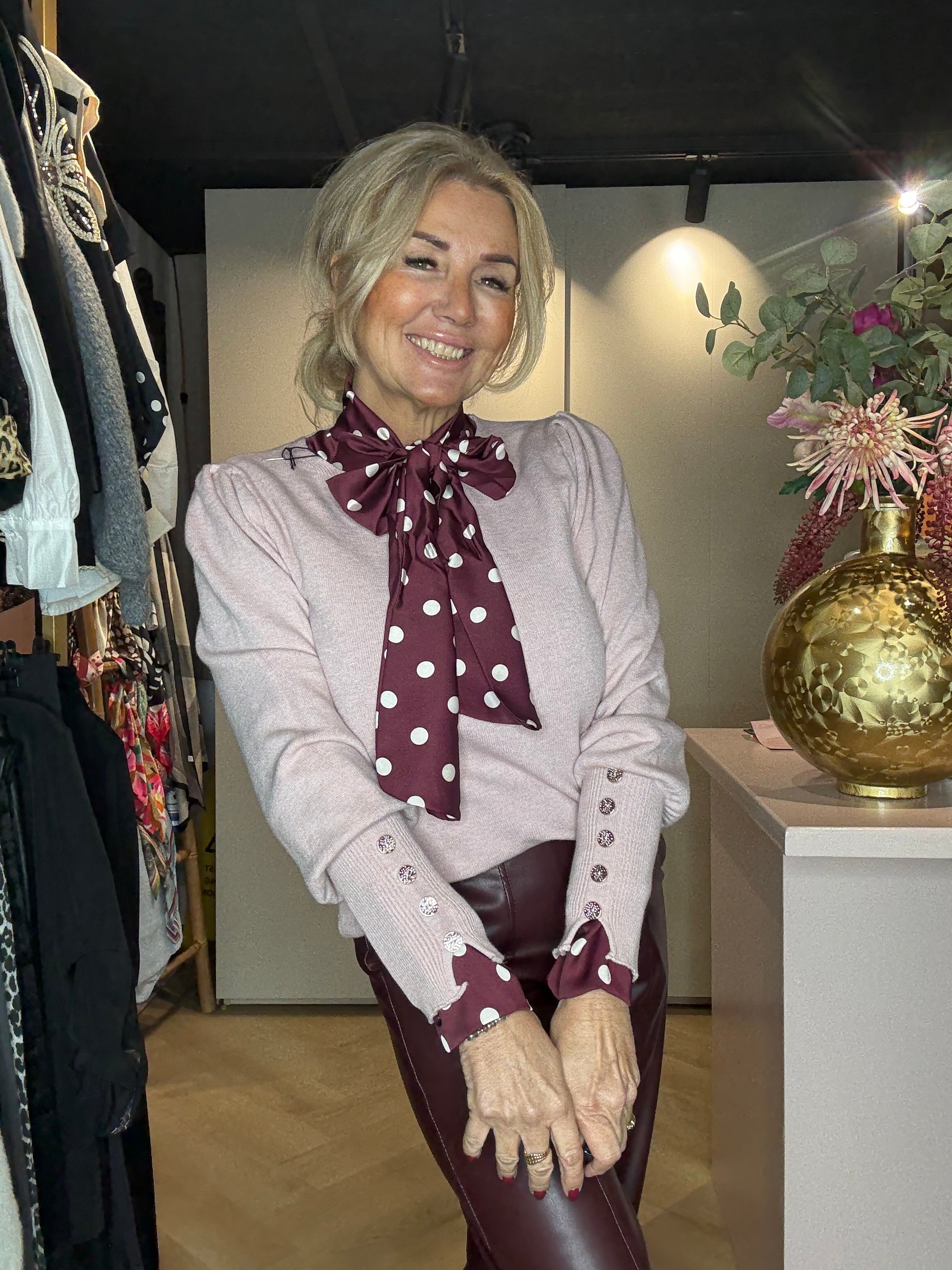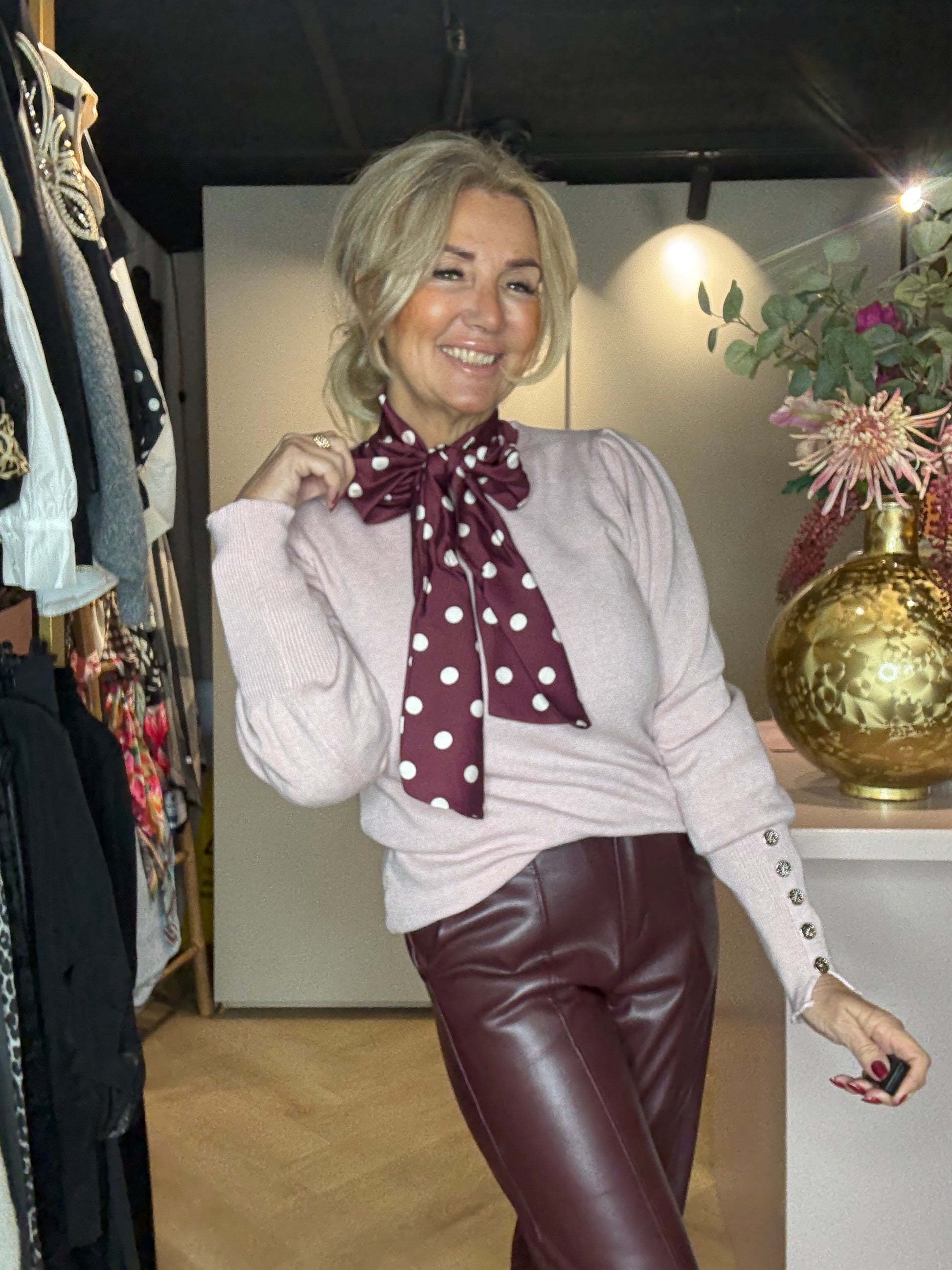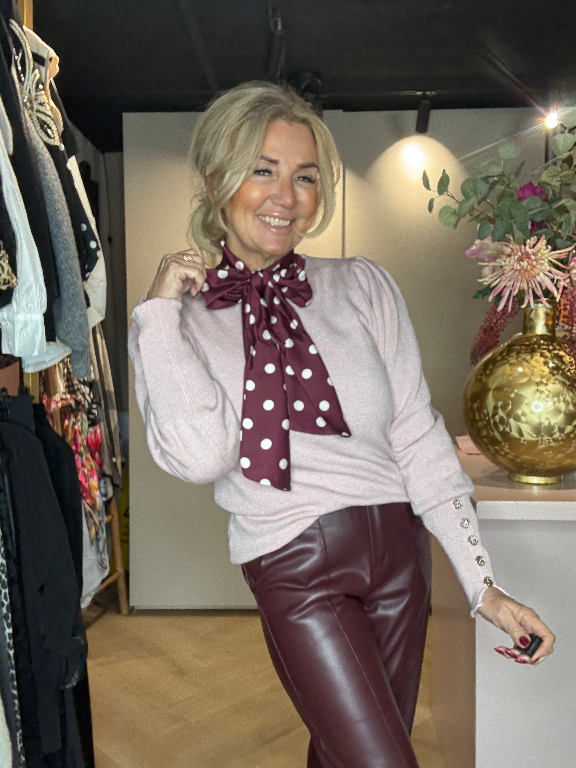 We hebben hem hier gestyled met de Polkadot blouse Bordeaux én de Puh Leather Look broek Bordeaux — een waanzinnig chique combinatie.