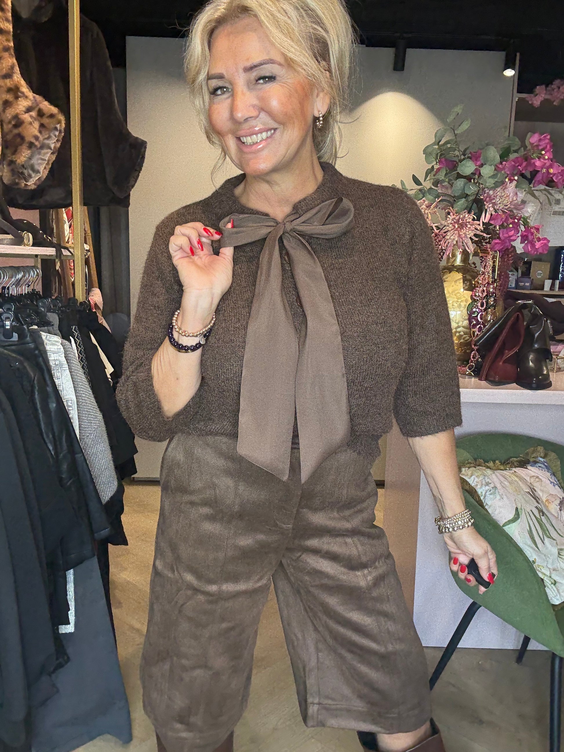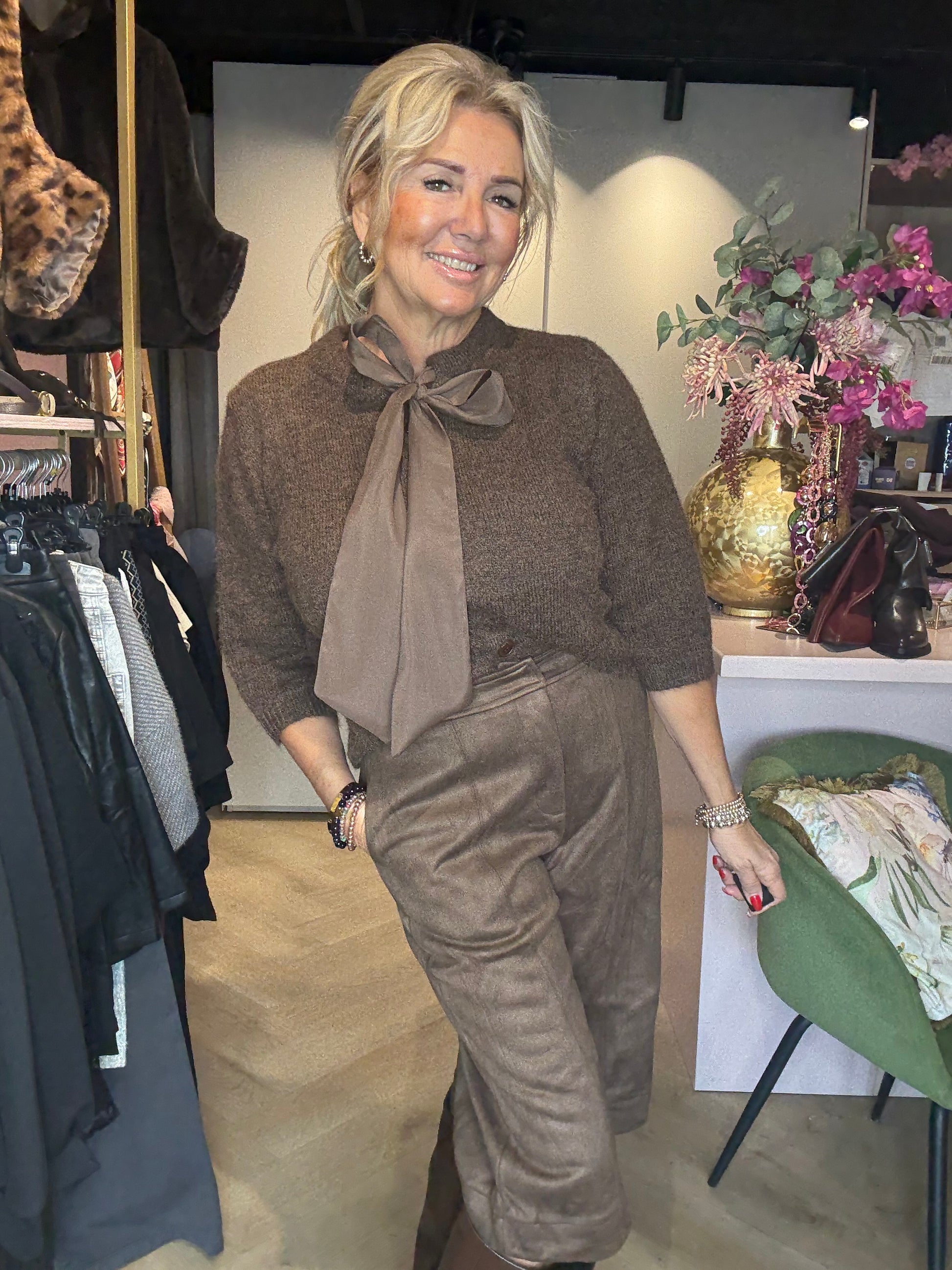 Dit prachtige vestje straalt elegantie en vrouwelijkheid uit. Het is uitgevoerd in een warme donkerbruine tint en heeft een stijlvolle driekwart mouw. De echte eyecatcher is de prachtige zijden strik aan de hals in exact dezelfde kleur, die je speels kunt strikken of nonchalant los kunt laten hangen.