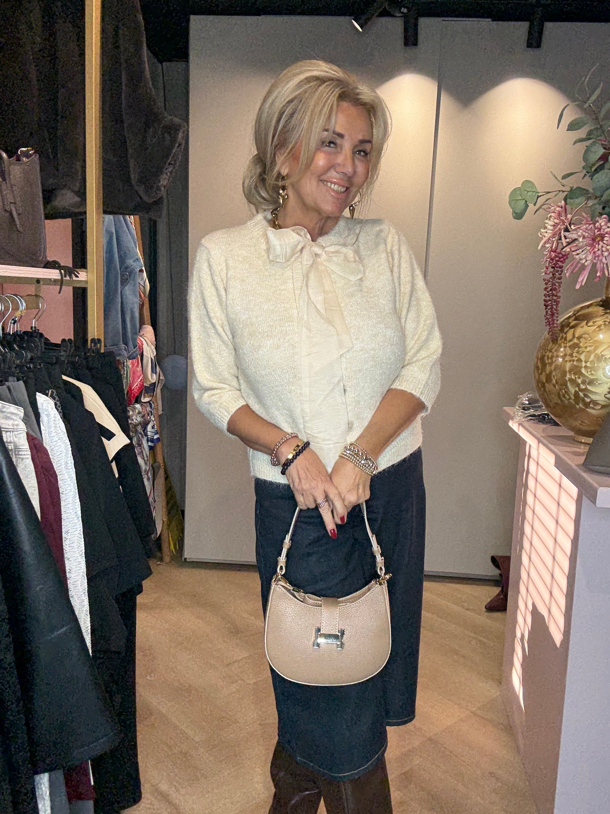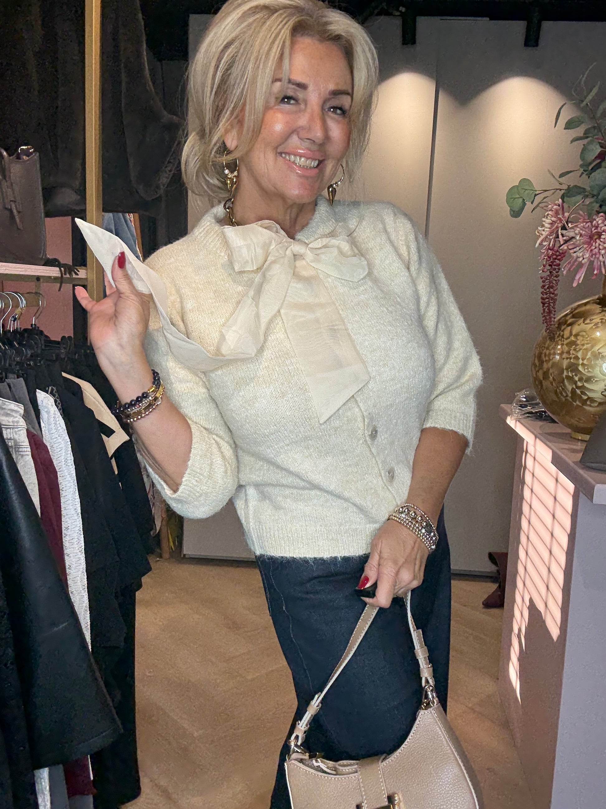 Dit prachtige vestje in een zachte cream uitvoering straalt klasse en verfijning uit. De driekwart mouw geeft een speels en vrouwelijk effect, terwijl de zijden strik aan de hals zorgt voor dat chique detail. Je kunt de strik elegant vastknopen of nonchalant los laten hangen – net waar jij zin in hebt.