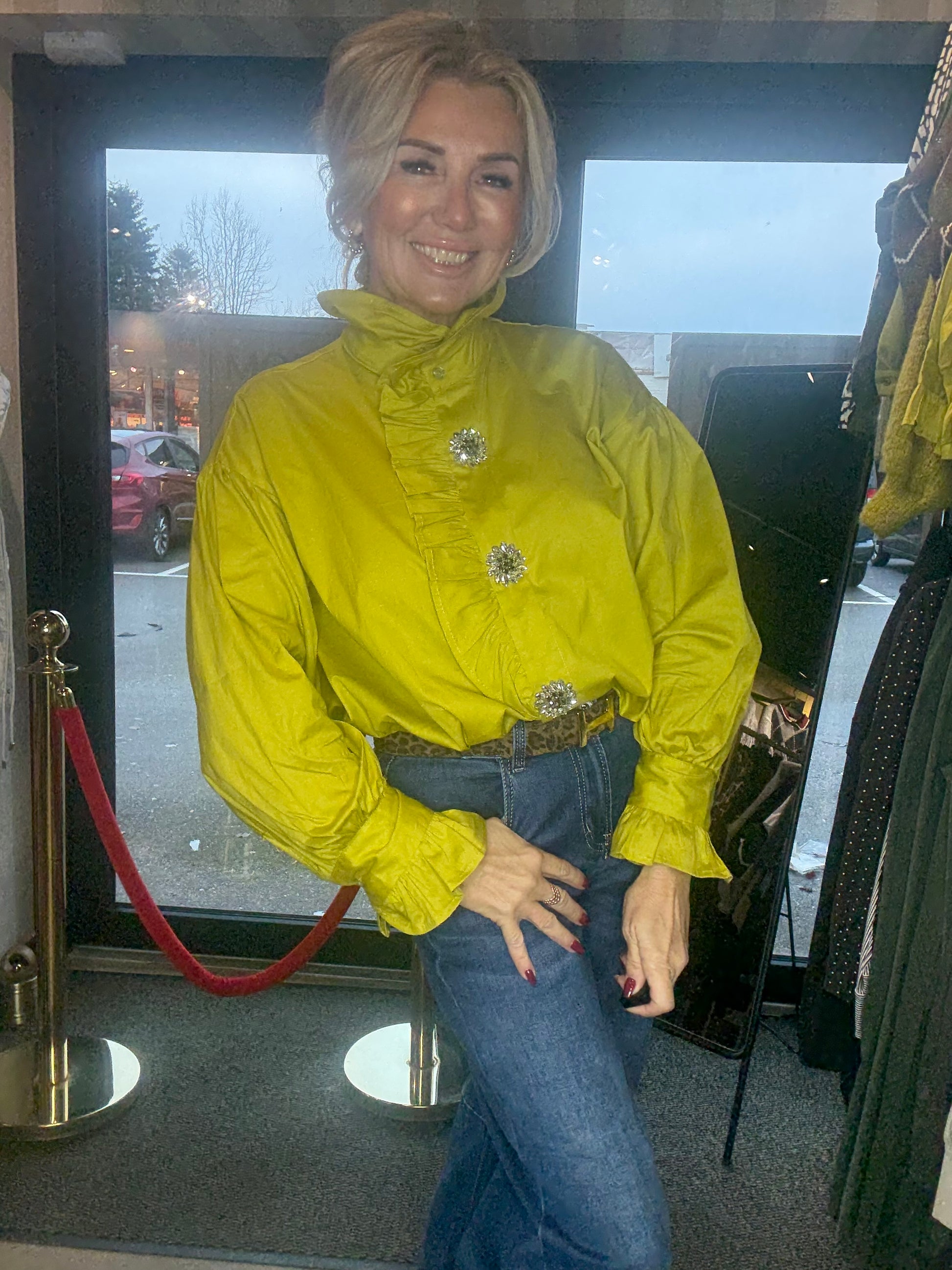 Deze prachtige blouse in de stunning kleur Lime Green is zo’n item waar je meteen blij van wordt. De elegante roesel langs de halslijn en de fijne roeseldetails aan de manchetten geven hem een rijke, vrouwelijke uitstraling.
