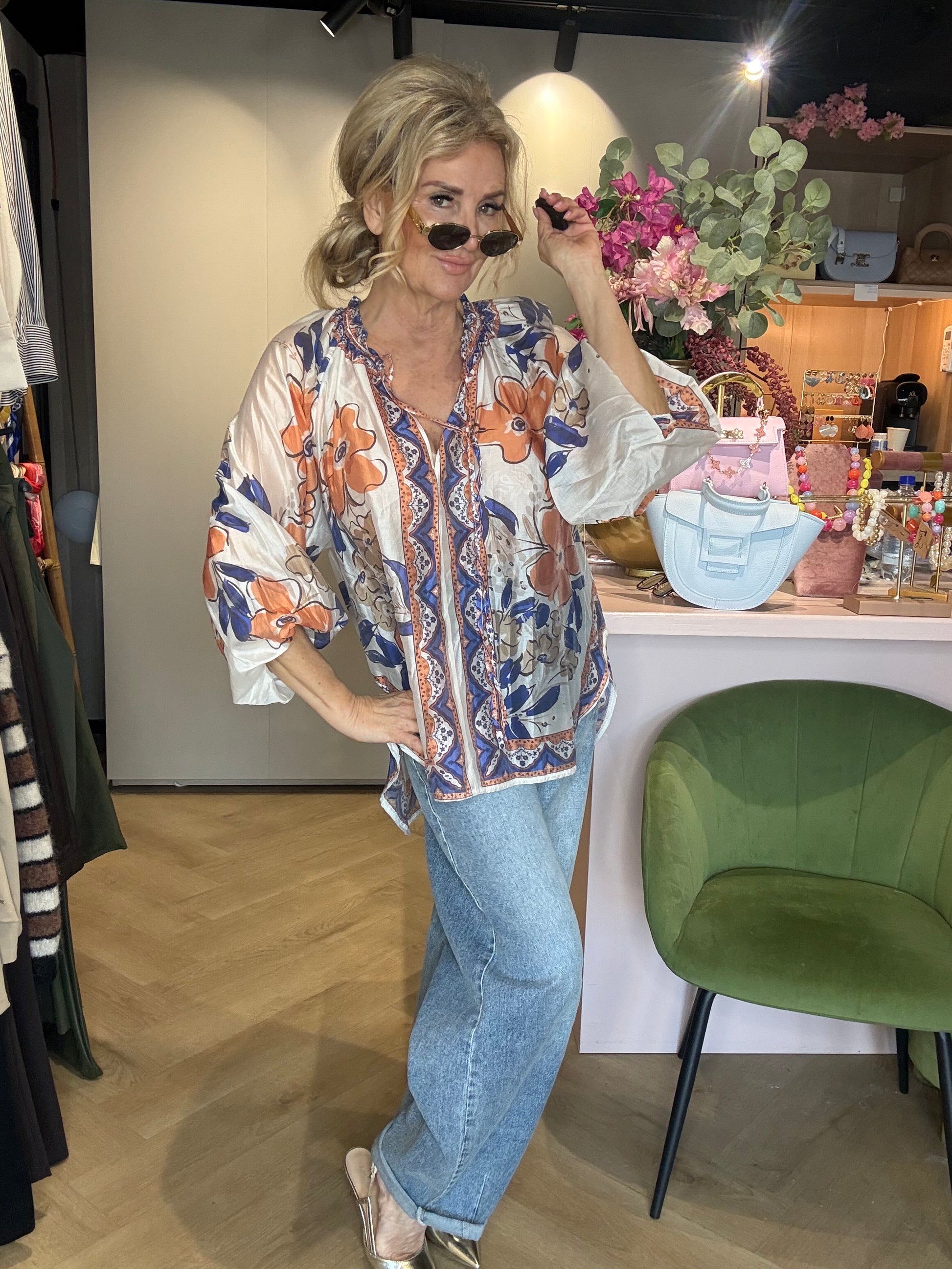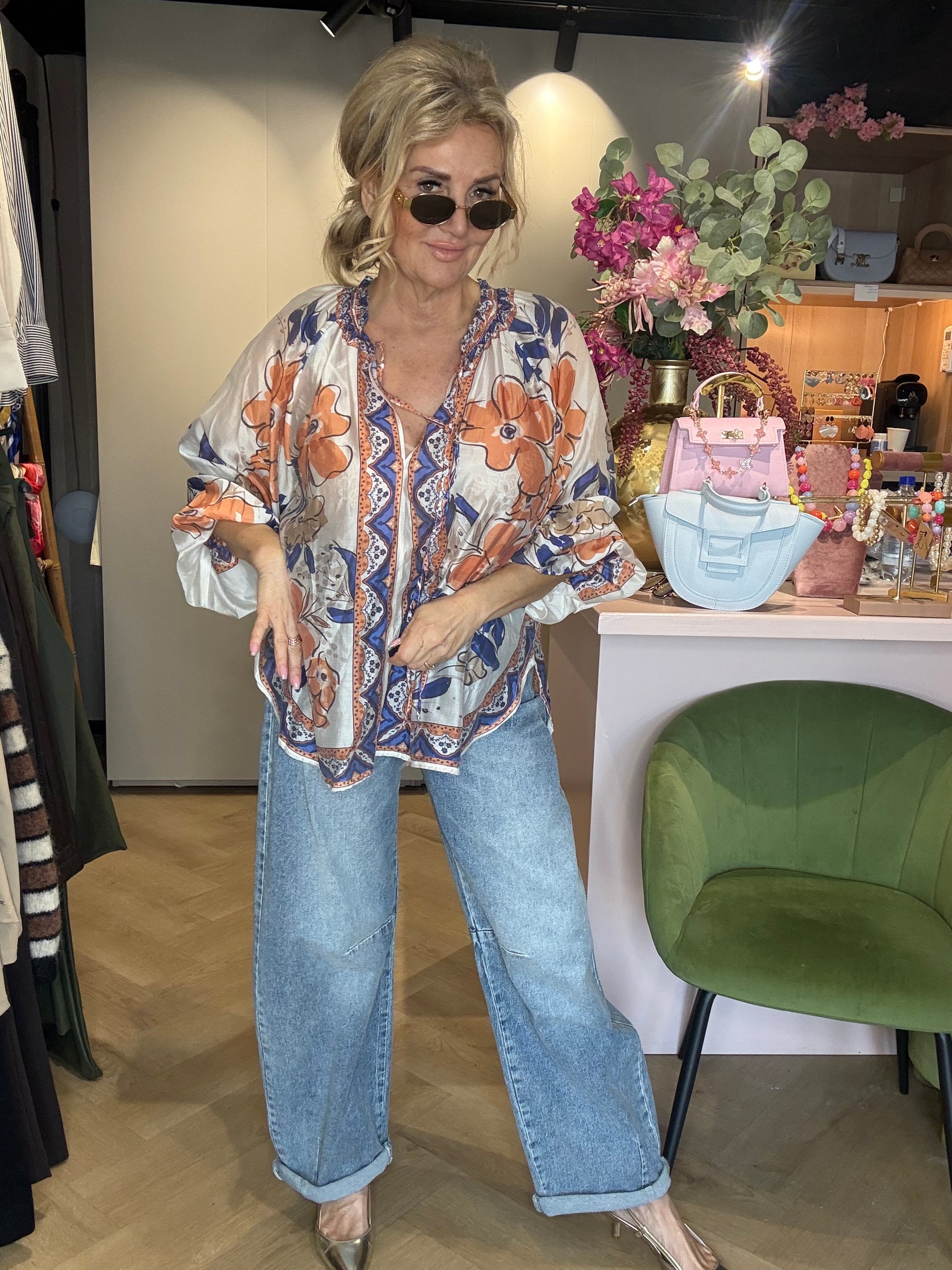 Deze blouse is zowel heel mooi casual te dragen op een jeans of short, maar staat ook prachtig op een nette pantalon of rok voor een meer geklede outfit. Wij hebben hem hier gecombineerd met een leuke barrel jeans, die in verschillende uitvoeringen in onze webshop staat. Natuurlijk is deze blouse ook prachtig te dragen met een mooie witte barrel jeans voor een frisse zomerse look.