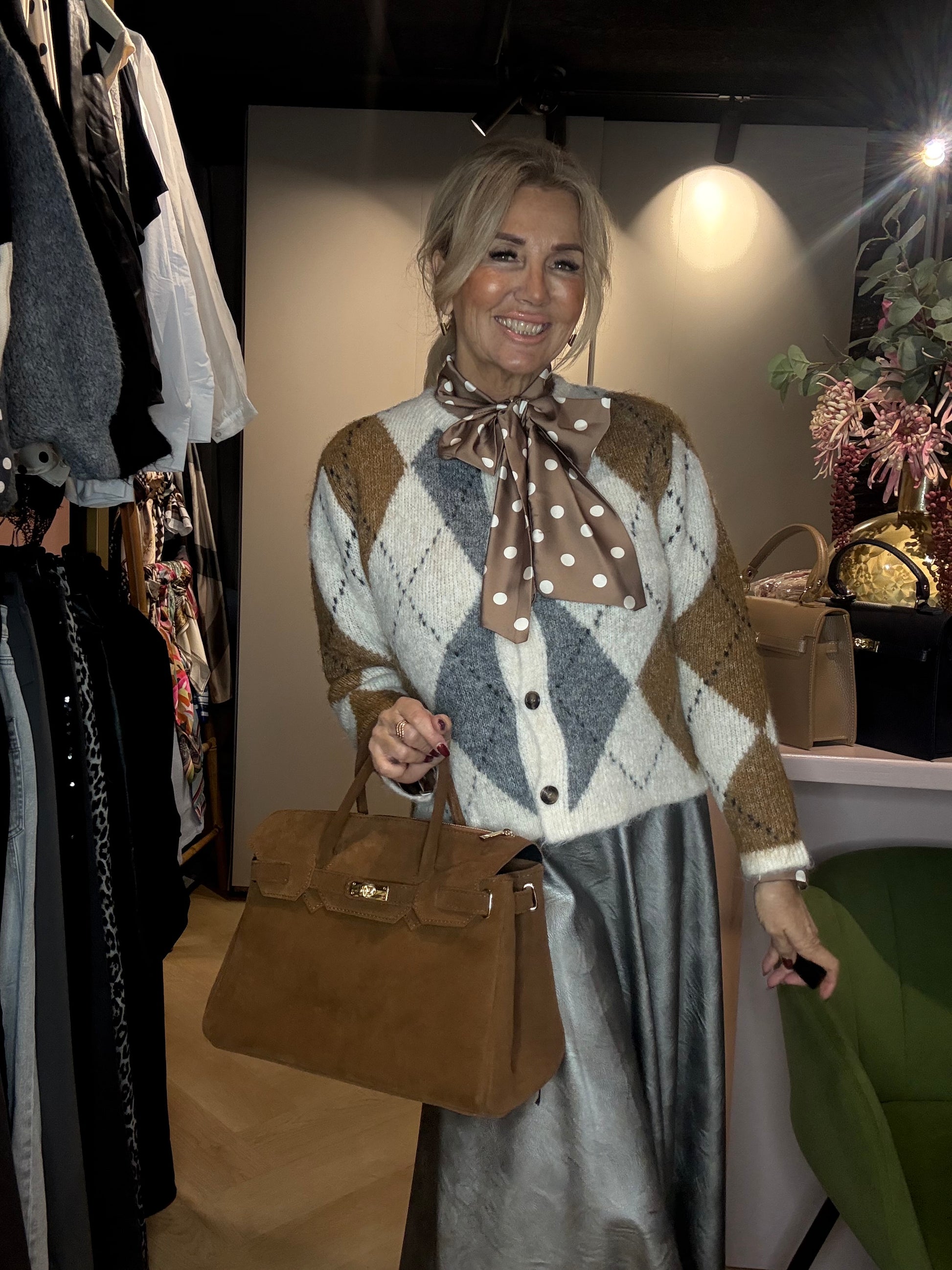 De rok is one size, draagbaar tot een ruime maat 44 en is een perfecte basis voor talloze combinaties. Wij hebben hem hier gecombineerd met het Wiebertjes vest in camel met cognac kleurige wieberpunten, een blouse met polka dot print en onze zandkleurige laars met queenie hakje — een combinatie die stijl, warmte en klasse uitstraalt. ✨