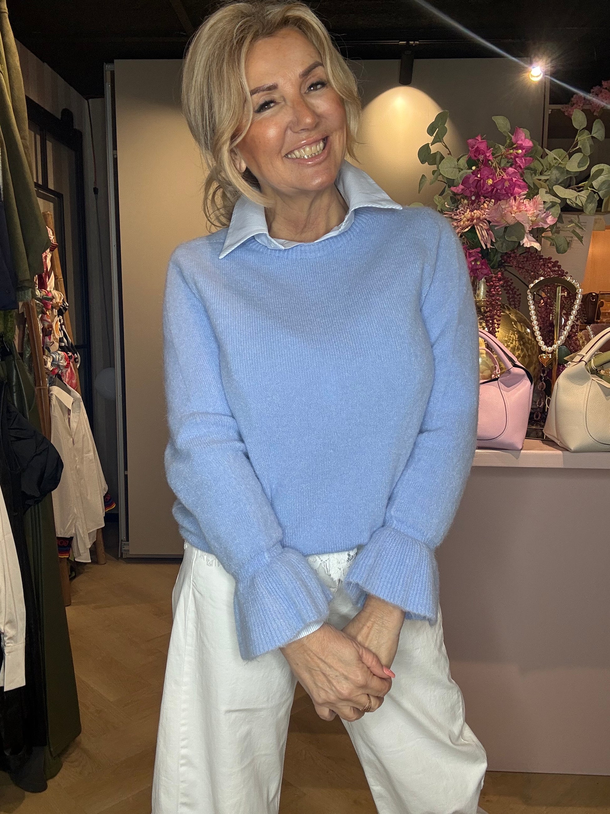 De elegante trompetmouwen geven de trui een vrouwelijke en speelse uitstraling. Het model valt soepel en luchtig en is ideaal om te combineren met een jeans of een nette broek. Wij dragen hem hier op een witte jeans, met daaronder een lichtblauw fijn gestreept blouseje voor een frisse voorjaarslook.