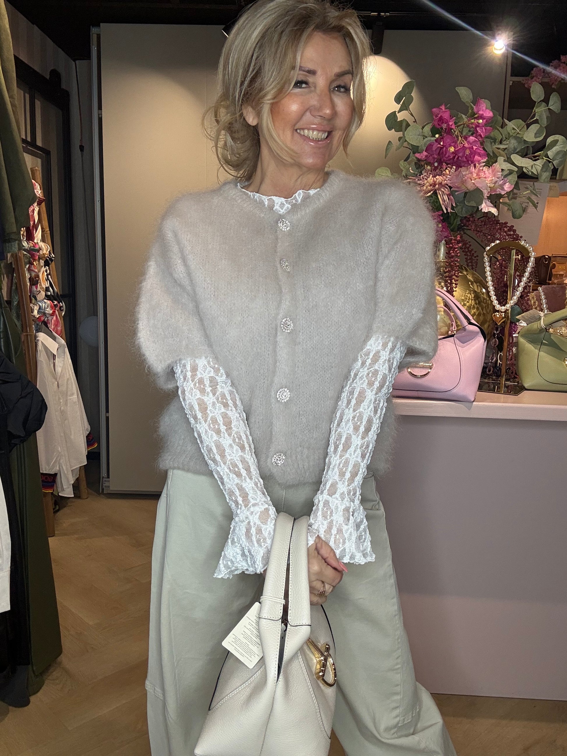 De top heeft lange mouwen met een subtiele trompetmanchet, wat zorgt voor een speels en verfijnd detail. Het kanten materiaal geeft een luxe look en draagt heerlijk comfortabel.