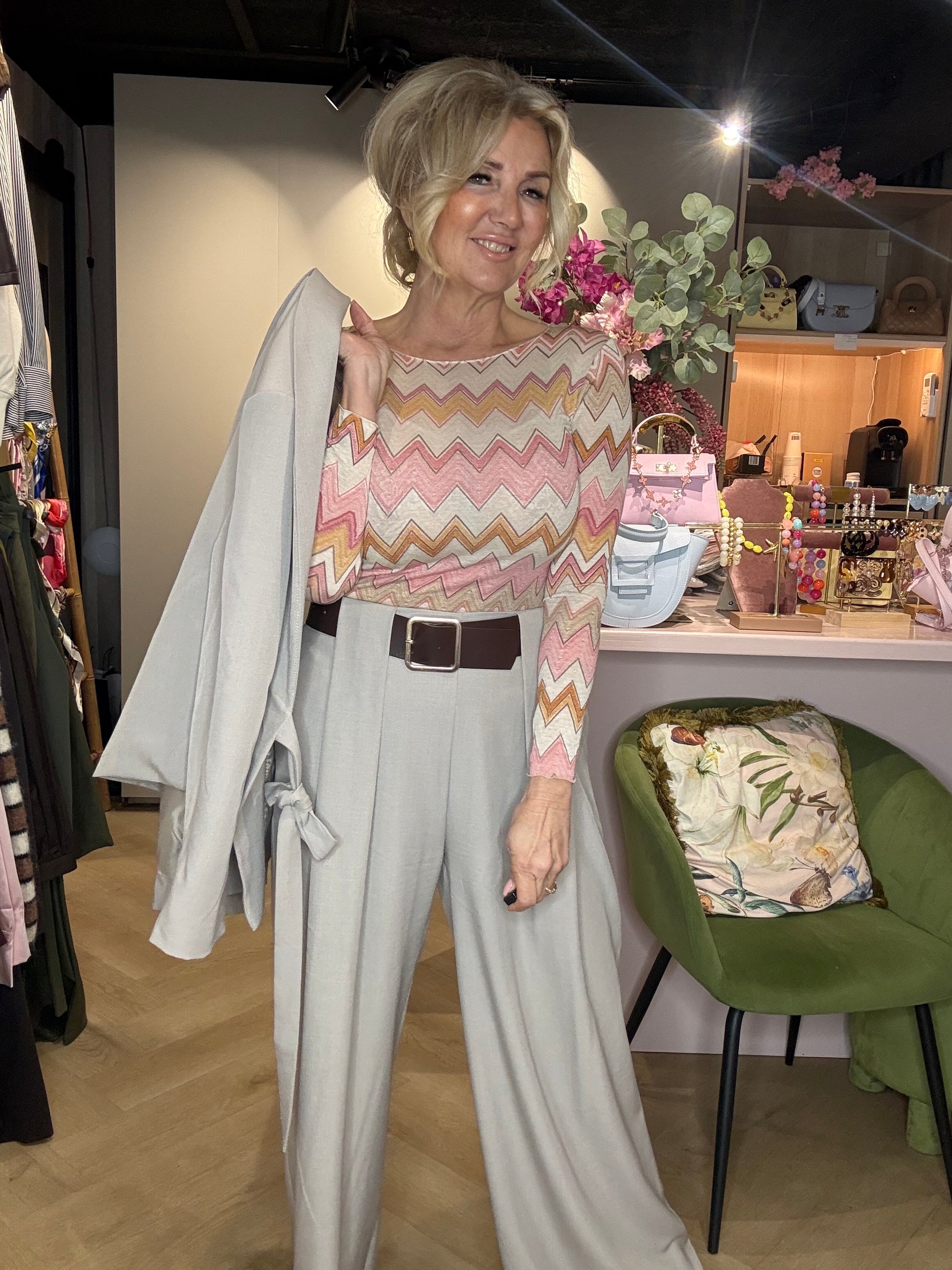 Wij hebben deze zigzagtop hier gecombineerd met een stijlvolle pantalon en een mooie riem, maar ook op een jeans of rok komt deze top prachtig tot zijn recht. Een echte eyecatcher die je outfit direct een modieuze en luxe uitstraling geeft.