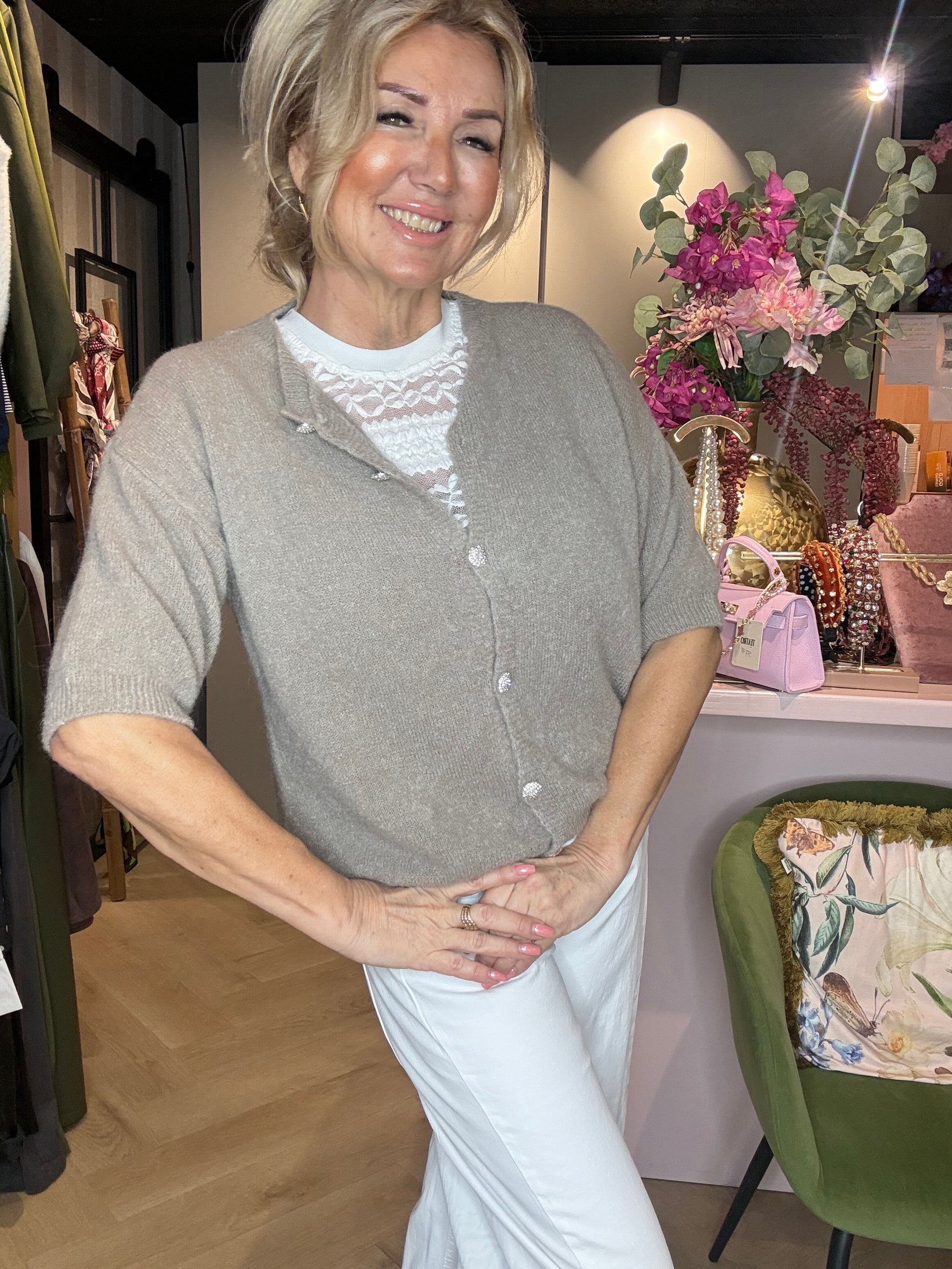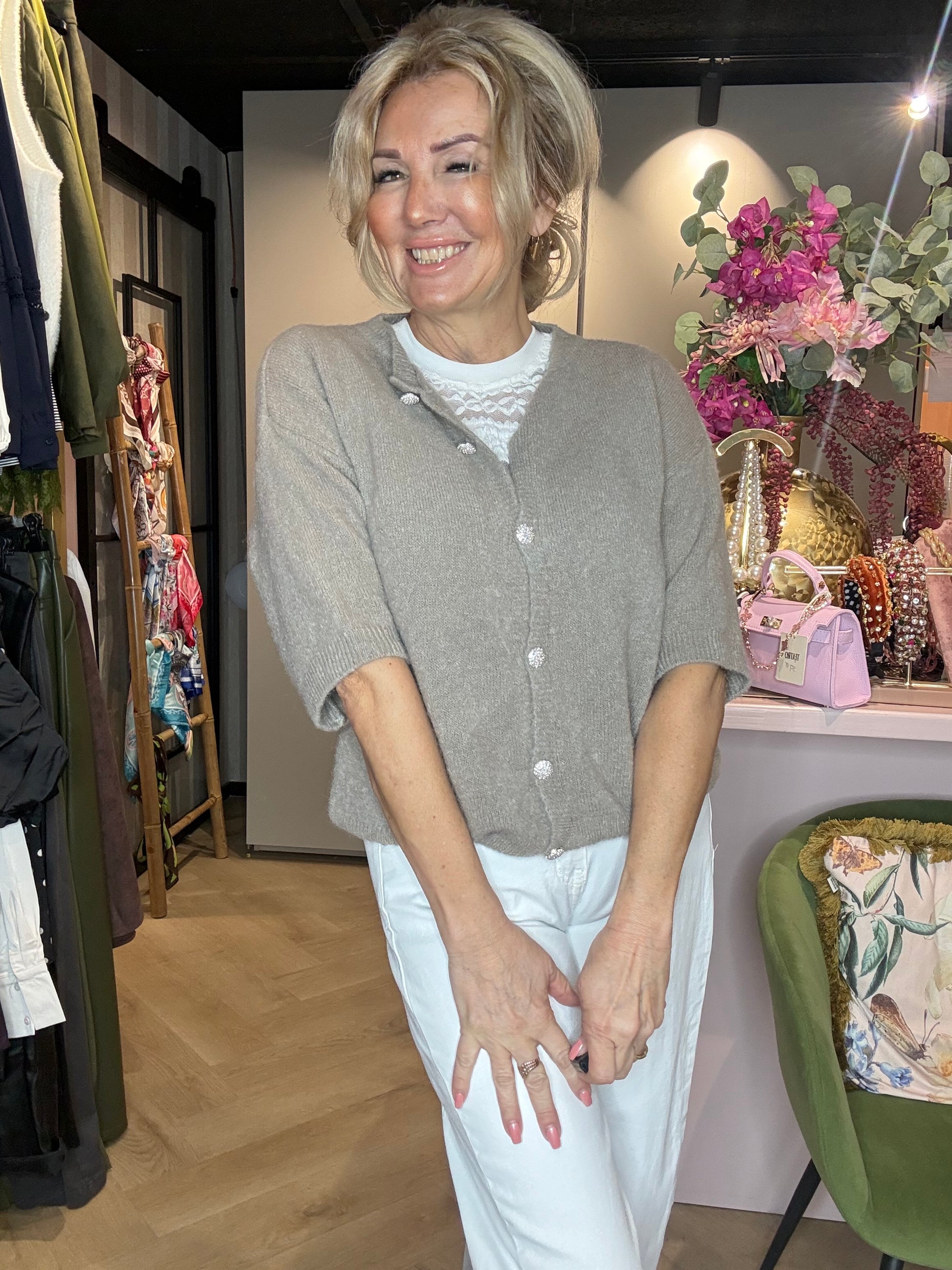 Dit prachtige taupekleurige baby-alpaca vestje is een echte blikvanger in je garderobe. De zachte, luxe stof voelt heerlijk licht aan en geeft je outfit meteen een warme, stijlvolle uitstraling. De korte mouw maakt het vestje perfect voor het hele jaar door: mooi over een blouse, top of jurk. De sluiting met de schitterende bloemetjes strasknopen zorgt voor een elegante en vrouwelijke finishing touch.