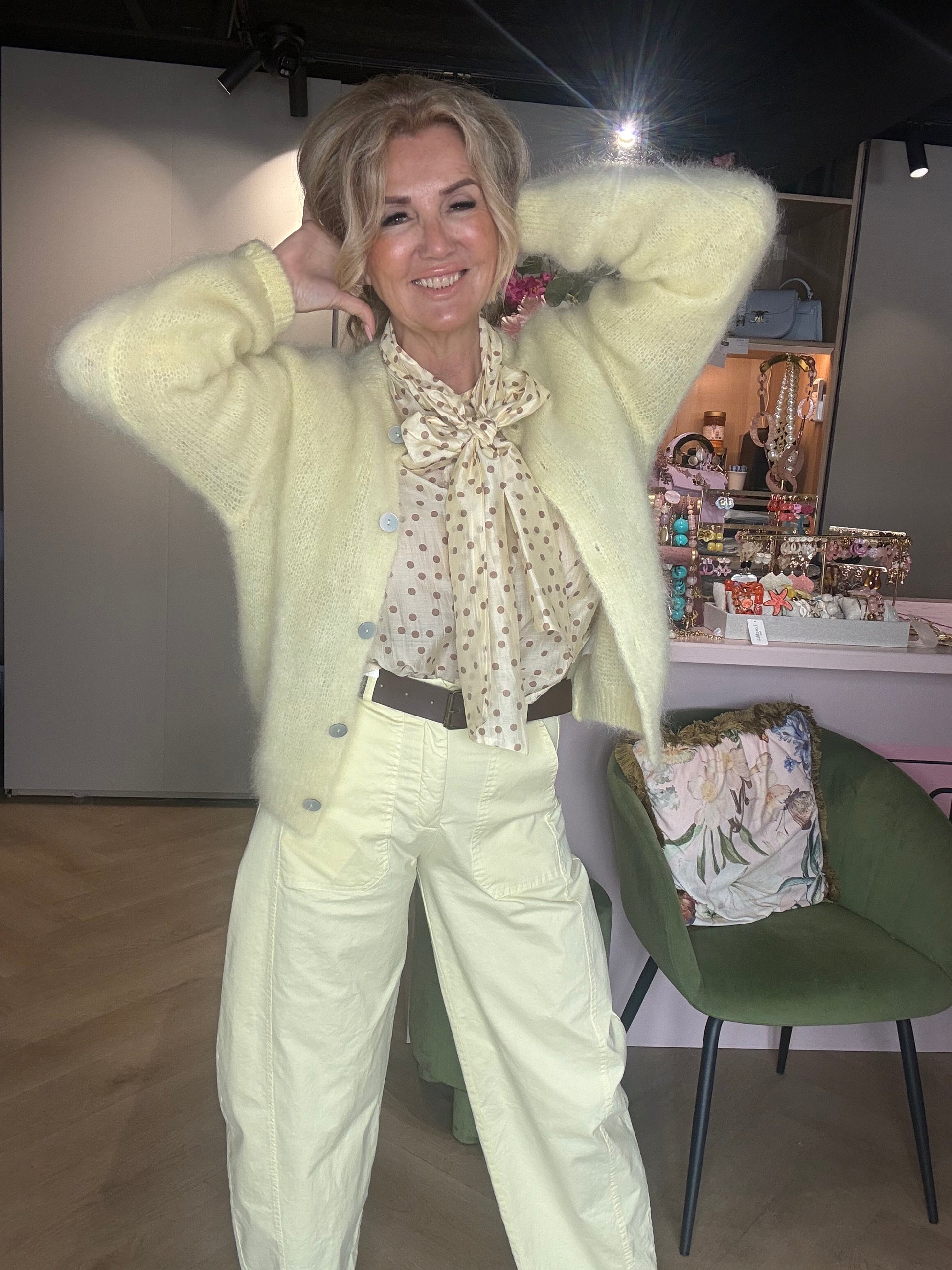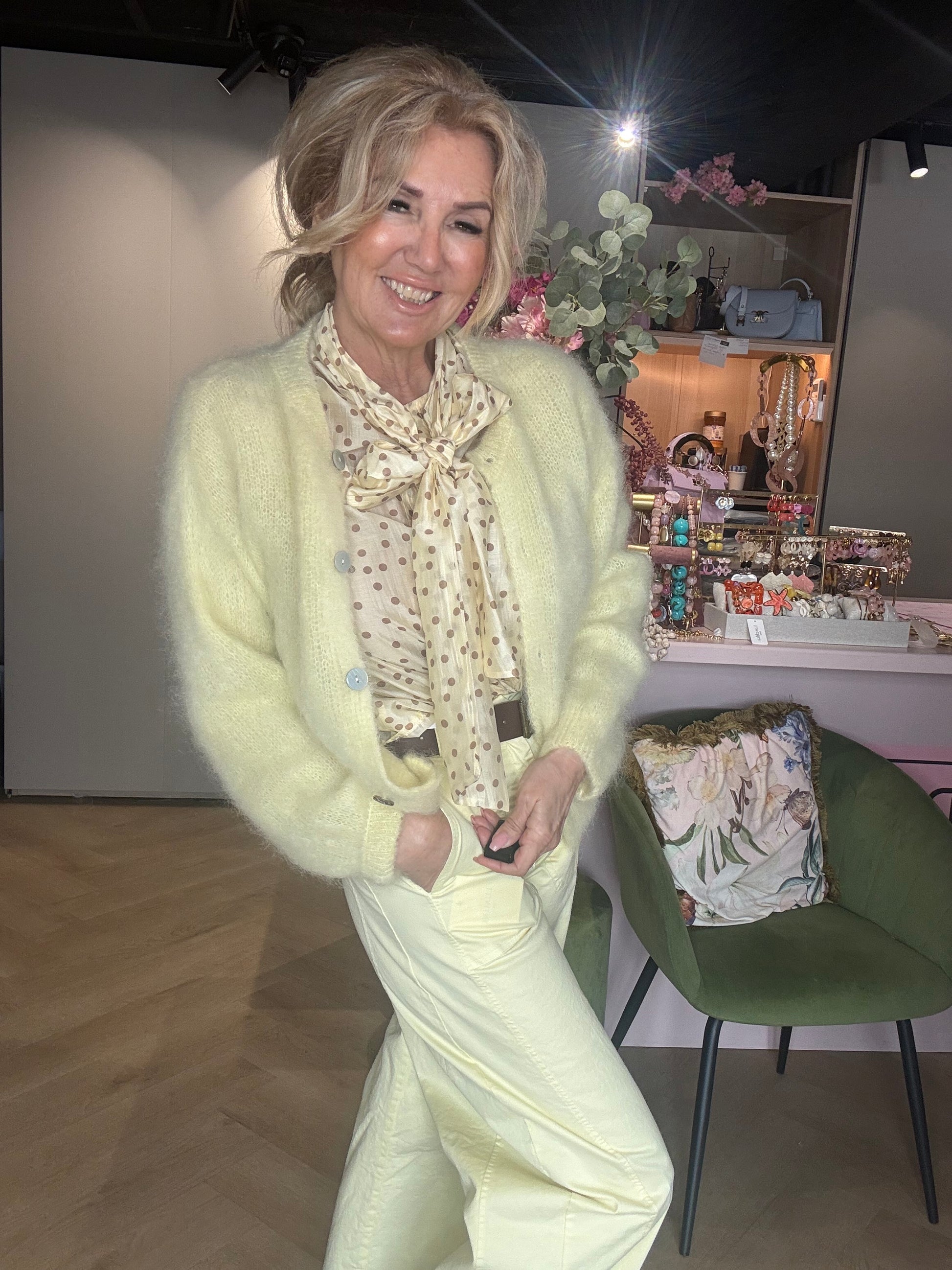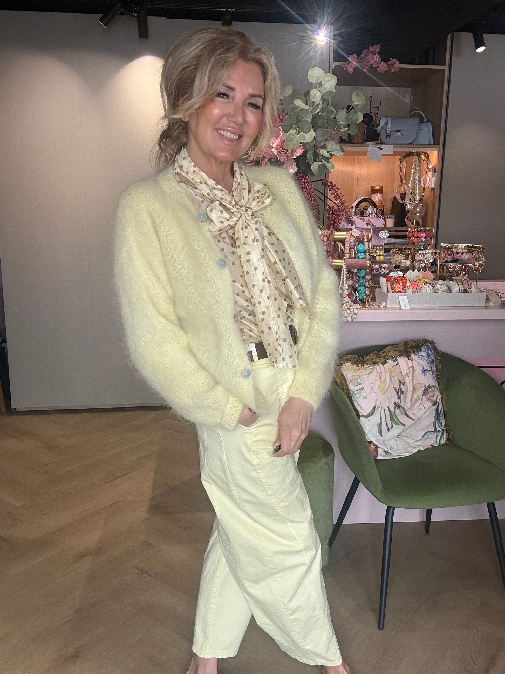 Wij hebben hem hier gecombineerd met het butter yellow ballonbroekje, het bruine gevlochten ballerinaschoentje en het mohair vest in butter yellow voor een stijlvolle, zachte en ton-sur-ton look ✨