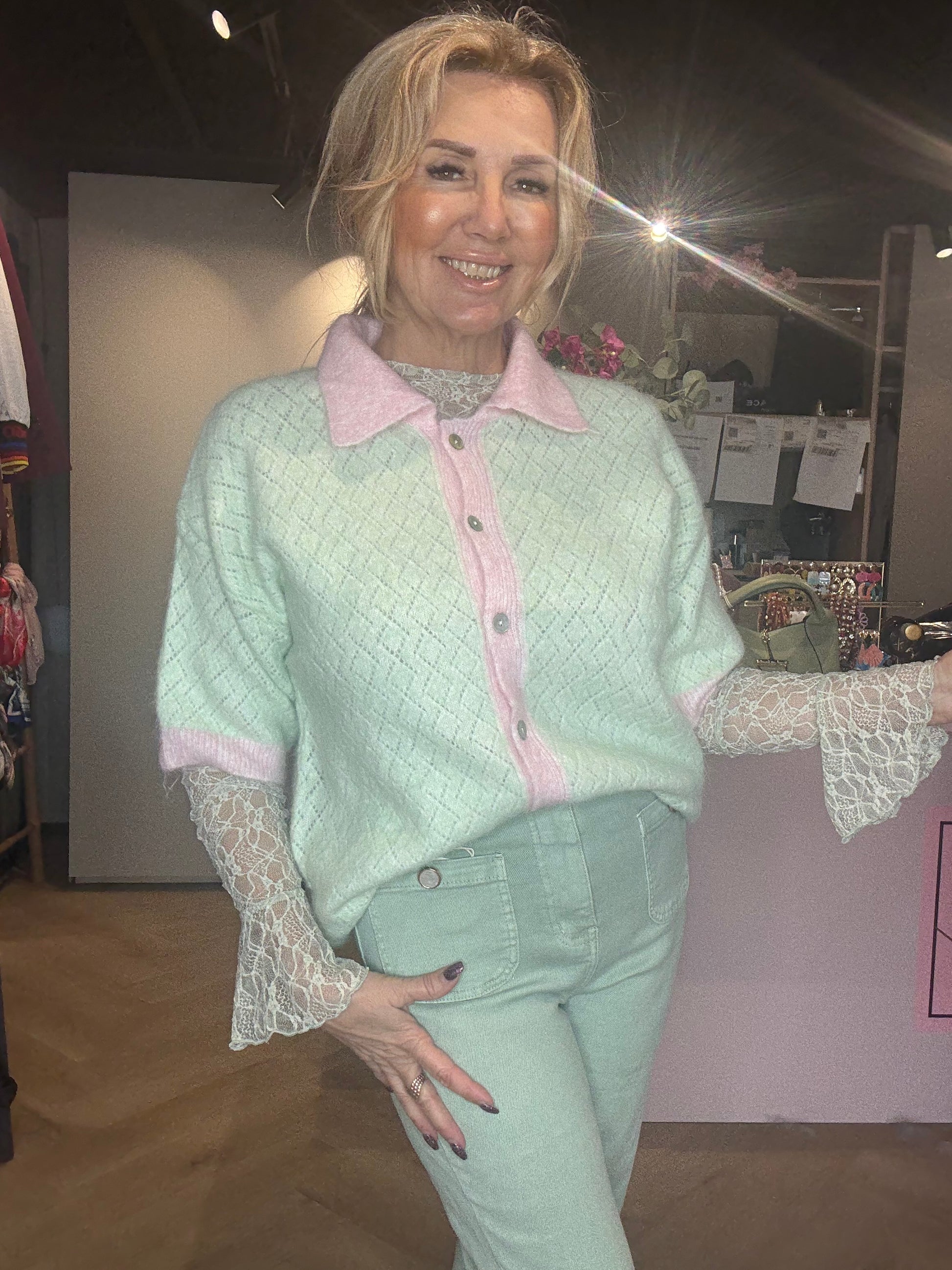 Dit prachtige ajour gebreide vestje is een echte eyecatcher voor het nieuwe seizoen. De opengewerkte structuur geeft het vestje een luchtige uitstraling, terwijl de mintgroene basis prachtig wordt afgewerkt met zachtroze details. Het lieve kraagje, de bies langs de knoopsluiting én het subtiele randje aan de korte mouwen maken dit vestje helemaal af 🌸