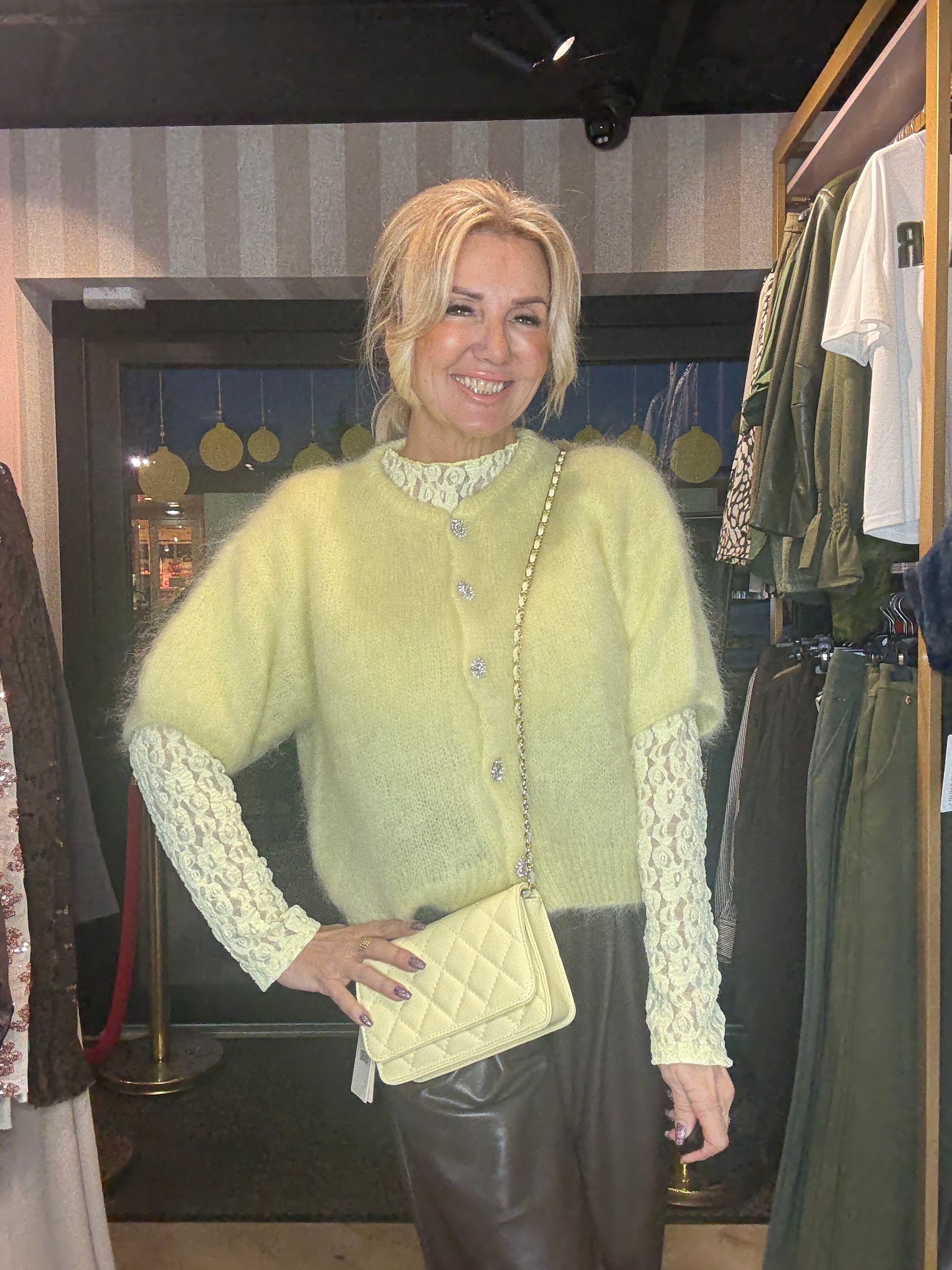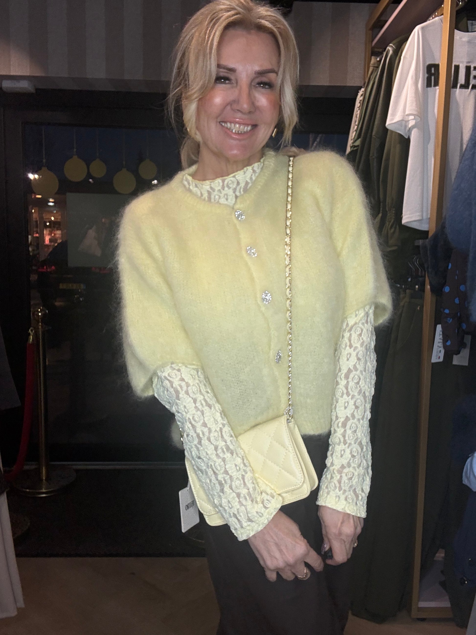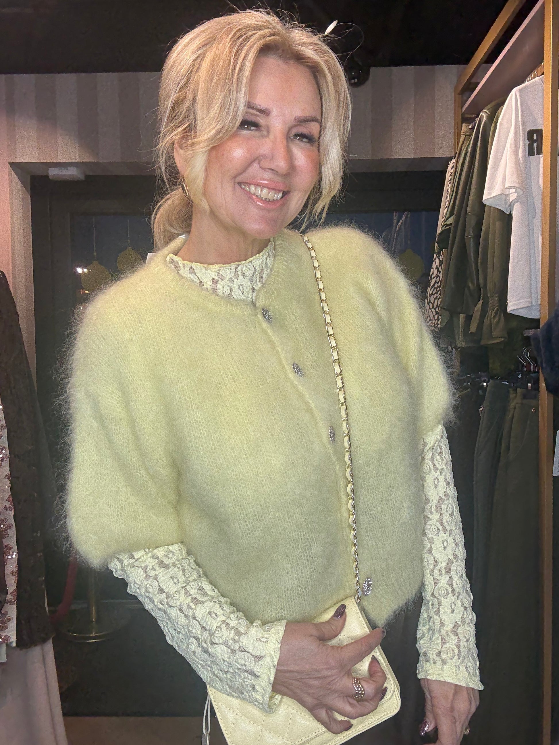 Dit zachte mohair vestje in zachtgeel is er één waar je instant blij van wordt. Een frisse, lichte tint die perfect past bij het voorjaar en moeiteloos doorloopt richting de zomer. De kleur straalt zachtheid en luxe uit en geeft elke outfit een zonnige, elegante touch ☀️