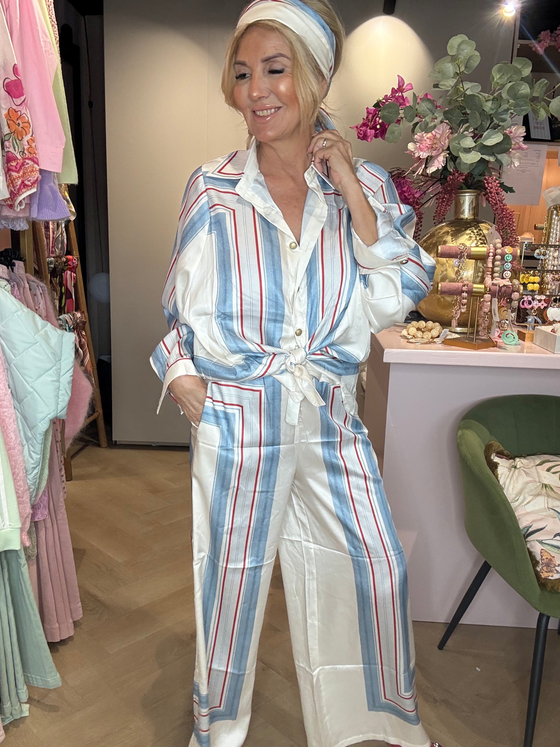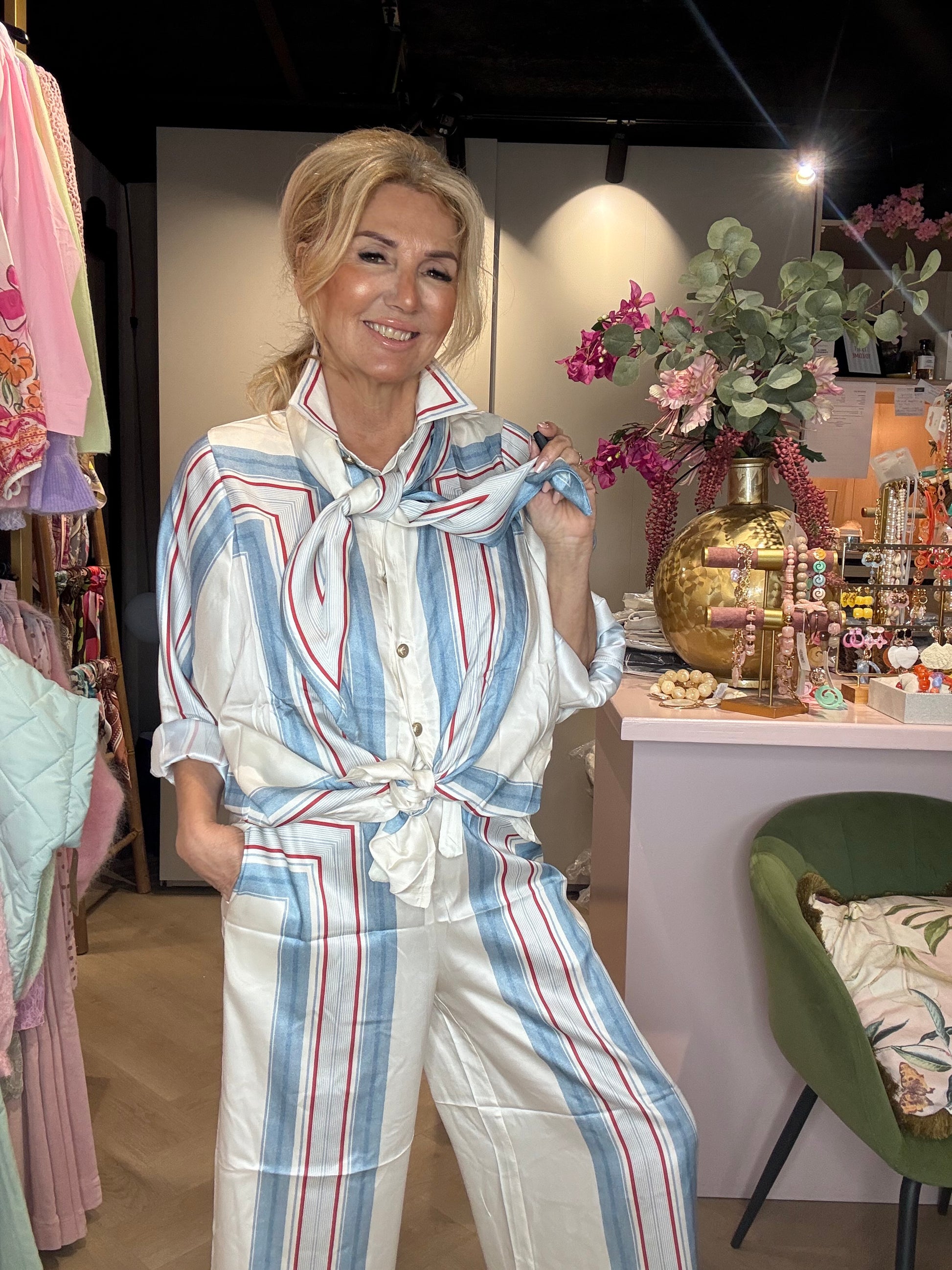 De set bestaat uit een elegante blouse en een straight leg broek. De broek heeft een mooie satijnen strik in de taille, waarmee je hem perfect naar wens kunt verstellen – losjes voor een relaxte look of iets strakker voor een mooi silhouet. De blouse kun je speels knopen zoals op de foto, maar ook los dragen voor een nonchalante, stijlvolle vibe.