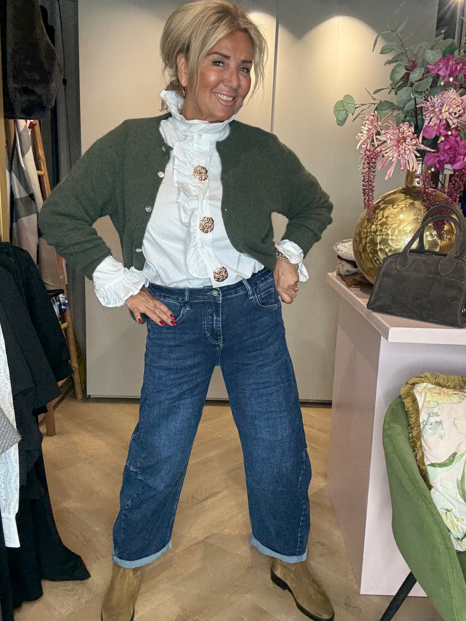We hebben deze prachtige jeans gecombineerd met een witte blouse en het groene Baby Alpaca vestje — een stijlvolle combinatie van klassiek, vrouwelijk en comfortabel. Het model op de foto is 1,65 m lang en draagt normaal maat 38/40; op de foto draagt ze de maat M van de Barrel Jeans.