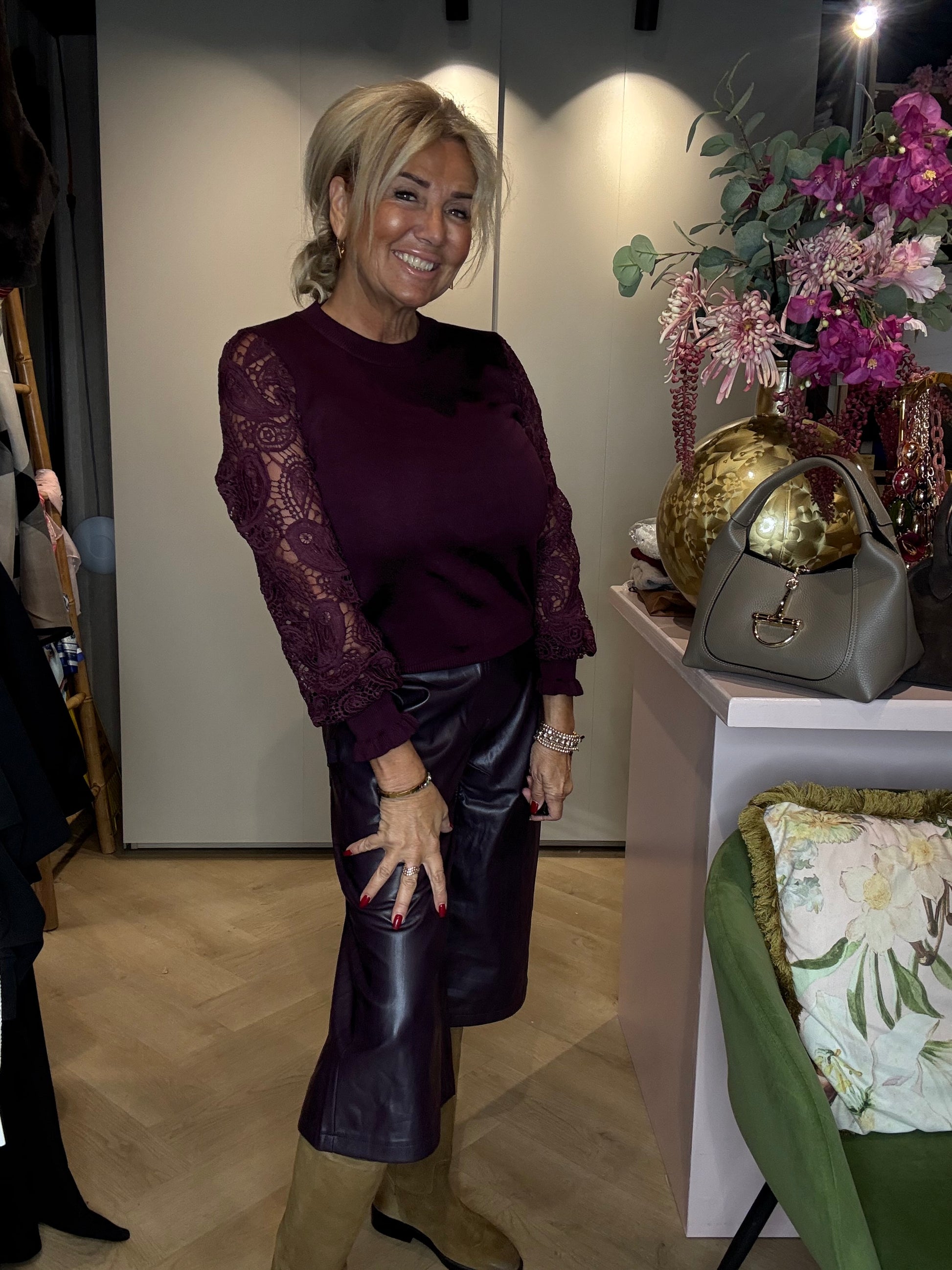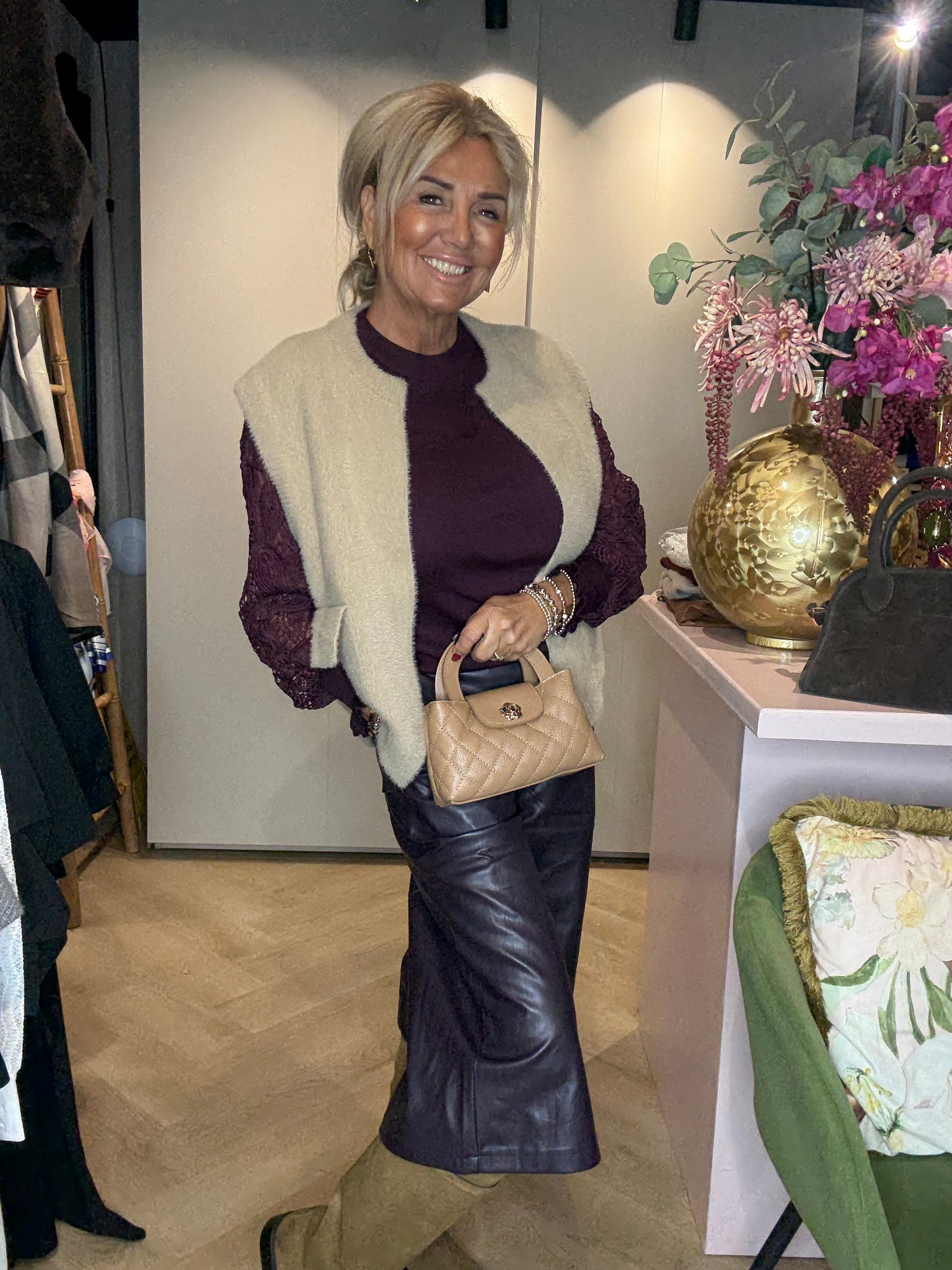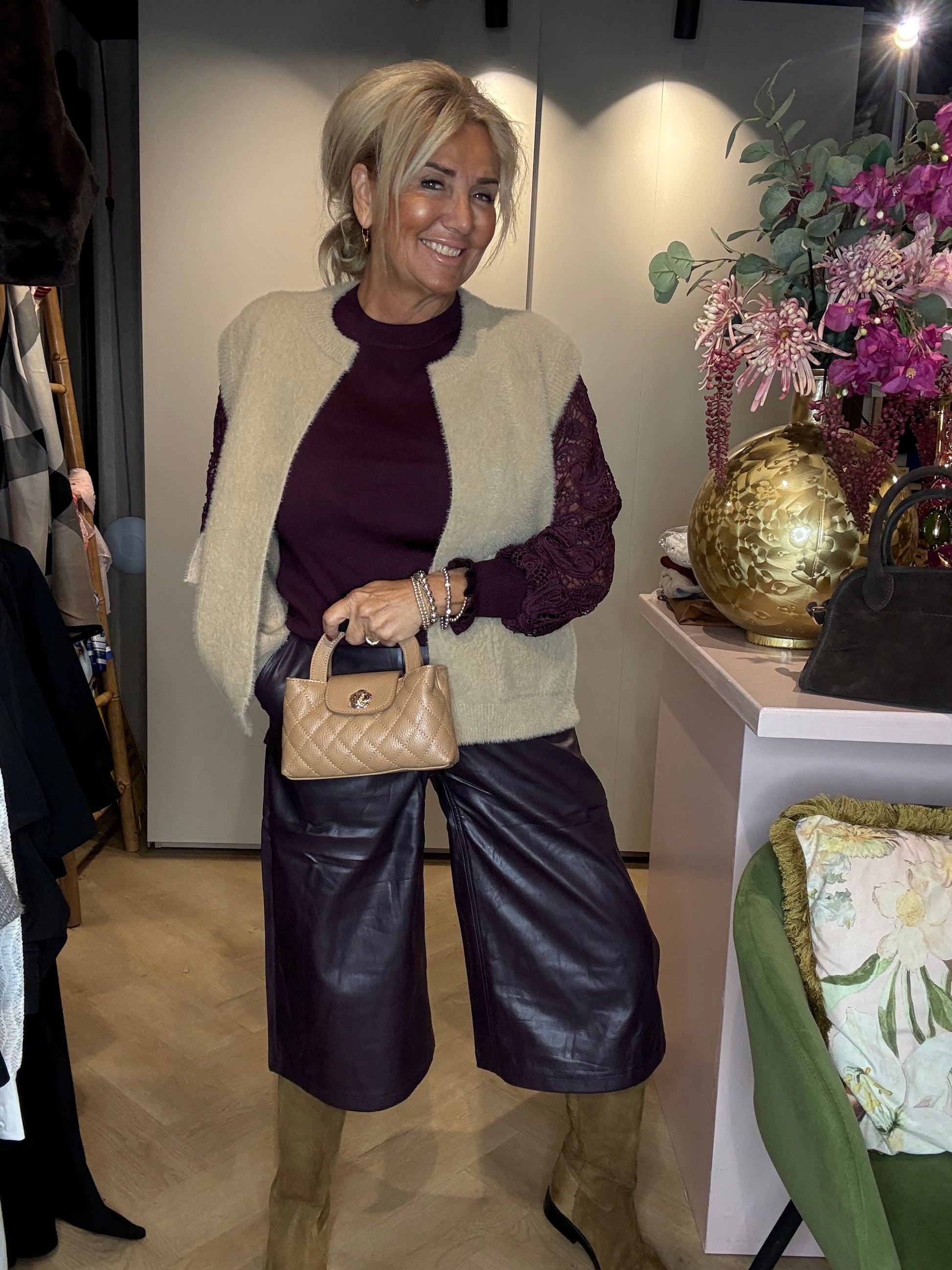 We hebben deze Bermuda gecombineerd met de Nightwear Knit in Wine Purple – voor een ton-sur-ton look met klasse – én met het fluffy chilet van Triple Nine in crème voor een speels en warm contrast. Een combinatie die perfect balanceert tussen stoer en vrouwelijk.