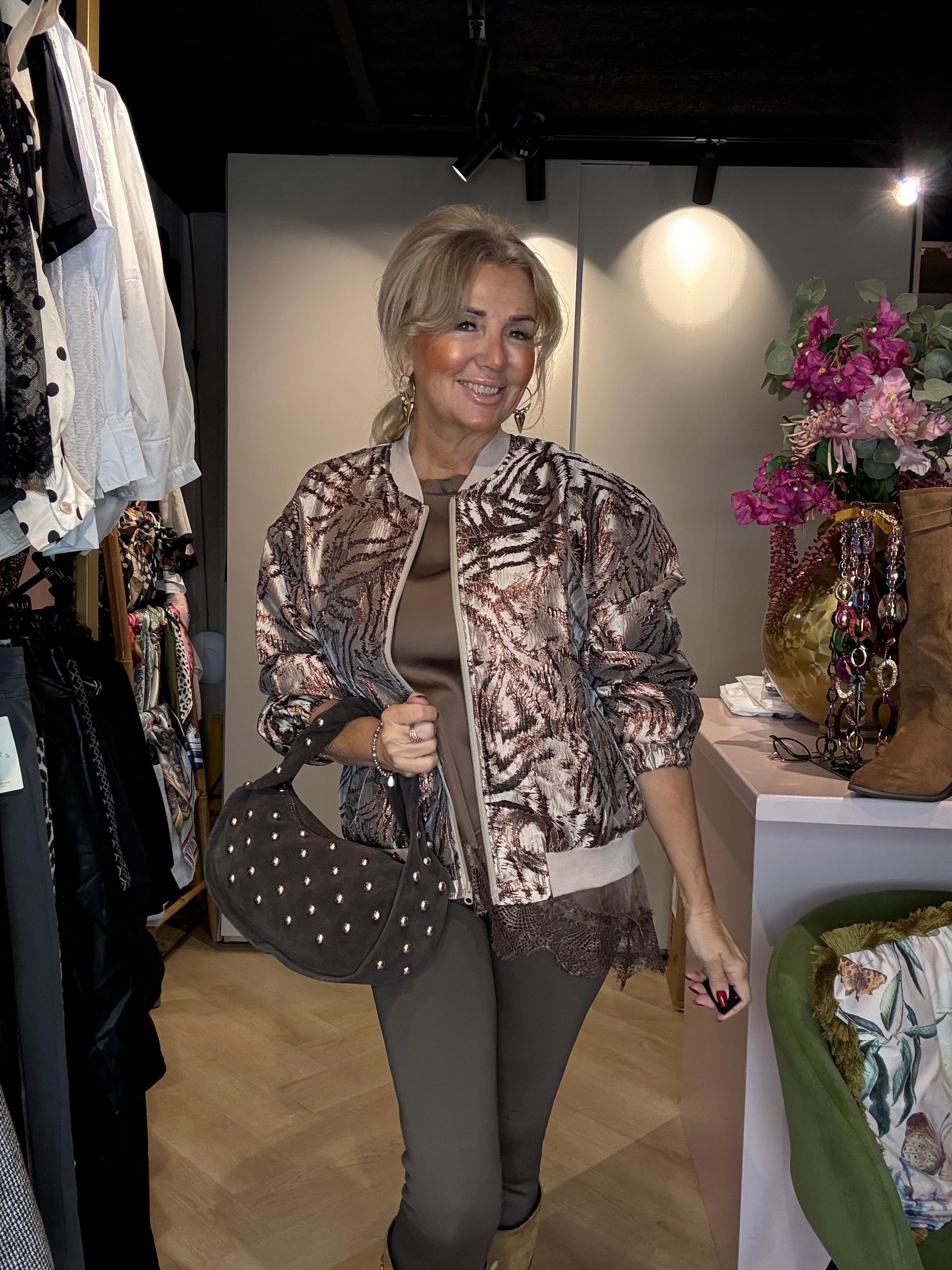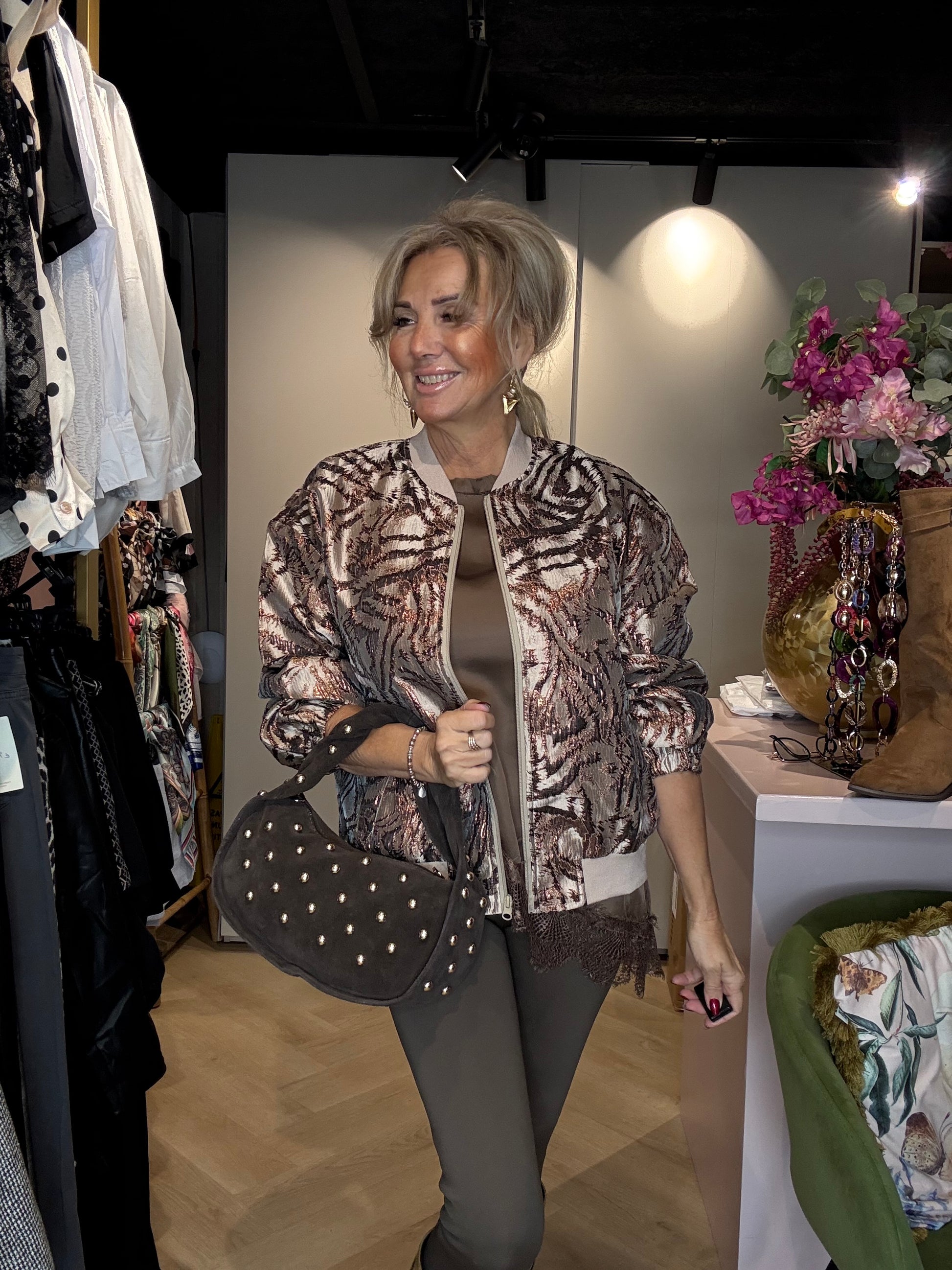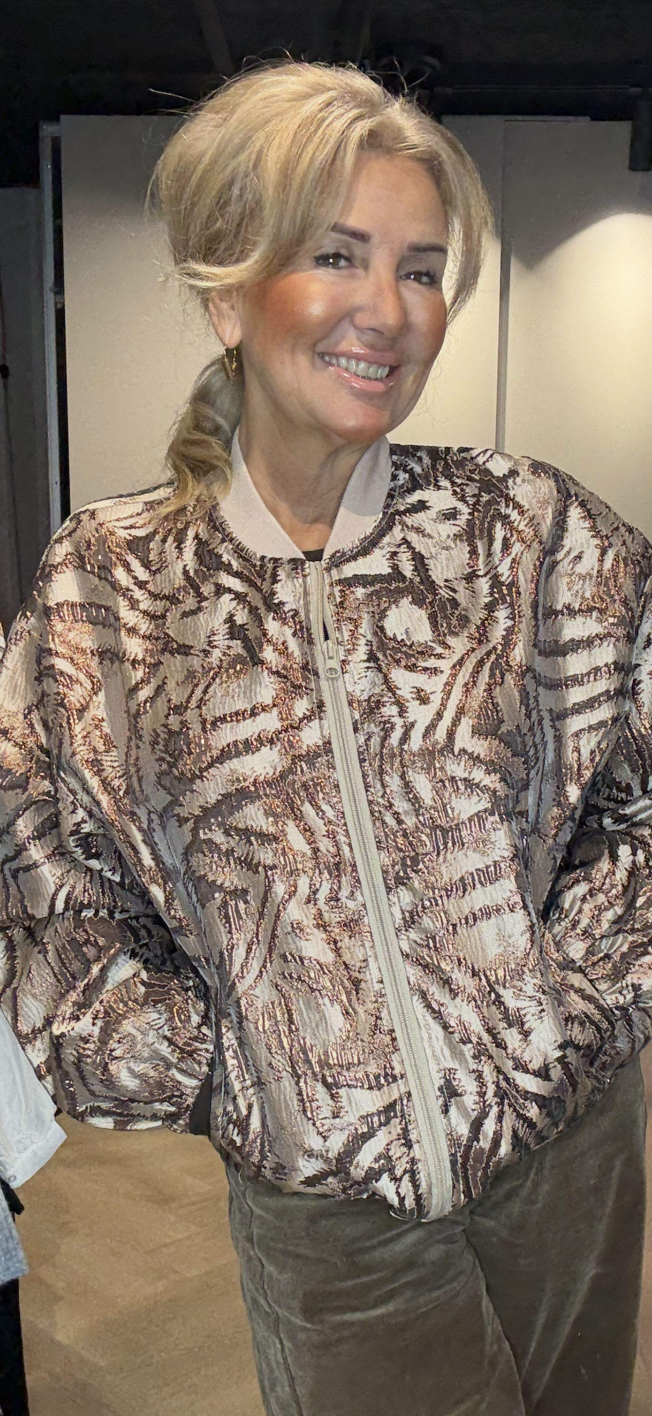 Deze bronzen luxe bomber is een echte showstopper! De subtiele metallic glans, prachtige jacquard-look structuur en verfijnde afwerking maken dit jasje een stijlvolle eyecatcher voor iedere outfit.