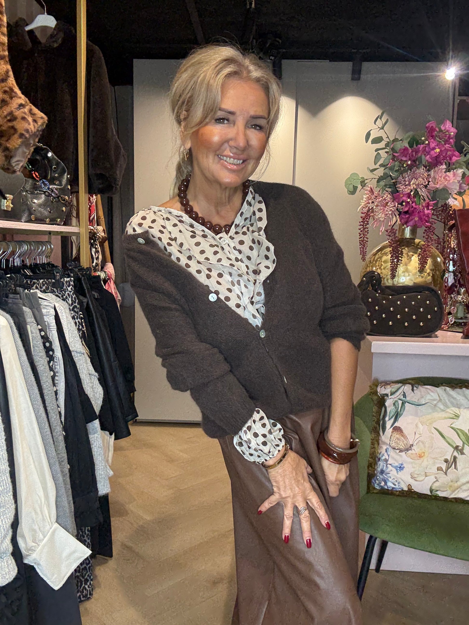 Deze prachtige rok in diep donkerbruin is een echte eyecatcher in jouw herfstcollectie 🍂. Gemaakt van soepel vallend PUH-leder met elegante plooien aan de voorkant en praktische steekzakken. De rok heeft een lange lengte die je eenvoudig zelf korter maakt — gewoon afknippen op de gewenste maat, want PUH-leder rafelt niet.