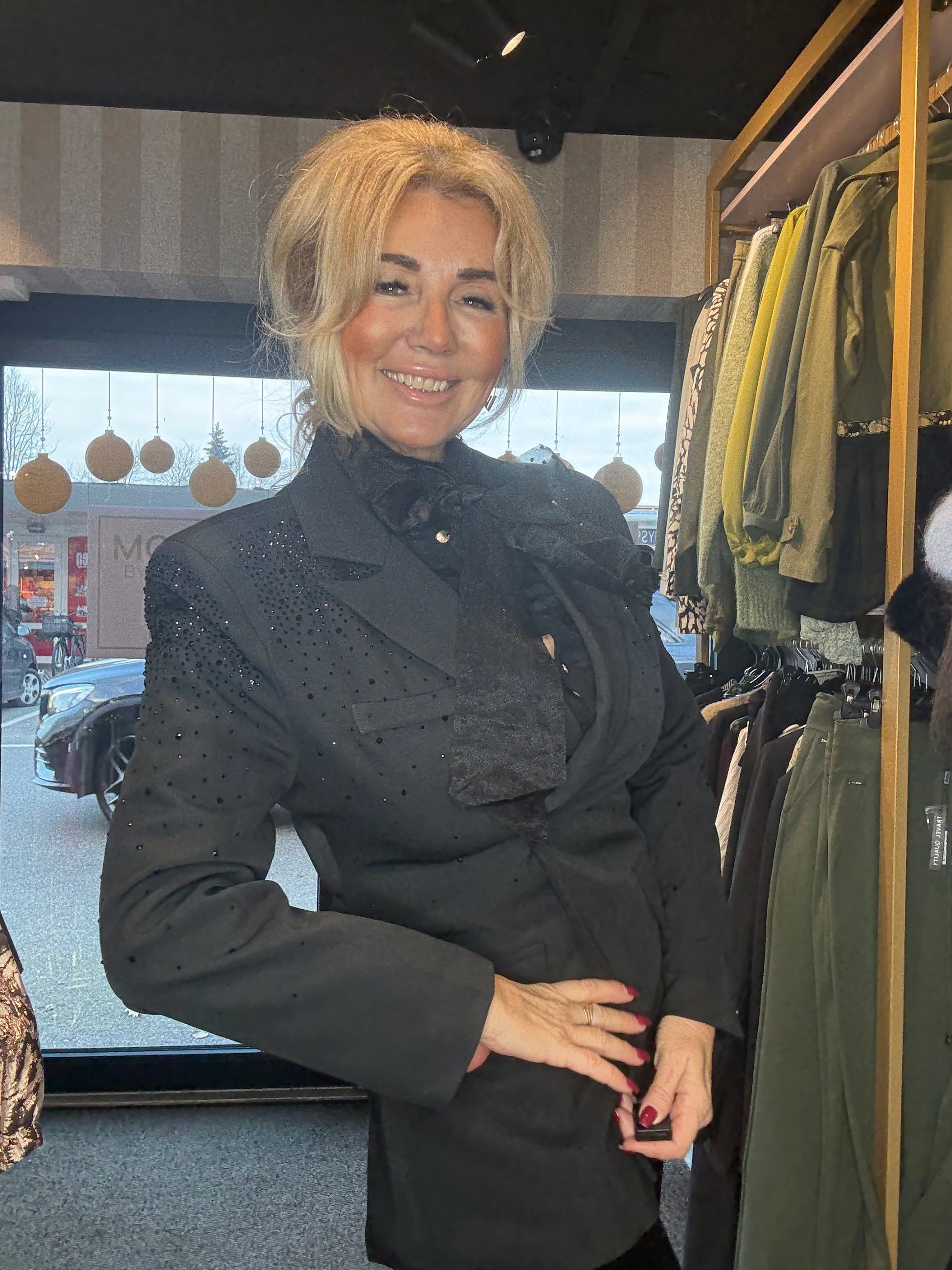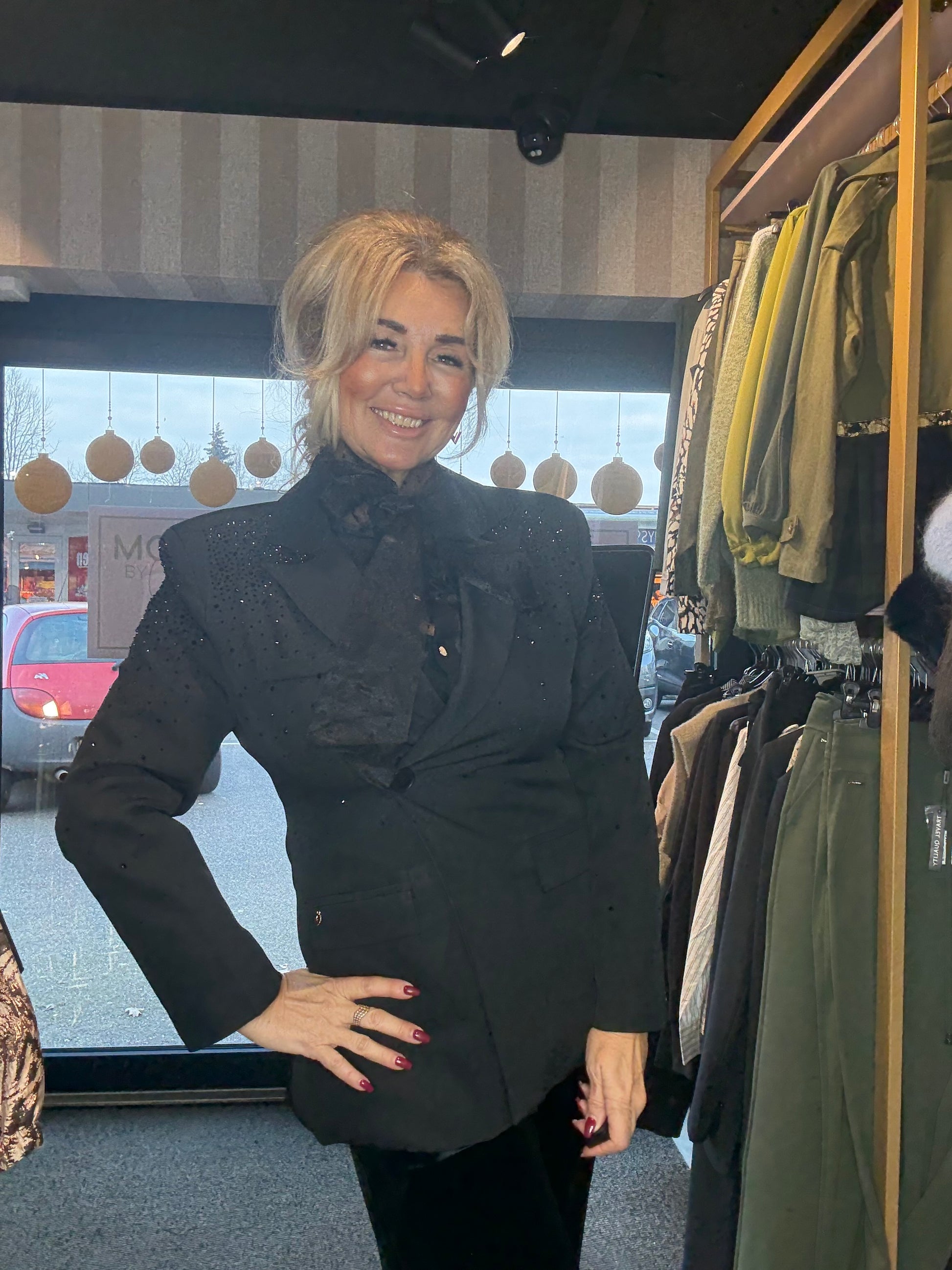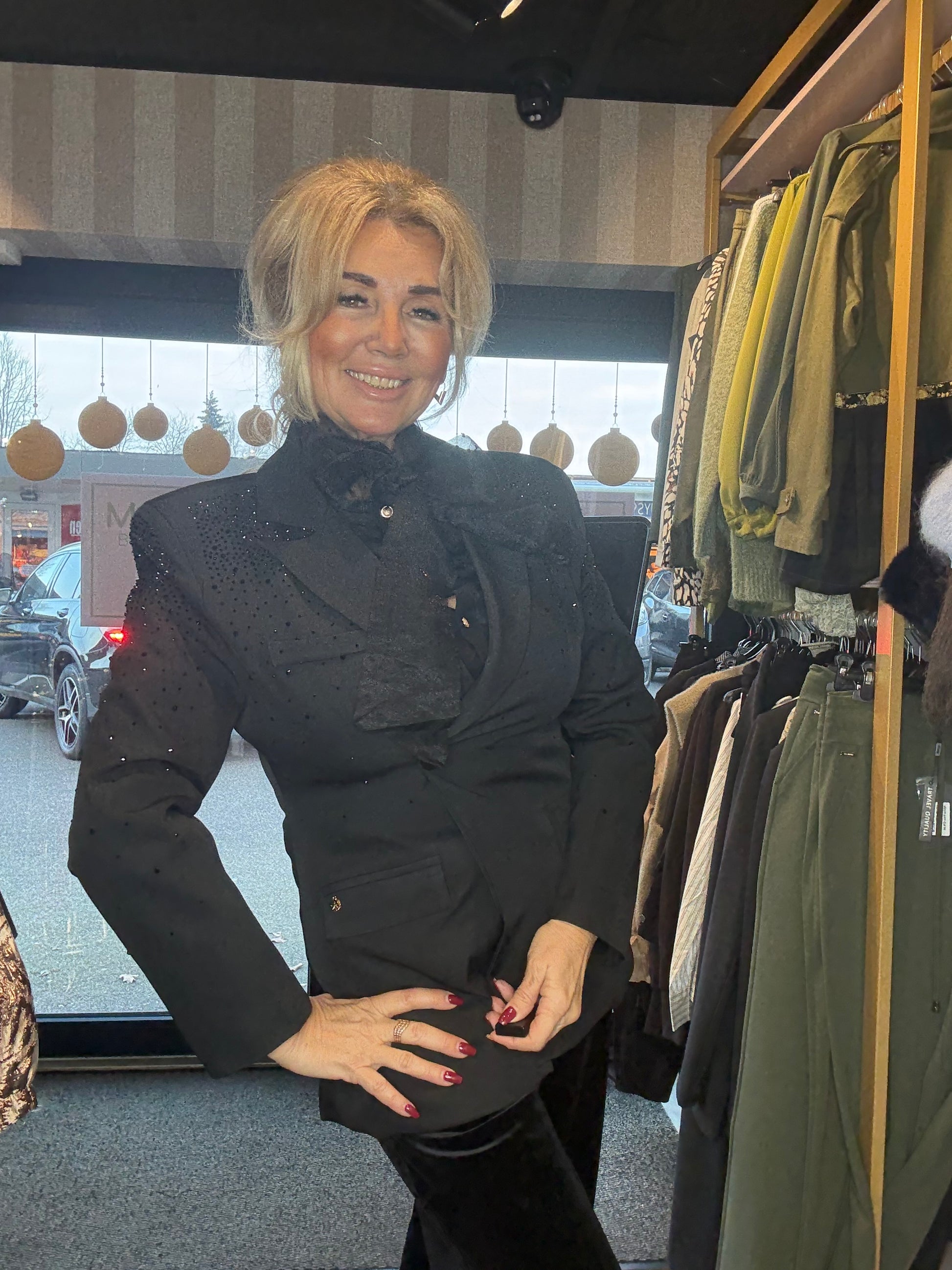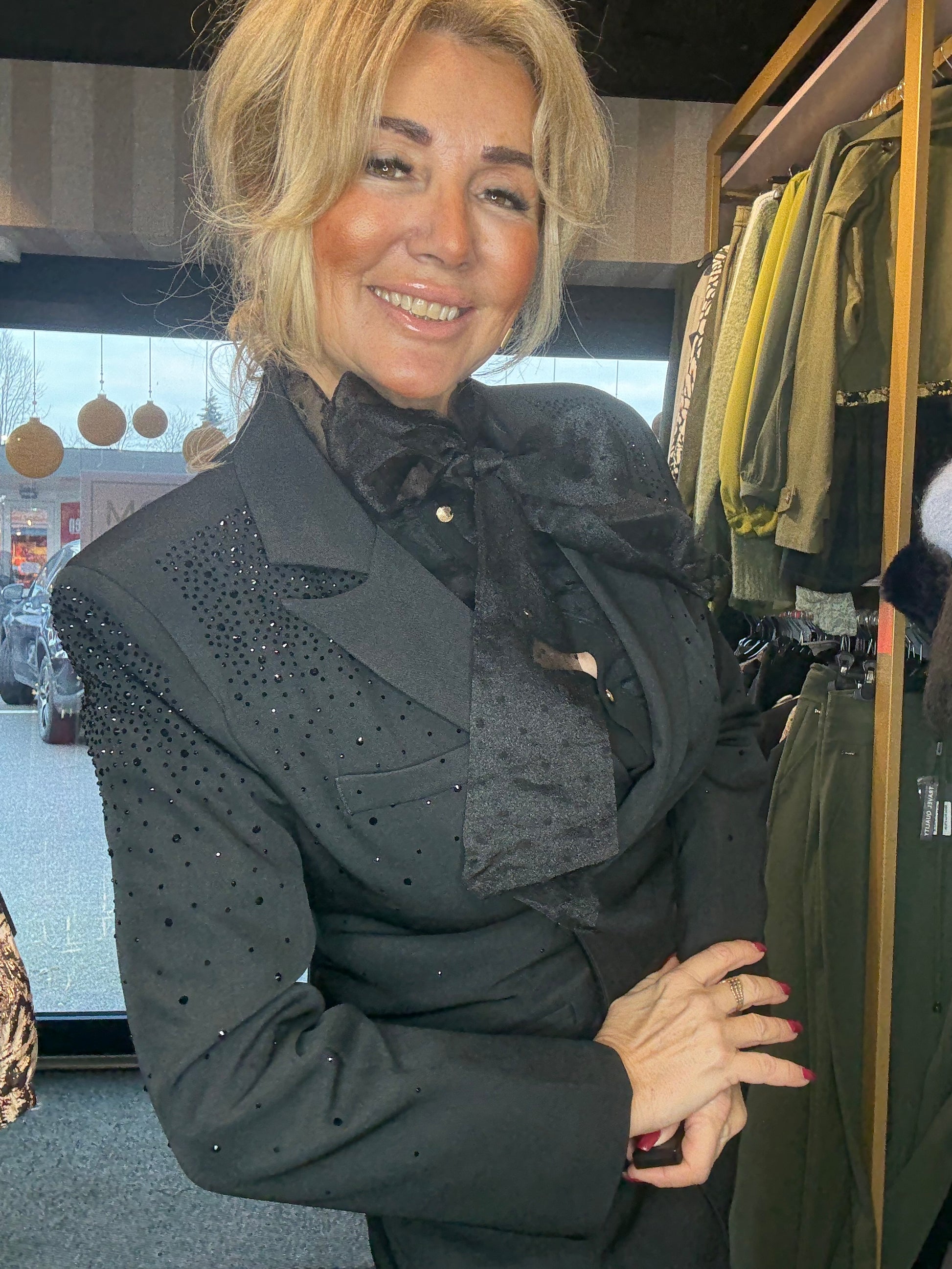 De absolute eyecatcher zit in de schouderpartij: deze is subtiel versierd met hele kleine, verfijnde zwarte steentjes all over, wat het colbert een chique en luxe uitstraling geeft zonder te overheersen. Echt zo’n item waar je meteen verliefd op wordt — wij in ieder geval wel 💫