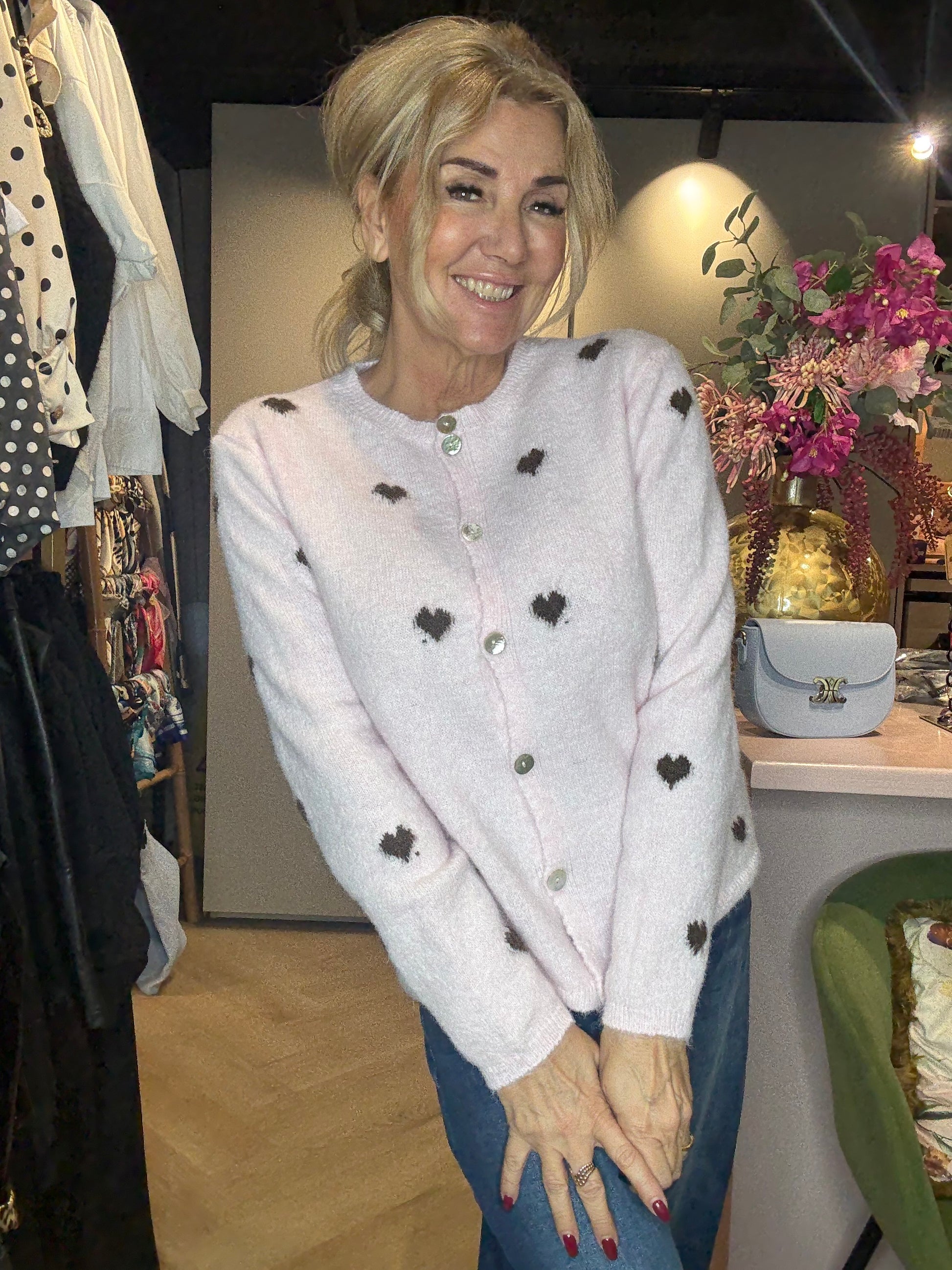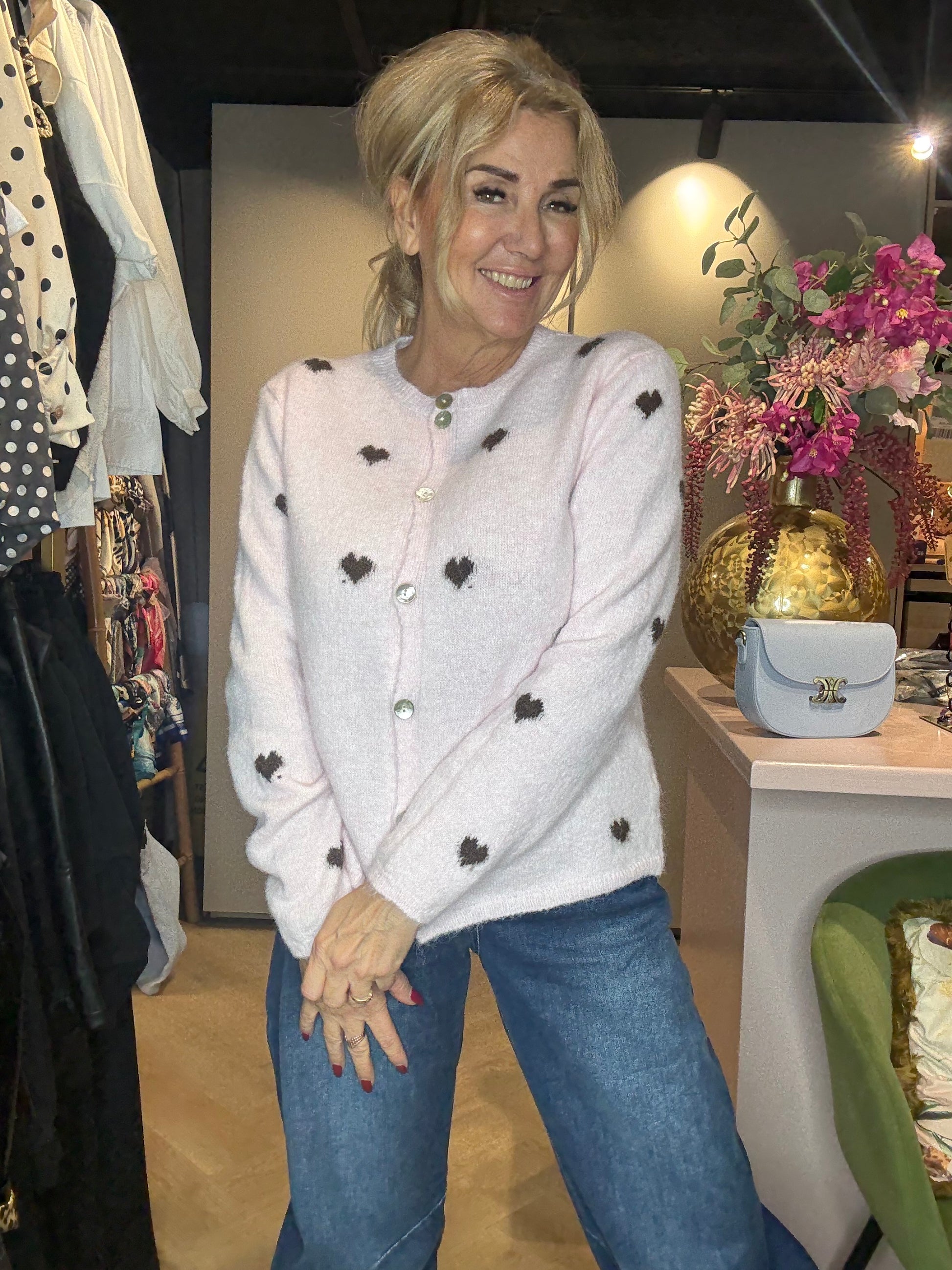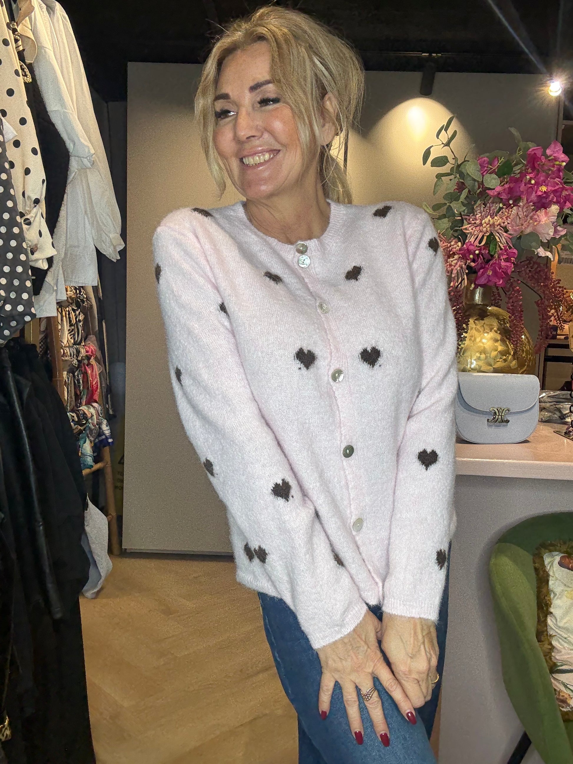 Hoe schattig is dit vestje! Een hele lichtroze beauty, ingebreid met donkerbruine hartjes, waardoor hij een speelse én romantische uitstraling krijgt. Het vestje voelt heerlijk zacht aan, valt mooi recht en is ideaal voor zowel casual als chique outfits.