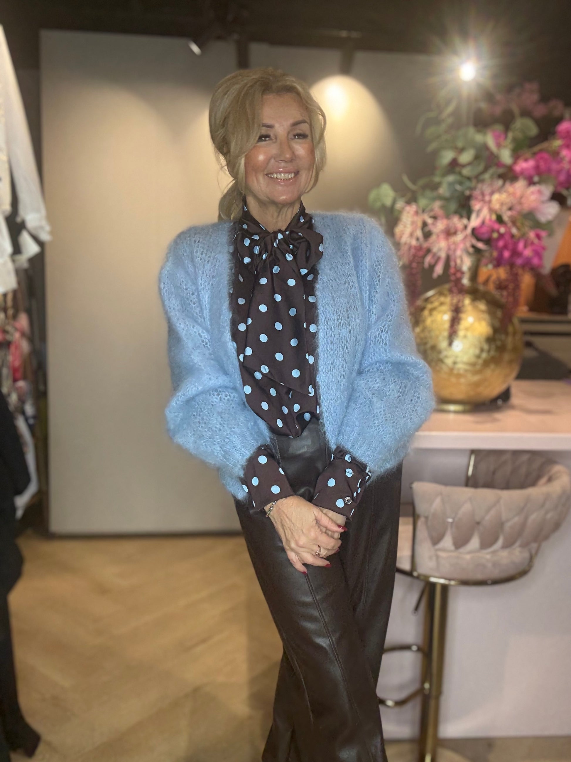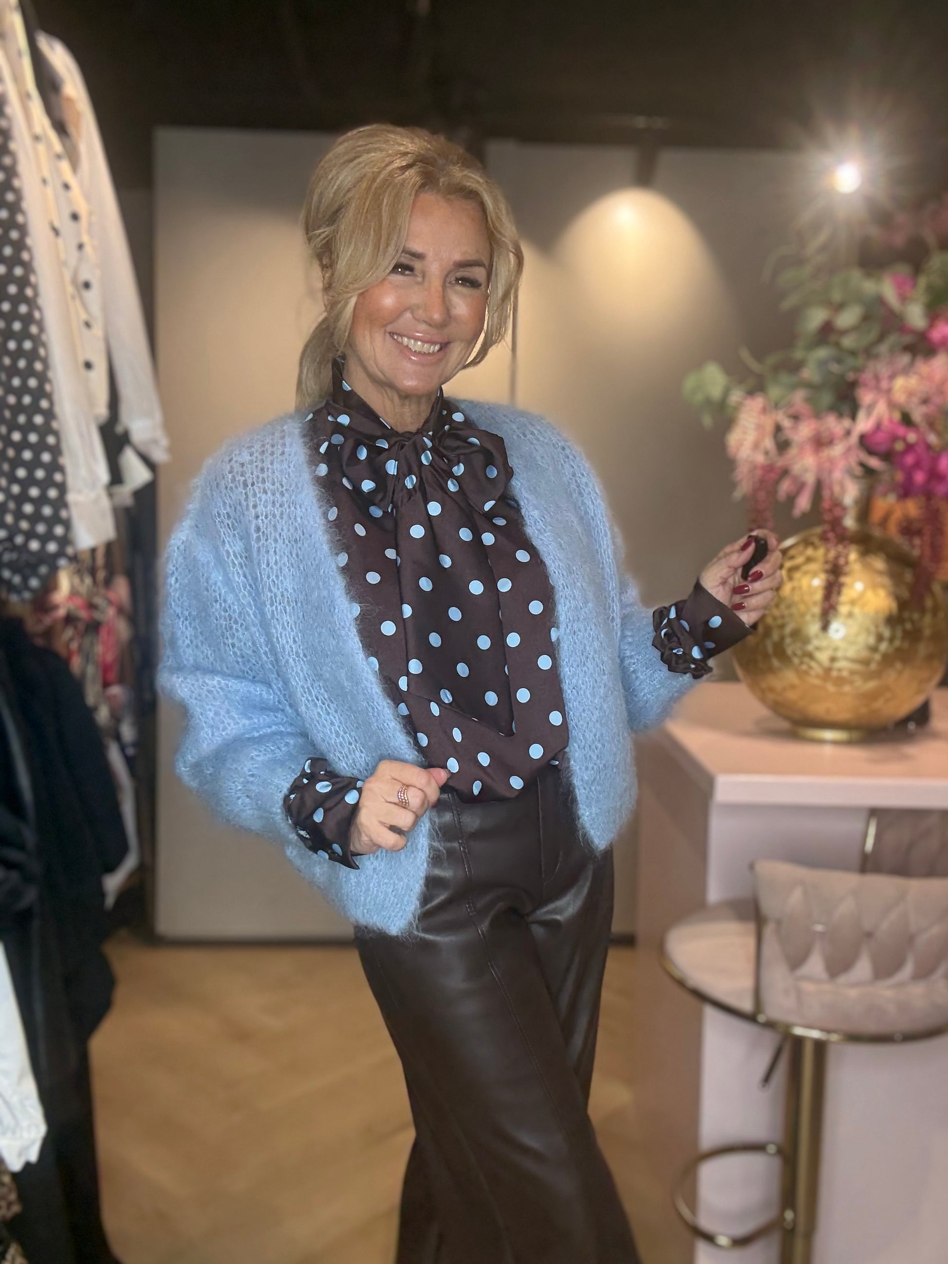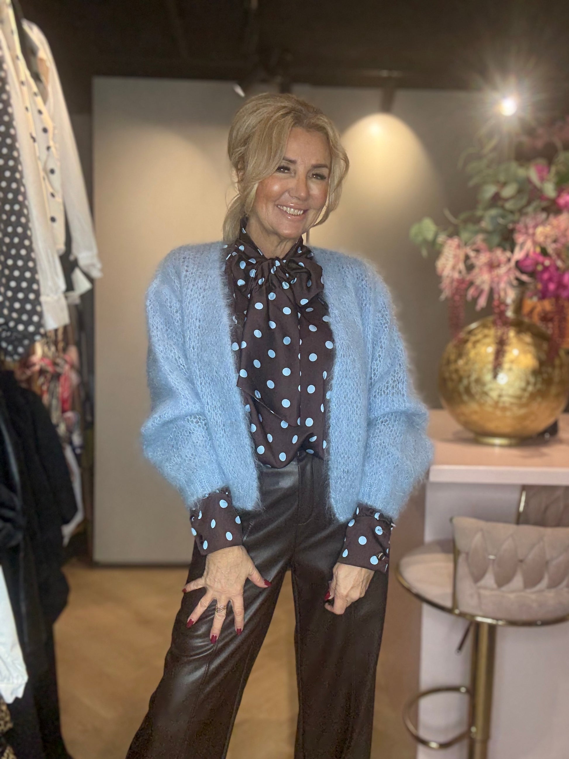 Het model valt mooi open, heeft een elegante pasvorm en combineert werkelijk overal mee. Hier hebben we hem gestyled met de Polkadot blouse met lichtblauwe stippen — een fantastische combinatie — maar dit vest is het hele jaar door een topper.