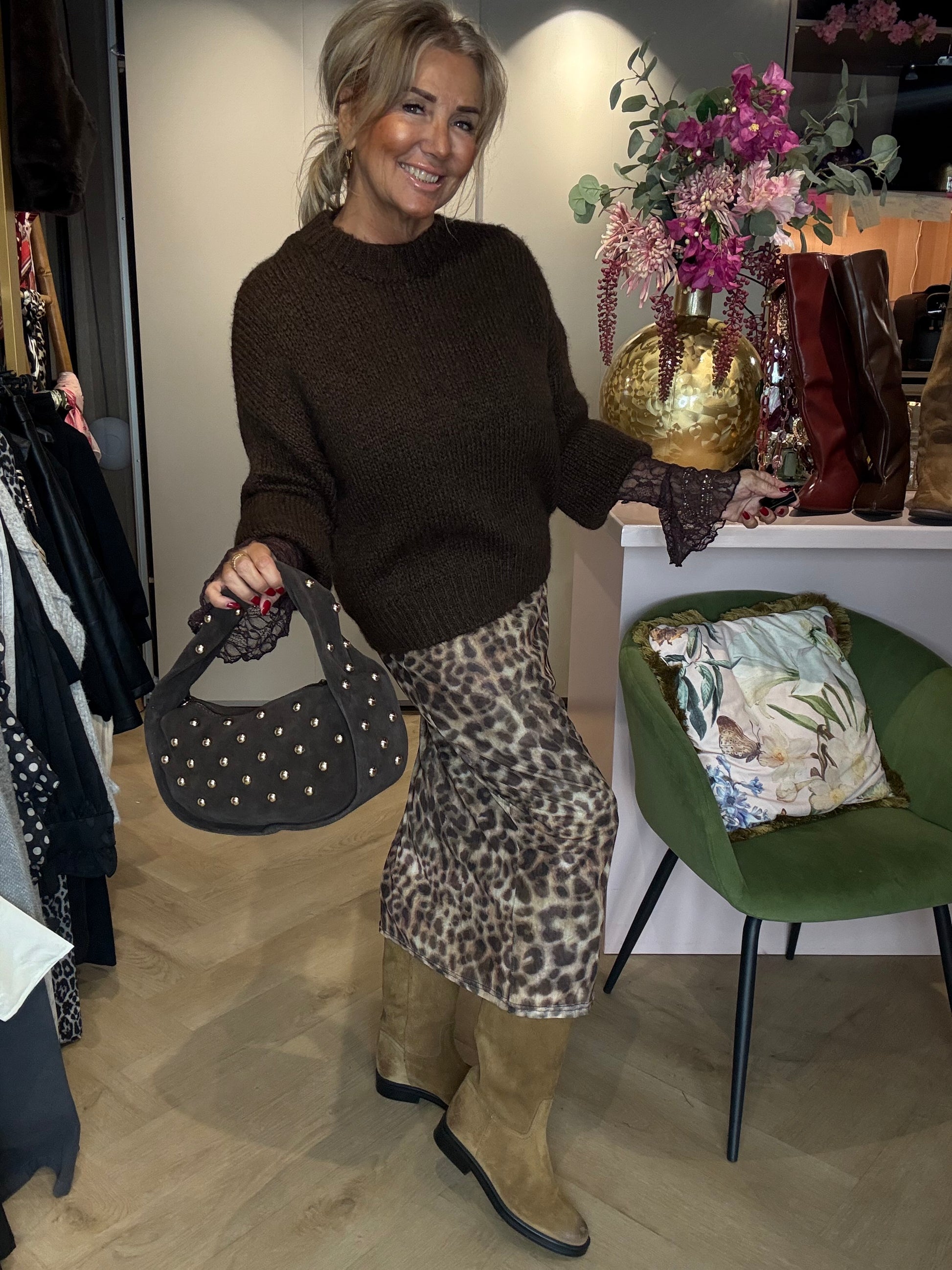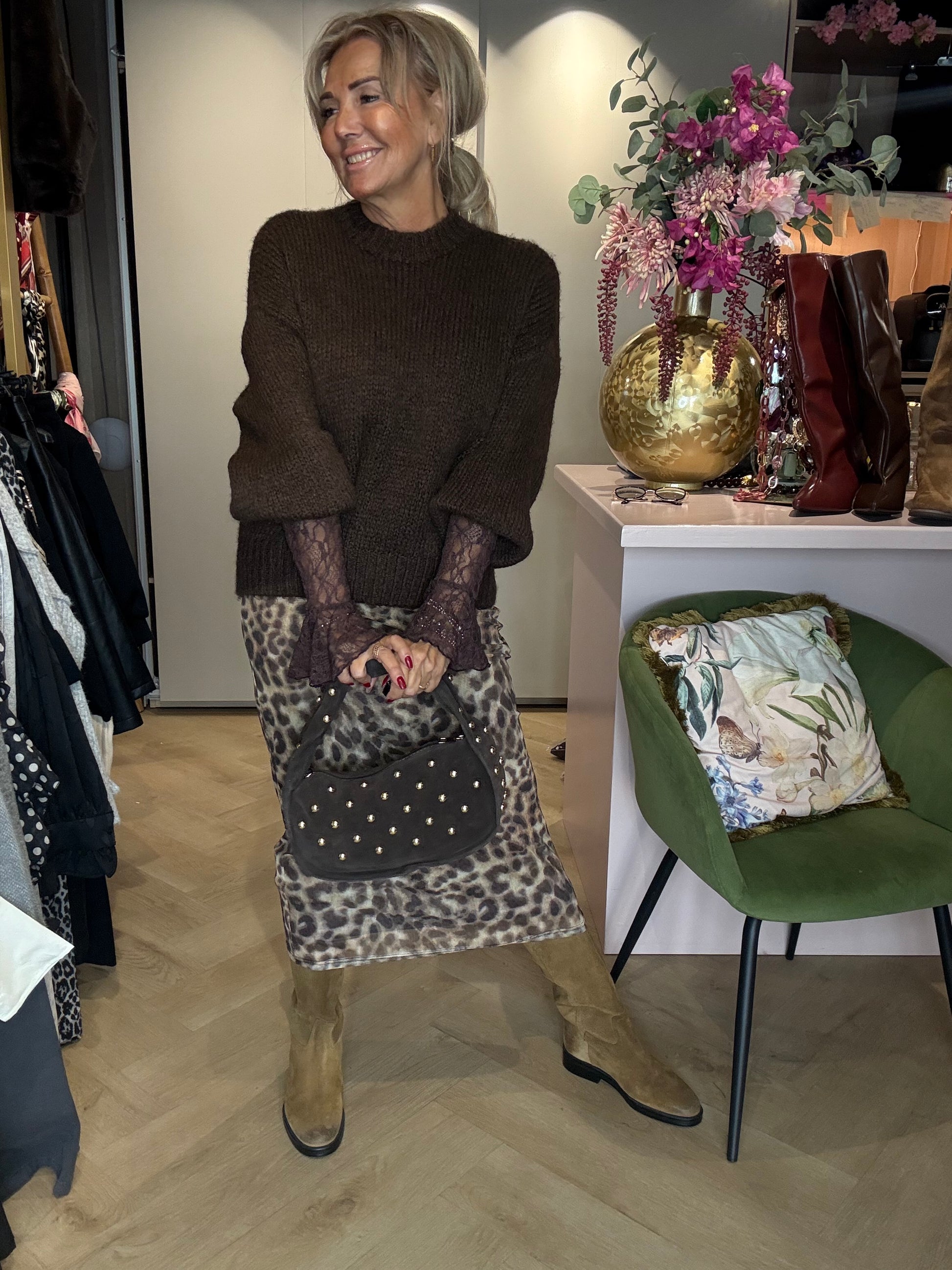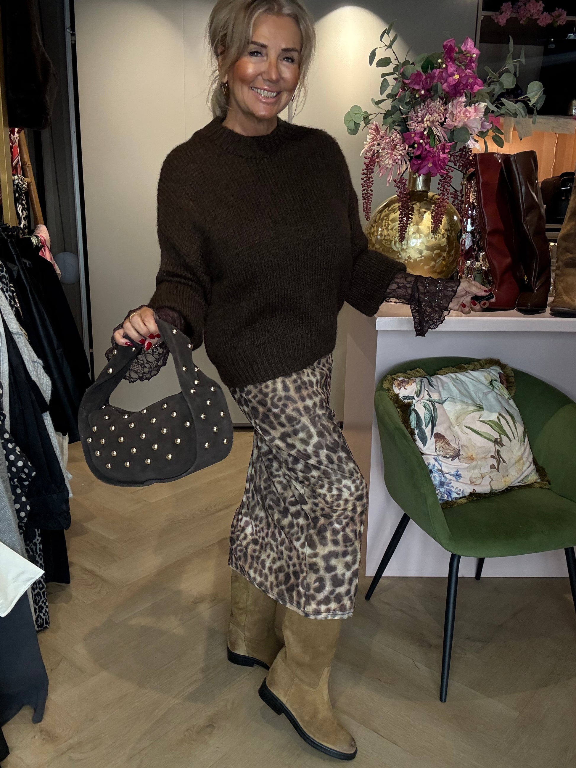 Wij hebben deze prachtige panterrok gecombineerd met een grofgebreide bruine trui en een kanten bruine top eronder voor een warme, stijlvolle look. Maak de outfit compleet met de cognackleurige laarzen uit onze webshop โ een combinatie die pure klasse uitstraalt!