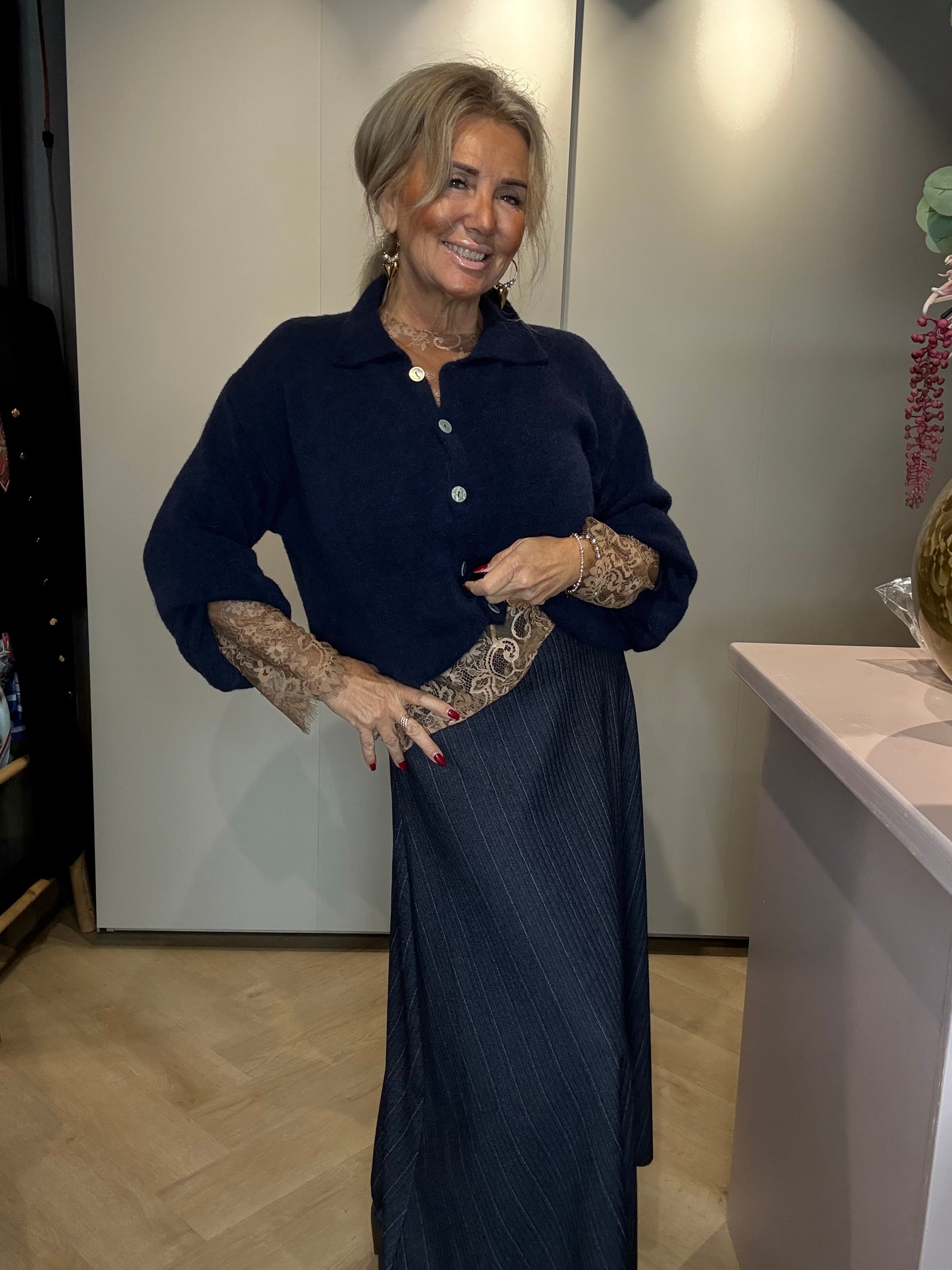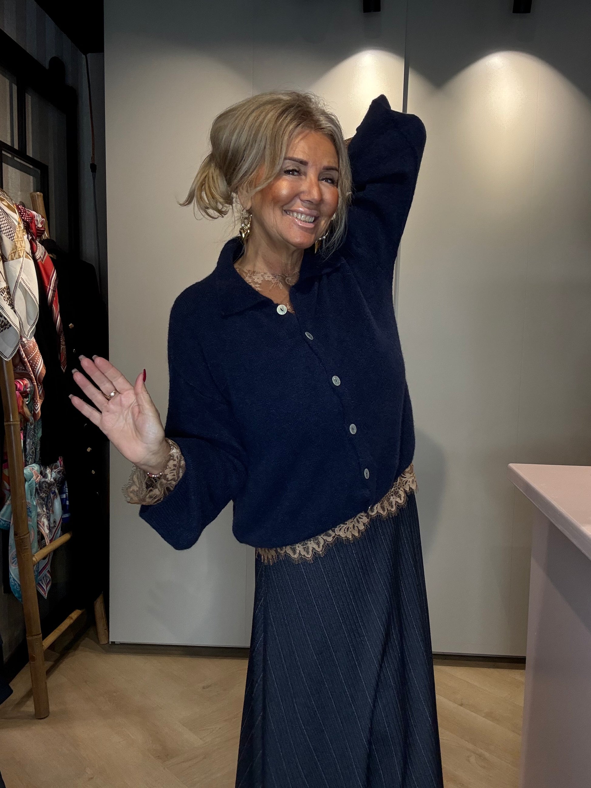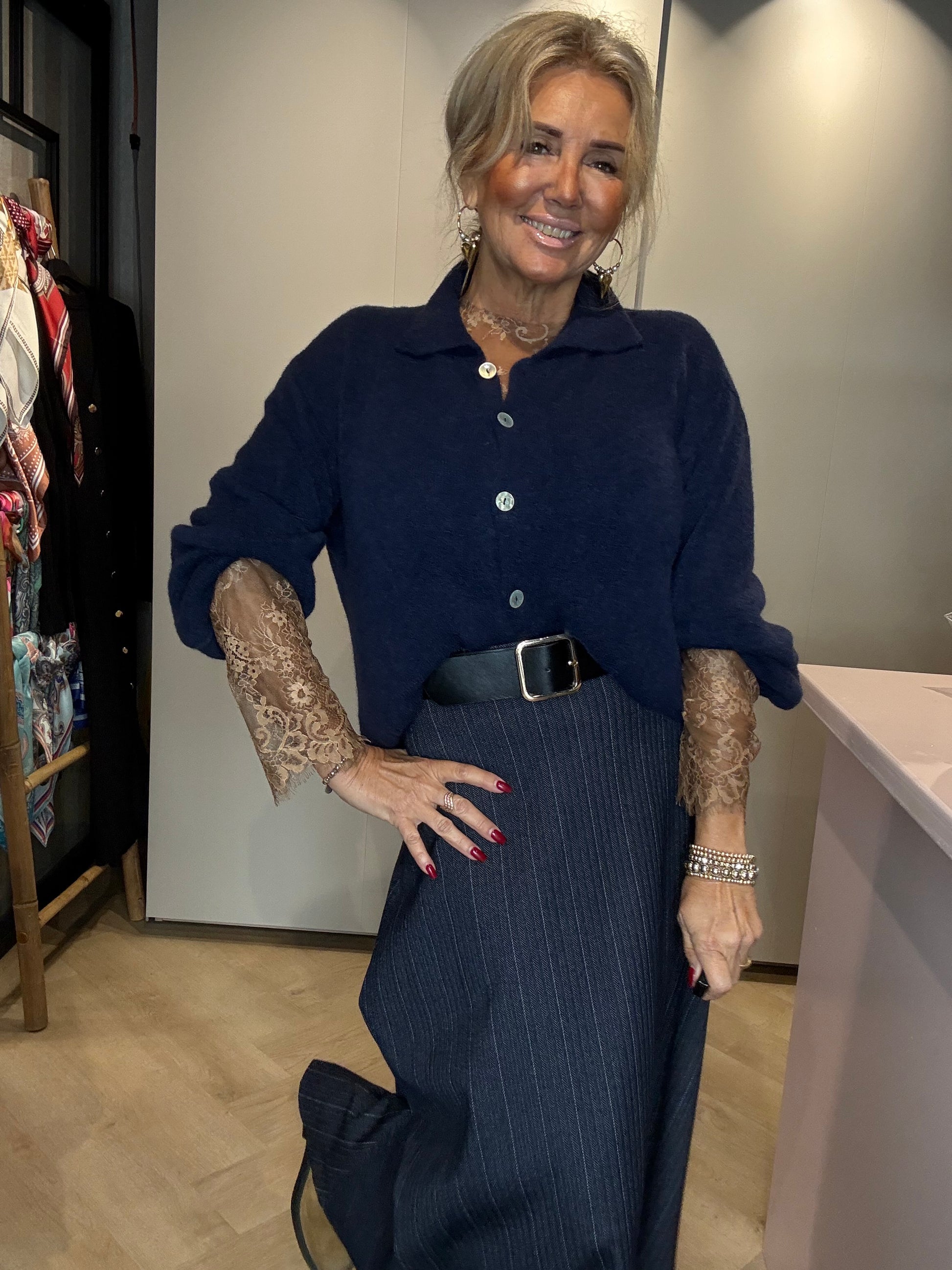 De knoopsluiting aan de voorkant maakt het vestje extra veelzijdig — draag hem open met een mooie top eronder of gesloten voor een klassieke look. Hier gecombineerd met de cognac lace top en een stretch rok met subtiel krijtstreepje, maar dit vestje staat werkelijk overal bij.