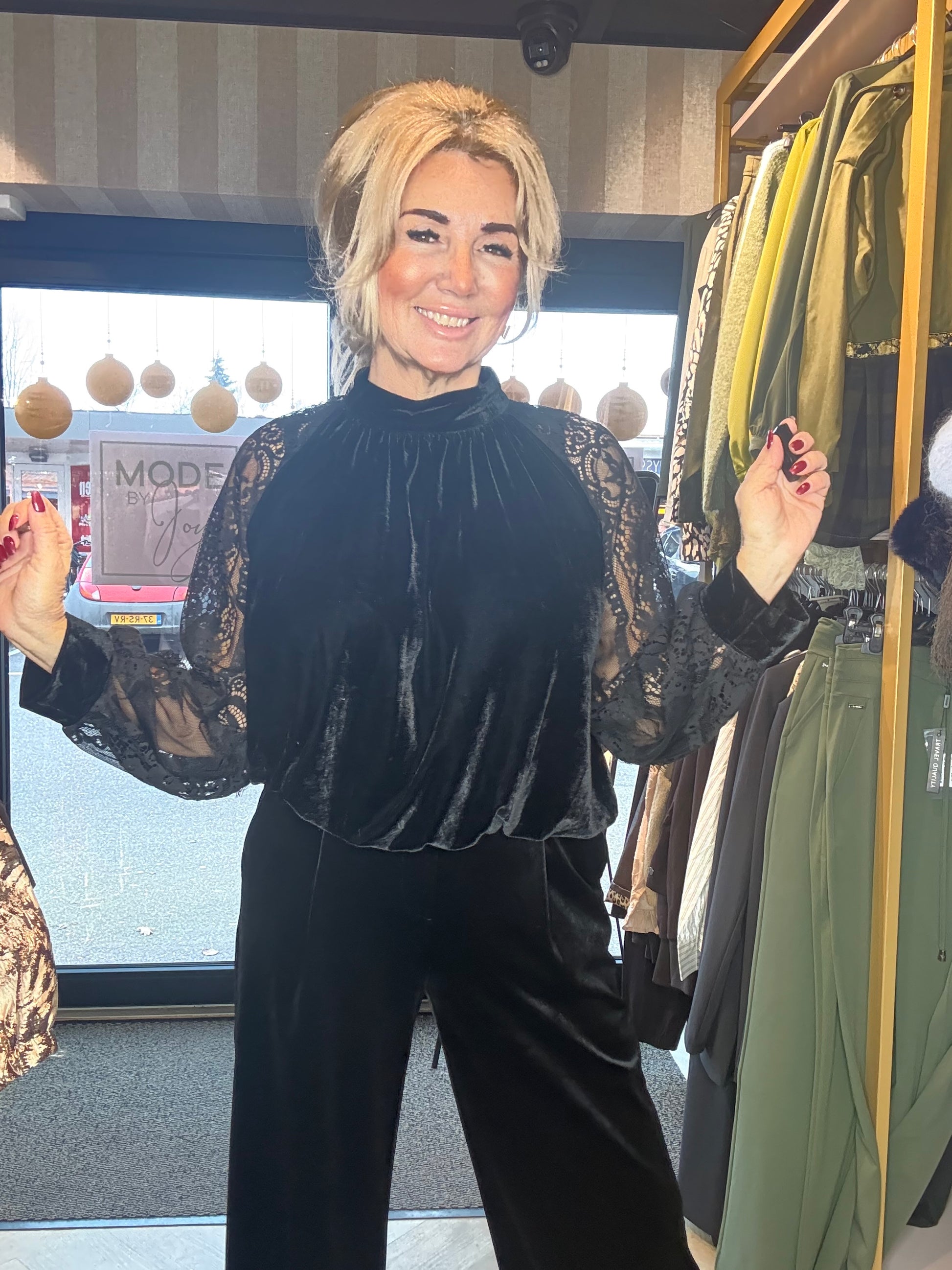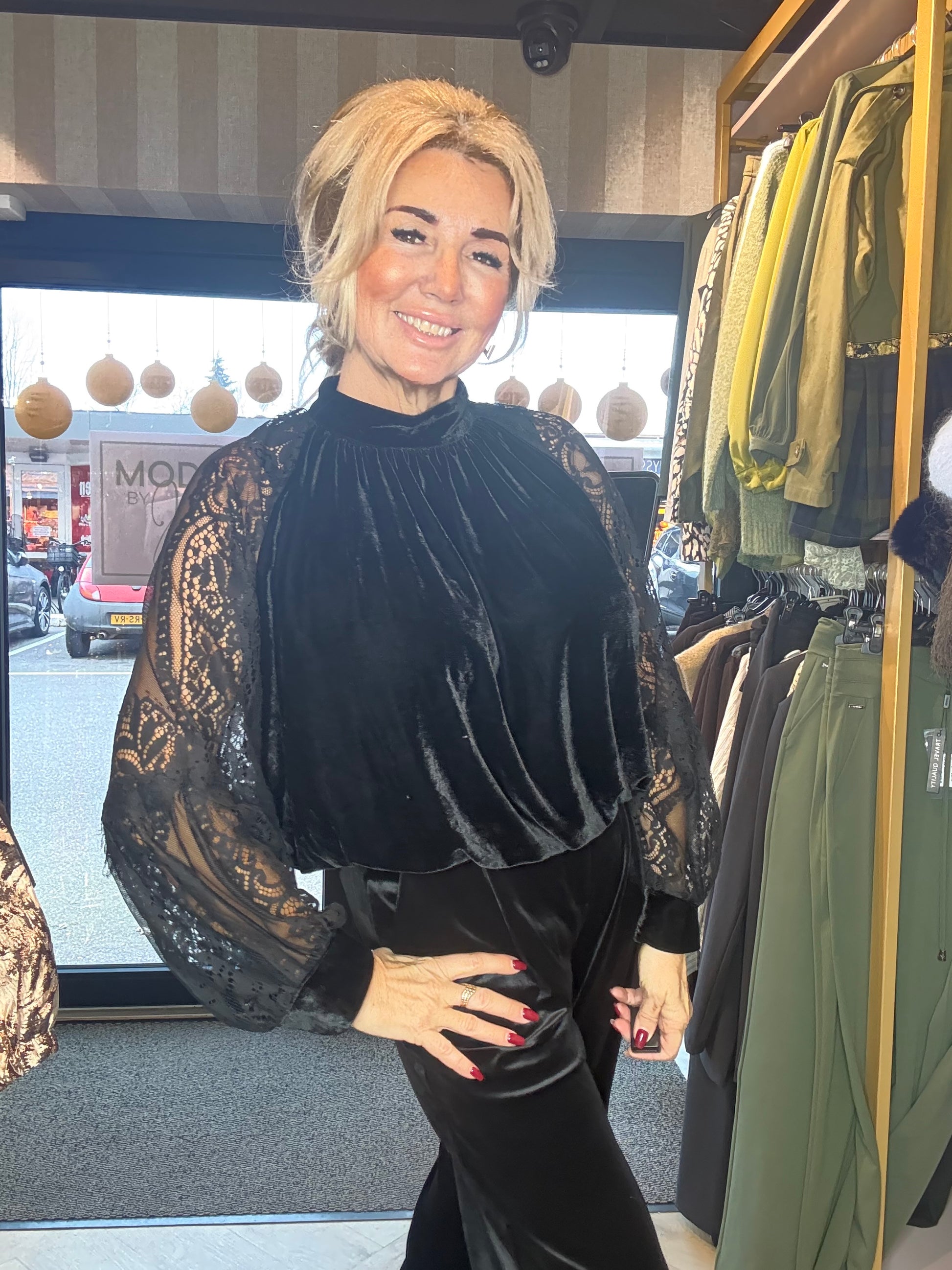 Deze fluwelen top is er ƩƩn die direct luxe en vrouwelijkheid uitstraalt. De zachte, diepe fluweelkwaliteit voelt rijk aan en geeft een elegante glans. Bij de hals sluit de top met twee verfijnde zwarte kraalknoopjes, wat zorgt voor een subtiel chique detail.