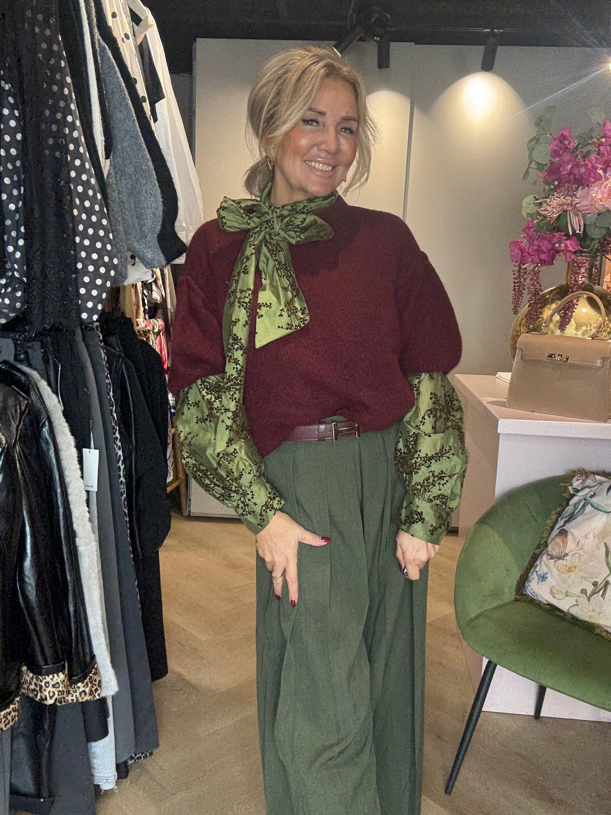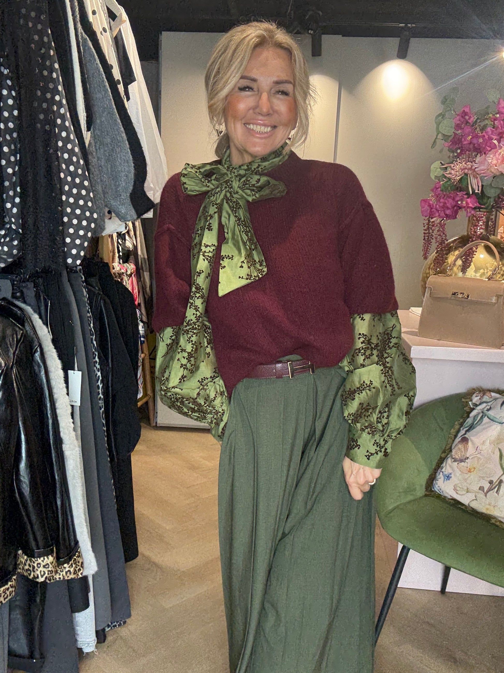 Deze Baby Alpaca trui in de rijke kleur Burgundy is een luxe, zacht en super-draagbaar item van Triple Nine. Het model is iets ruimer dan de basis kortemouw-truitjes, waardoor hij iets ruimer valt en extra comfortabel zit voor de iets grotere maten. De korte mouw is bewust iets wijder, perfect om over een blouse te dragen. Als stijlvol detail loopt er halverwege de mouw een speelse, “binnenstebuiten” ogende naad — subtiel en modern.