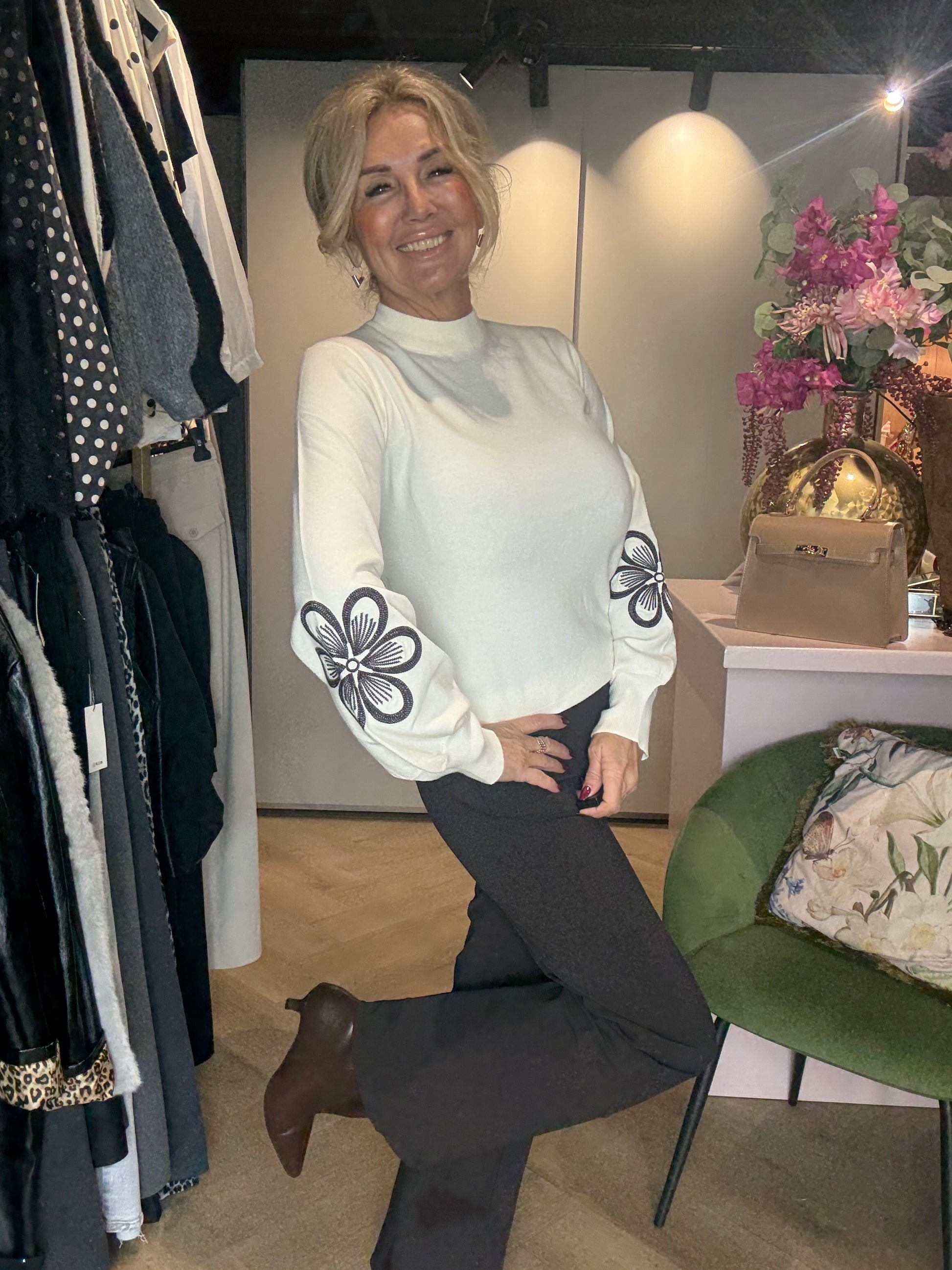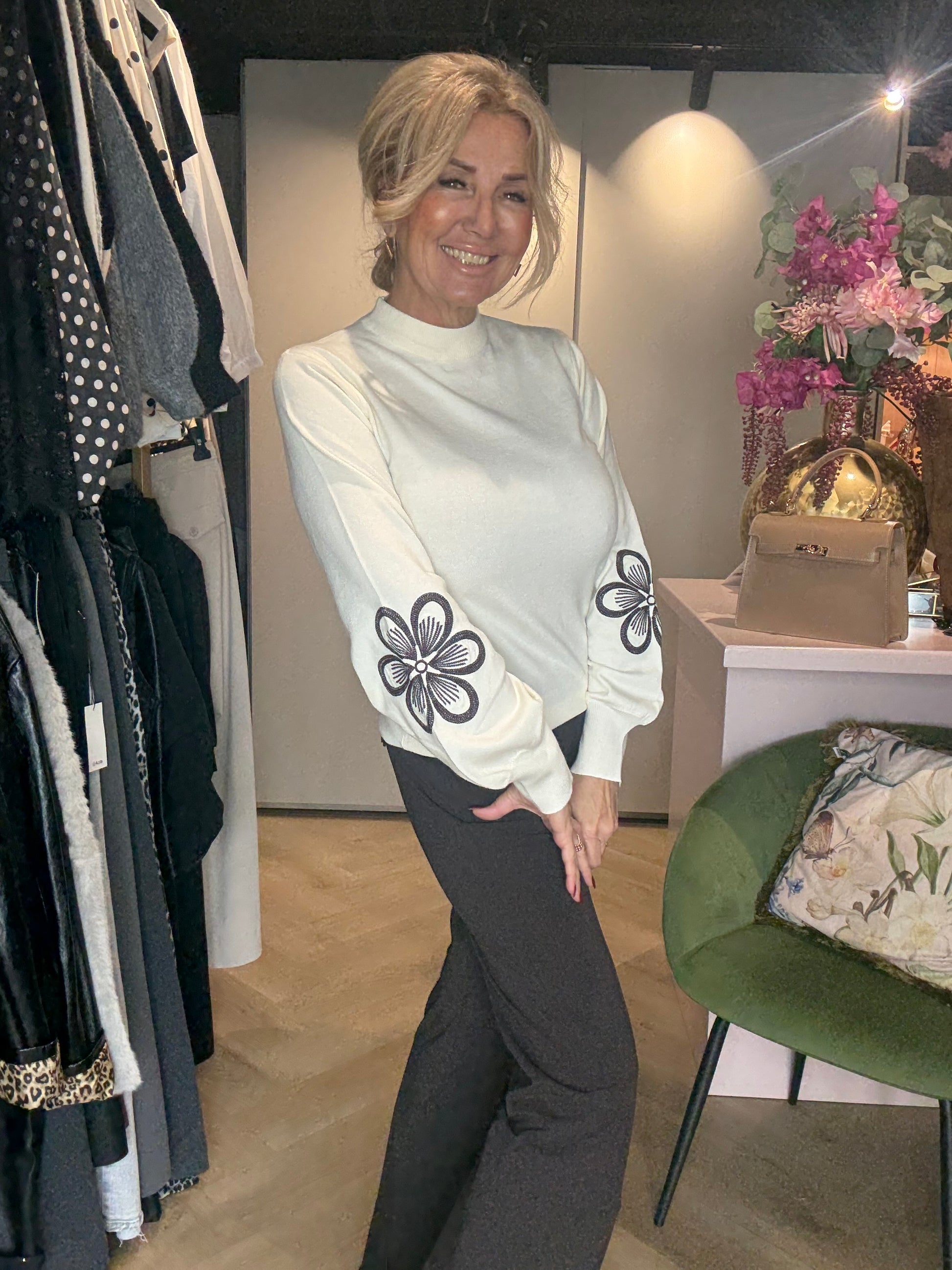 De elegante, lange manchette geeft de mouw een zachte plof, wat zorgt voor een vrouwelijke en stijlvolle uitstraling. Aan de onderkant van de mouw vind je het detail waar dit item z’n naam aan dankt: een prachtig geborduurde donkerbruine bloem. Dit chique accent sluit perfect aan bij de kleuren van de Triple Nine broeken en maakt het truitje extra bijzonder.