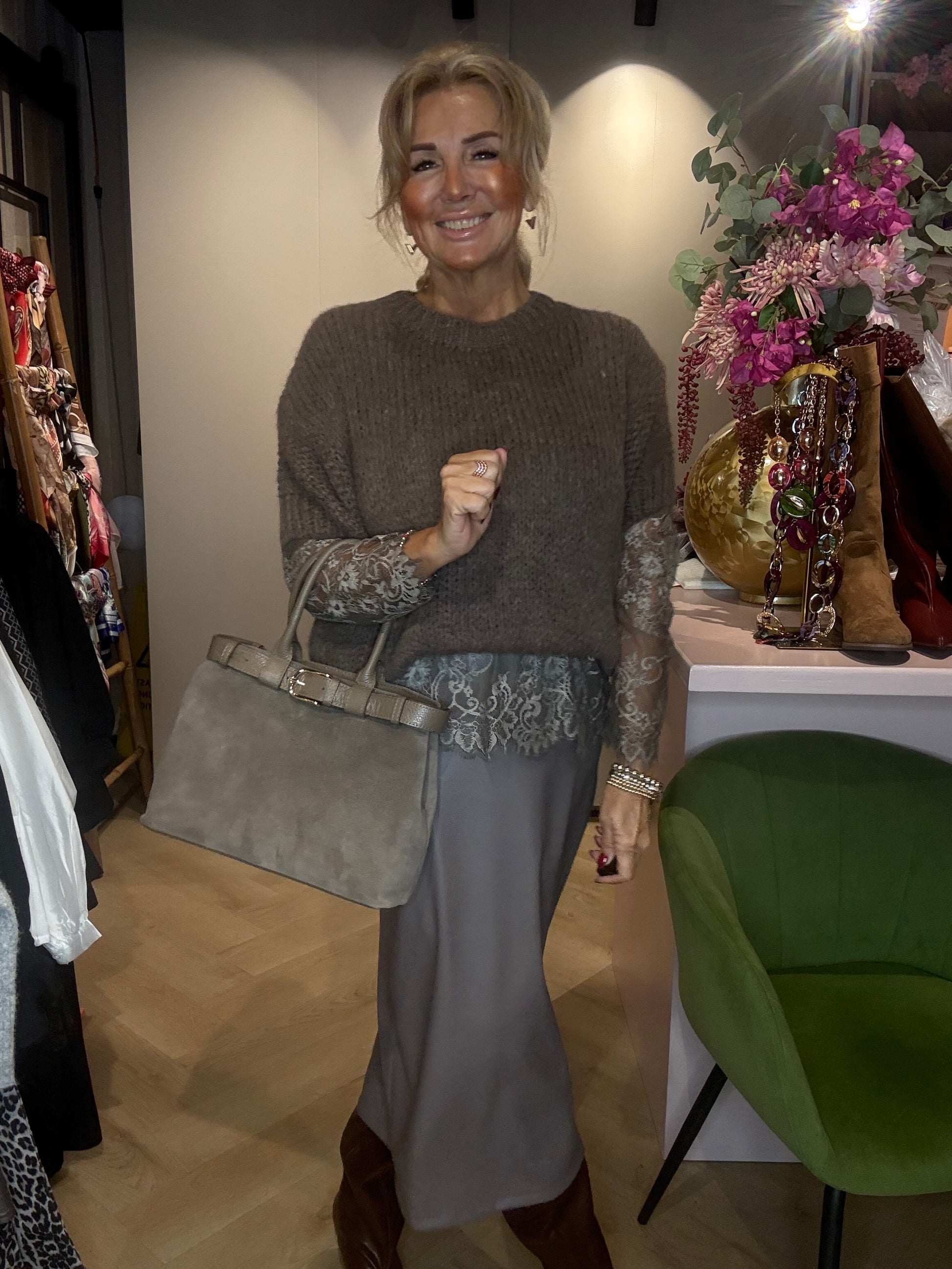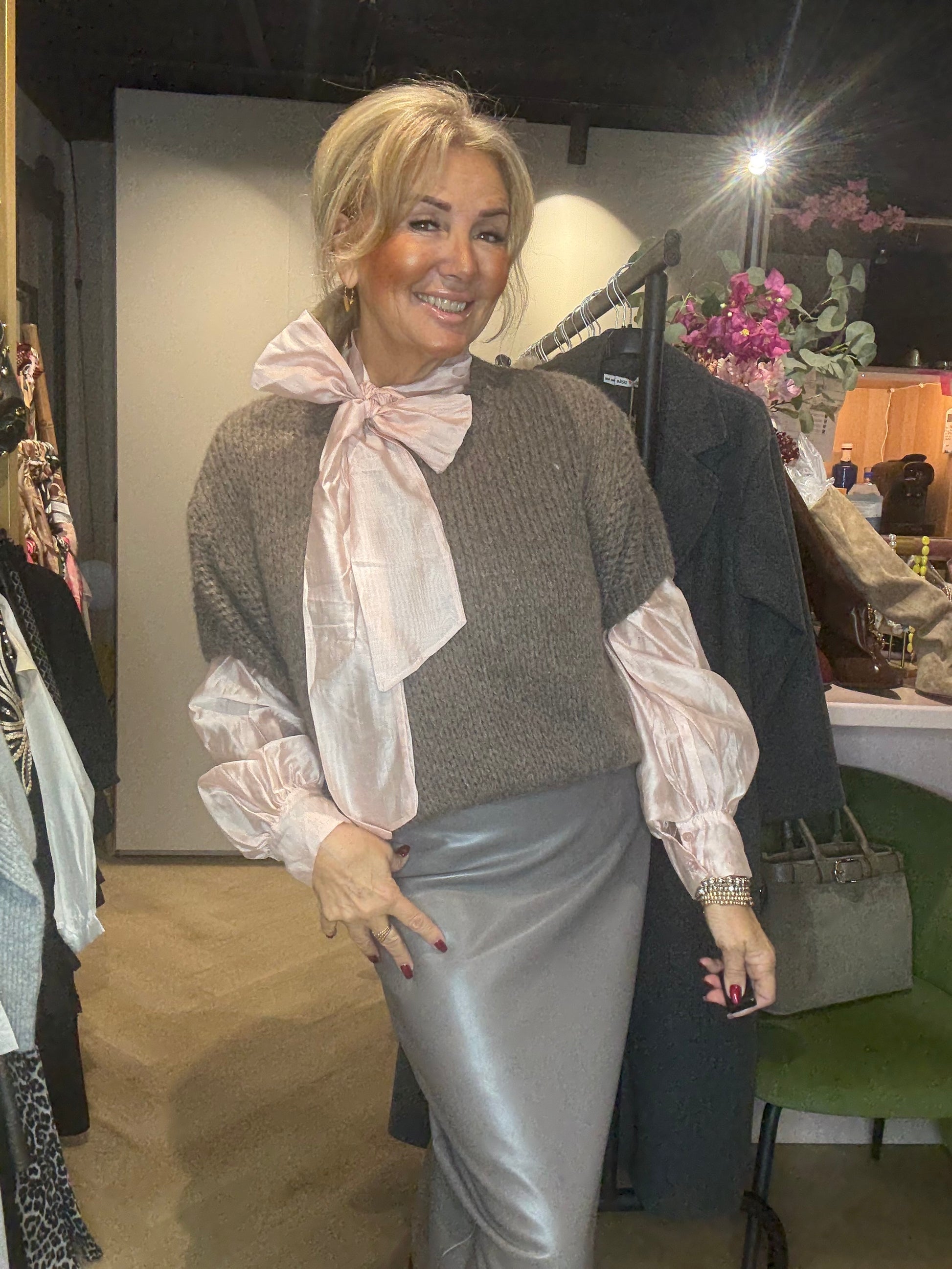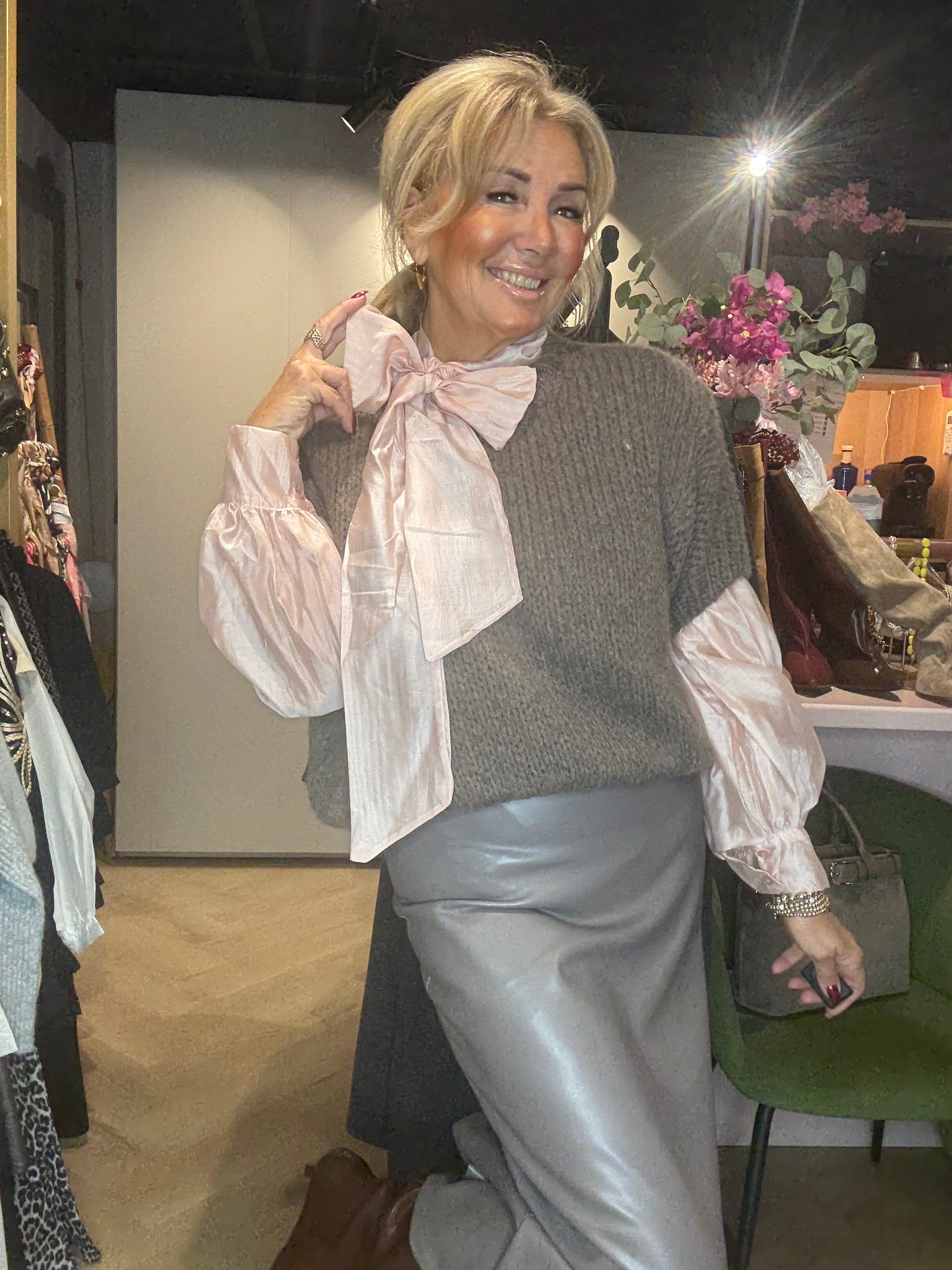 Wij combineren hem hier met de PU-leatherlook rok in taupe en de poederroze Bow Blouse voor een chique ton-sur-ton outfit met een zachte, vrouwelijke touch. Ook is deze trui prachtig te combineren met de lace top in dezelfde taupekleur – dat geeft een subtiel en elegant laagjes-effect. 🌸