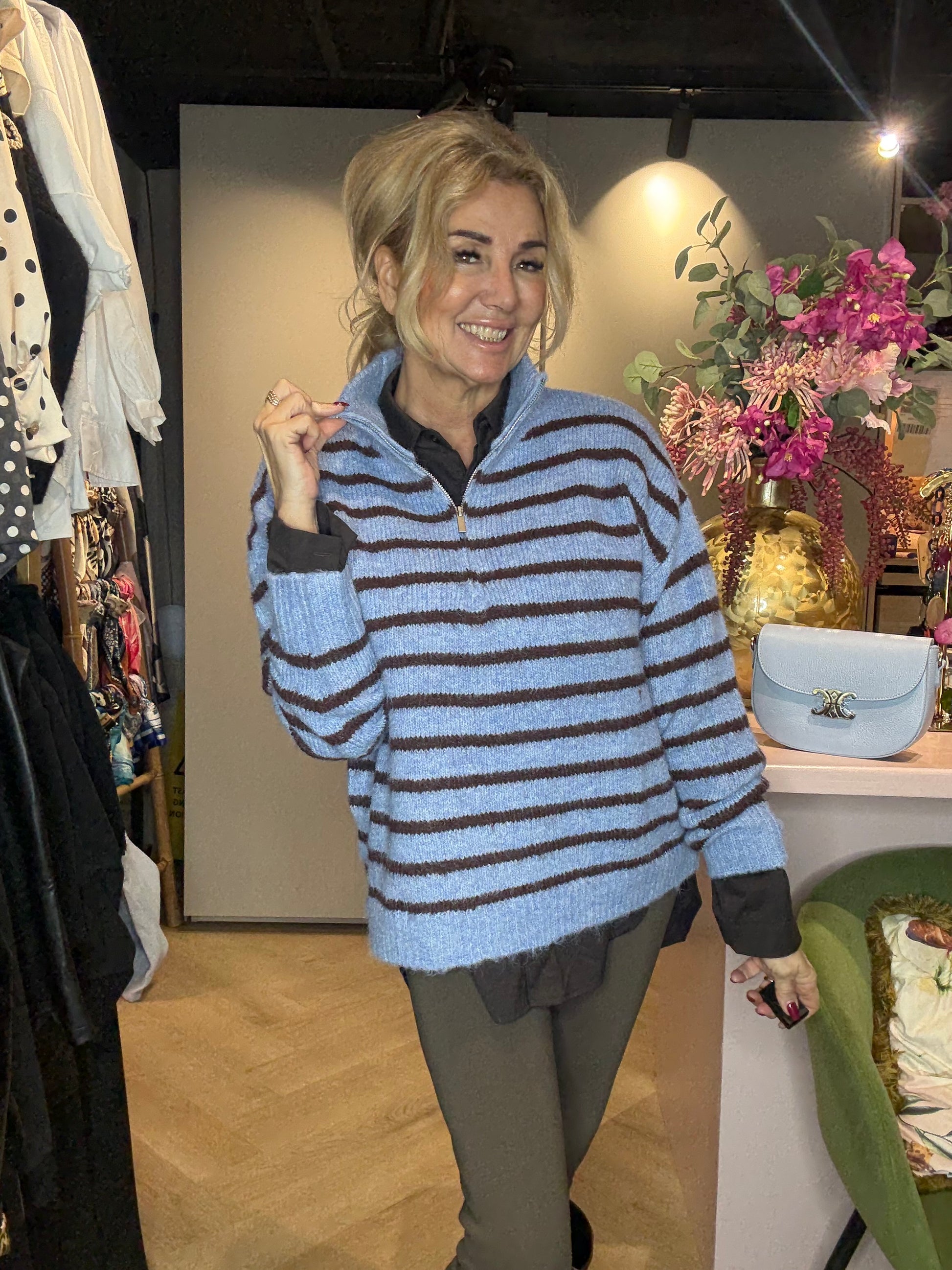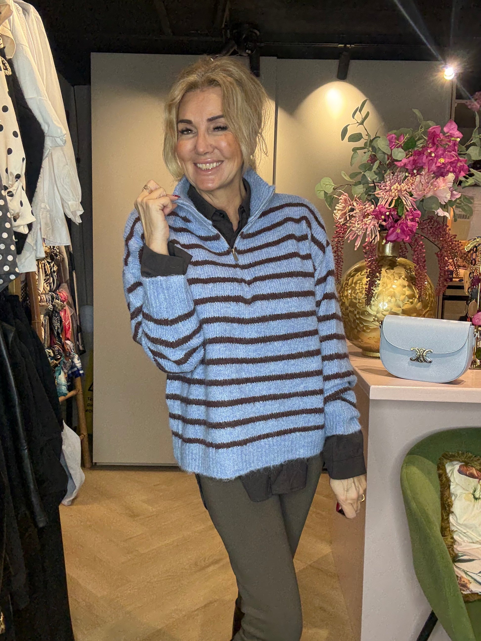 - Vernieuwde Schippers trui in lichtblauw met donkerbruine streep
