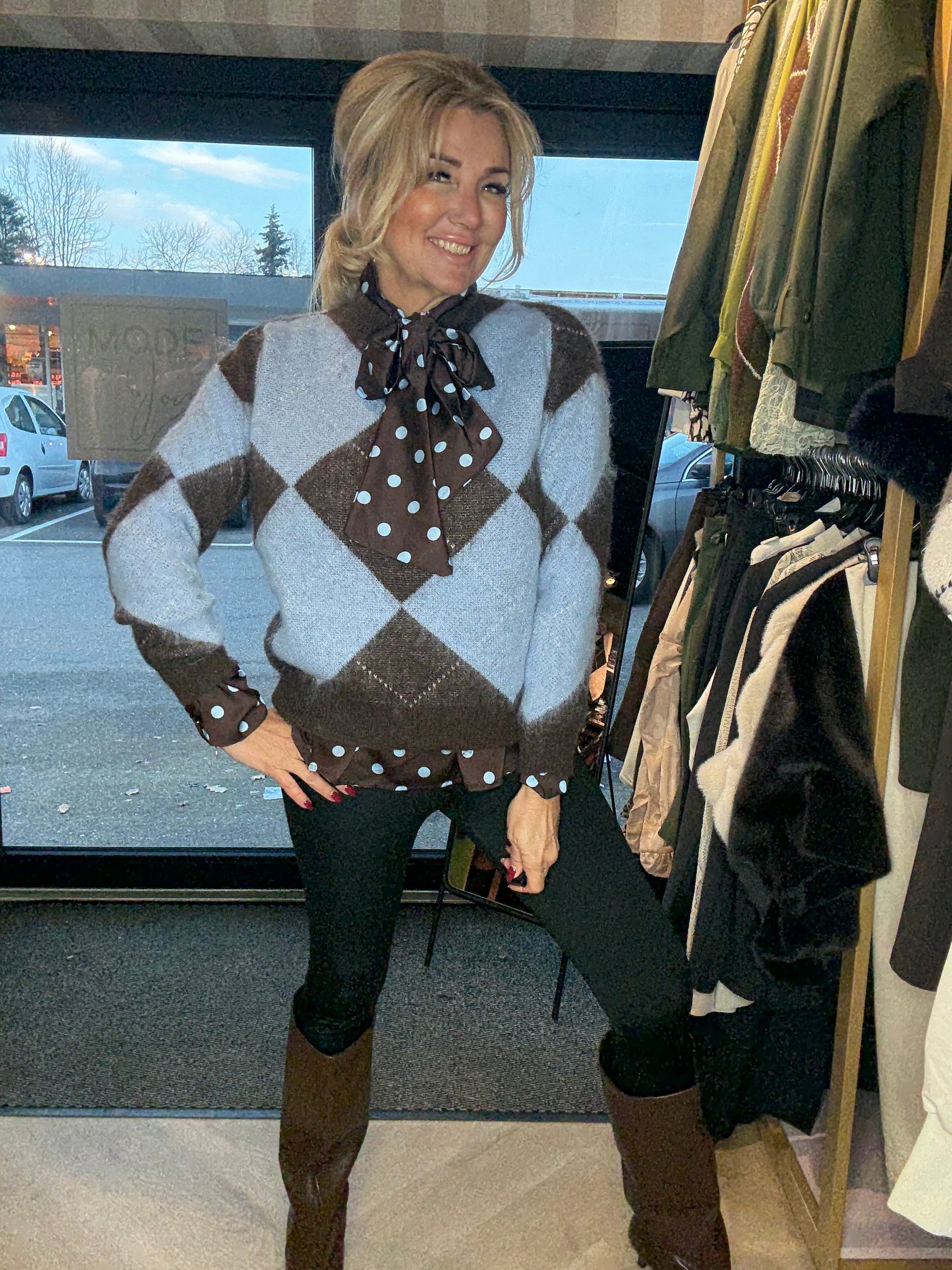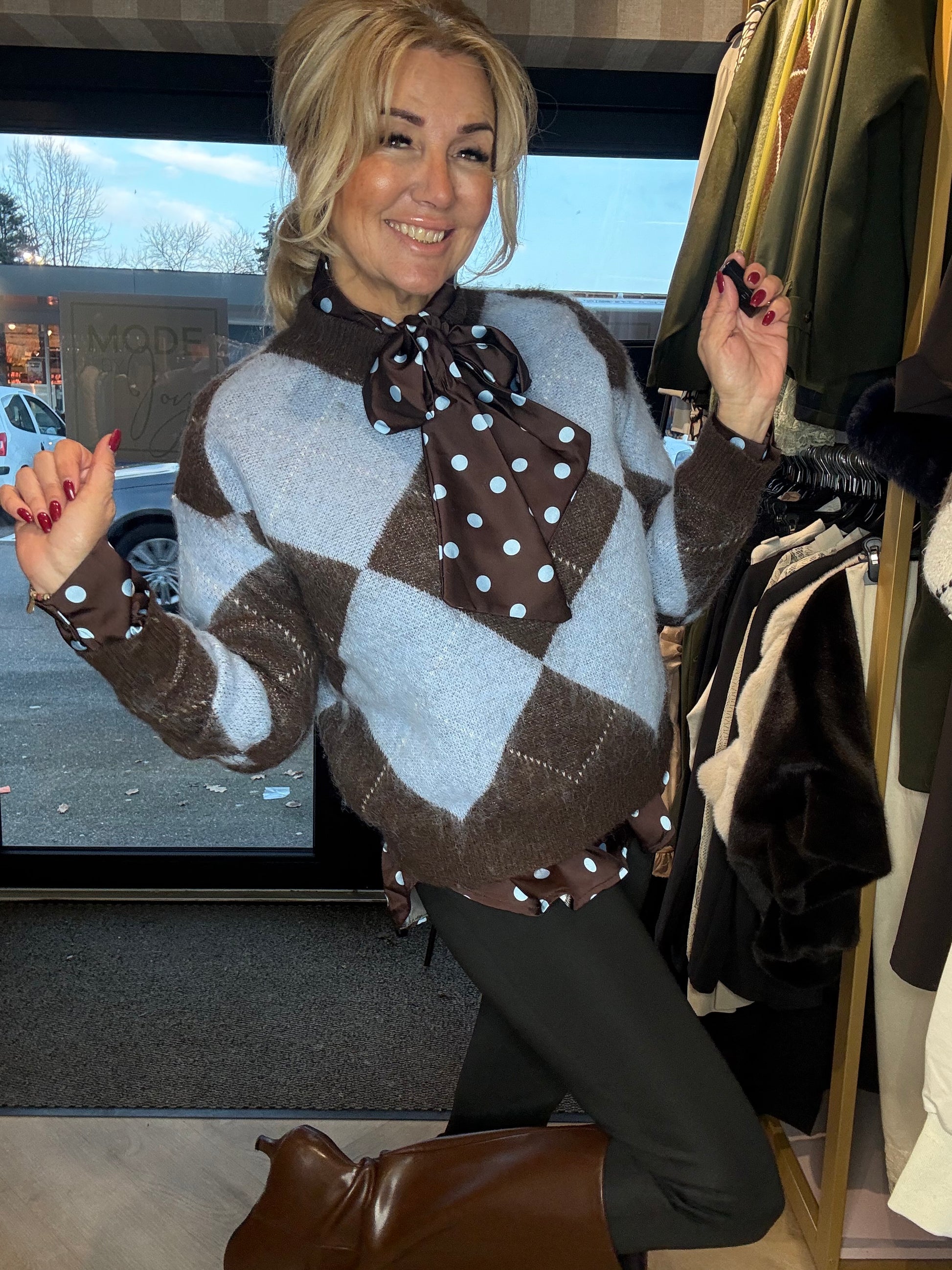 Wij hebben hem hier gecombineerd met de bruine Polkadot blouse met lichtblauwe stip – een perfecte match! Maar ook op een zwarte legging met onze donkerbruine laars (verkrijgbaar in de winkel) is hij echt top. Of draag hem lekker stoer op een jeans… deze trui kan álle kanten op.