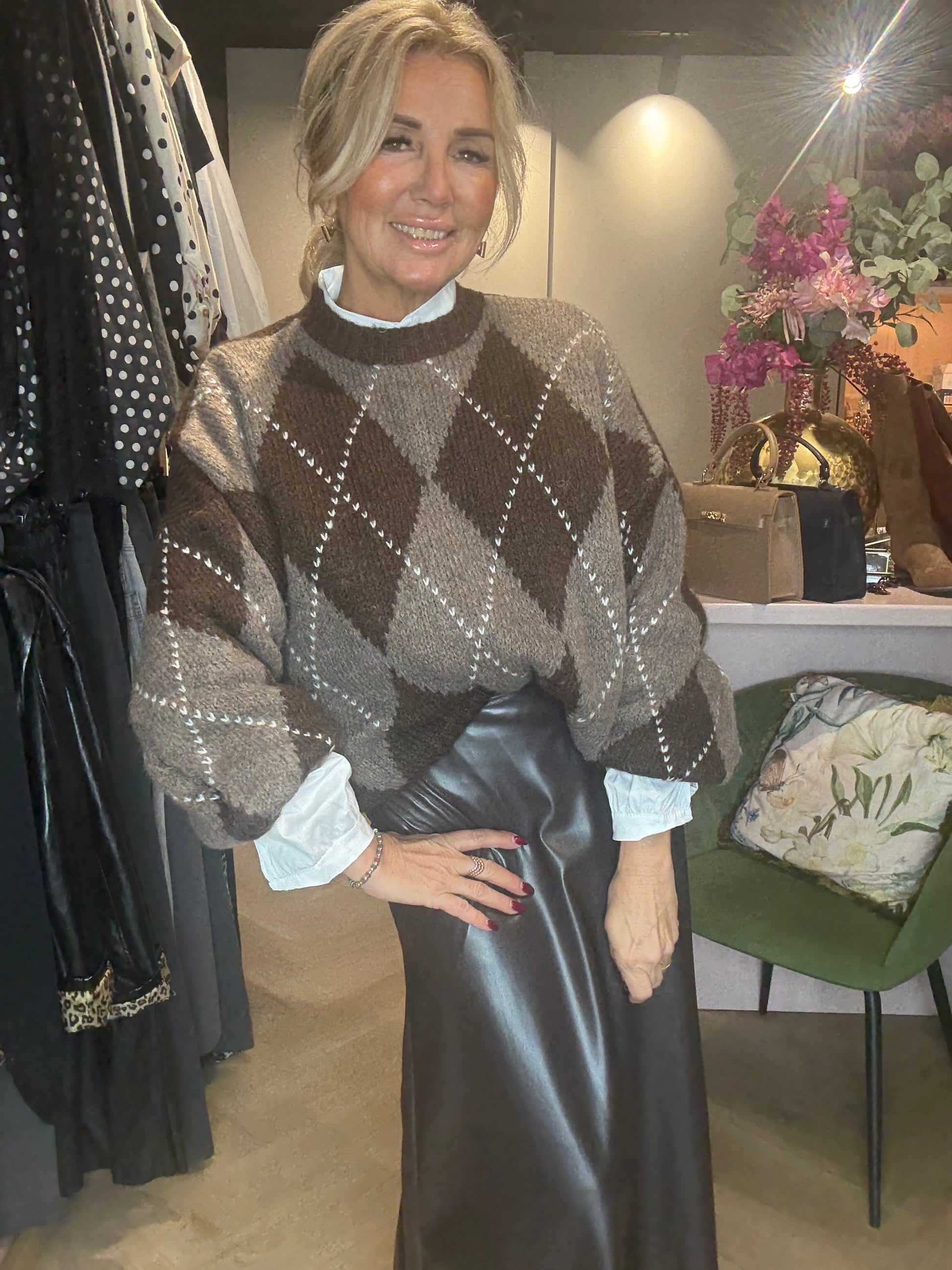 De trui is gemaakt van een heerlijke zachte kwaliteit die niet kriebelt en soepel valt. Dankzij het one size model, draagbaar tot een ruime maat 44, zit hij comfortabel en flatteert hij prachtig. Wij hebben hem hier gecombineerd met een vegan leather rok in dark brown — een perfecte match voor een stijlvolle, maar toch stoere look. ✨