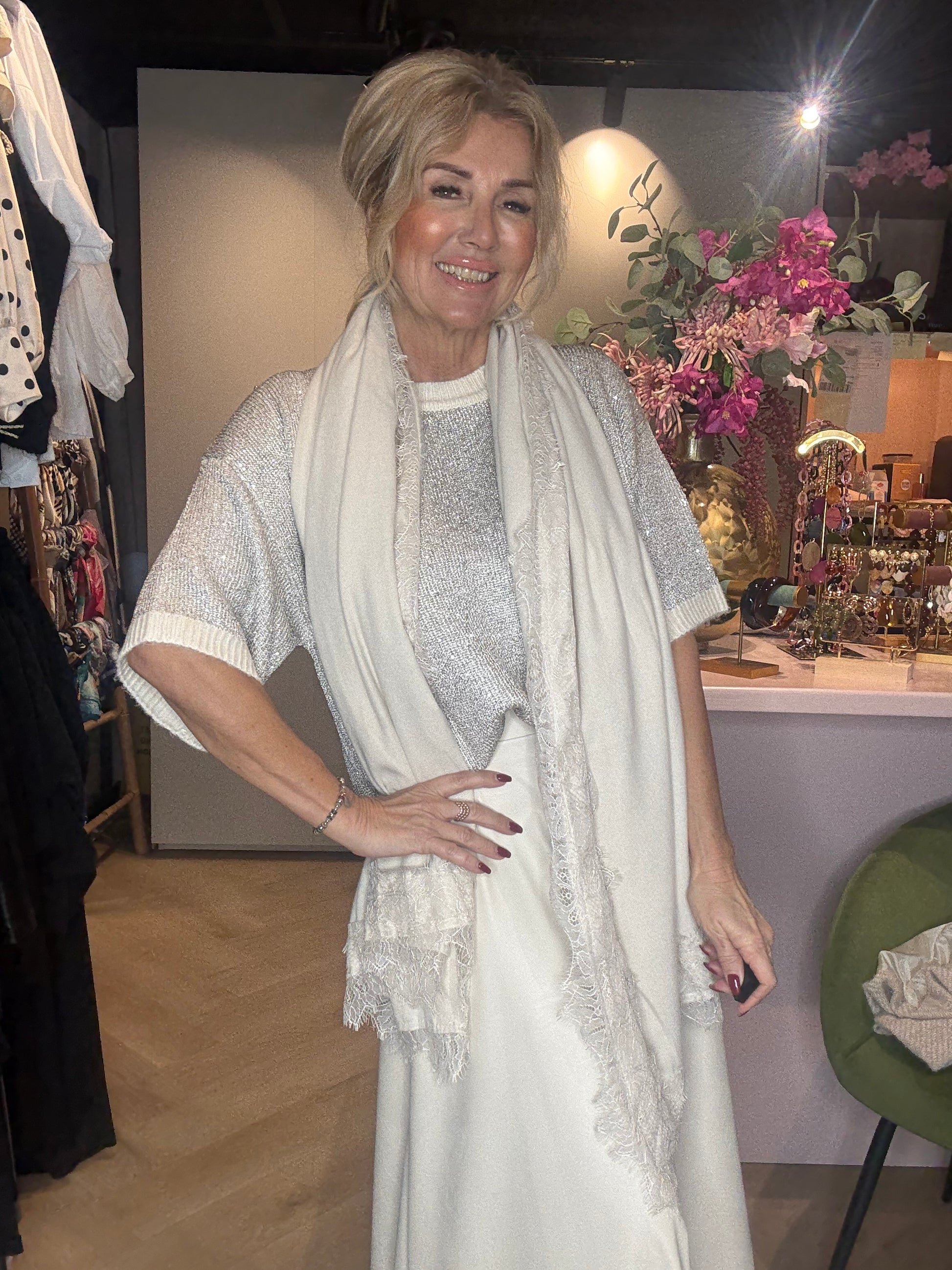 ✨ Luxe knitwear top met shimmer – wolwit & zilver ✨