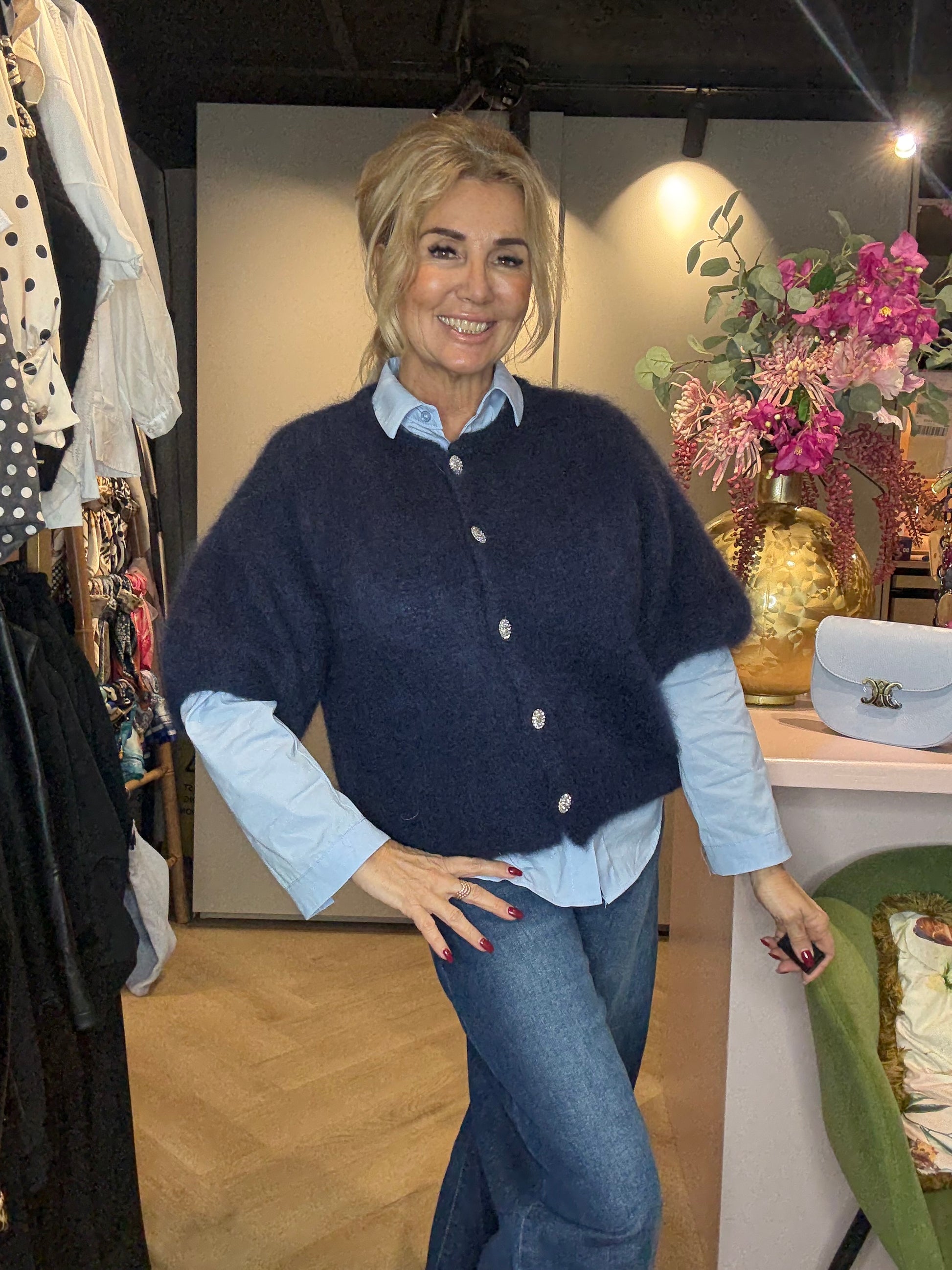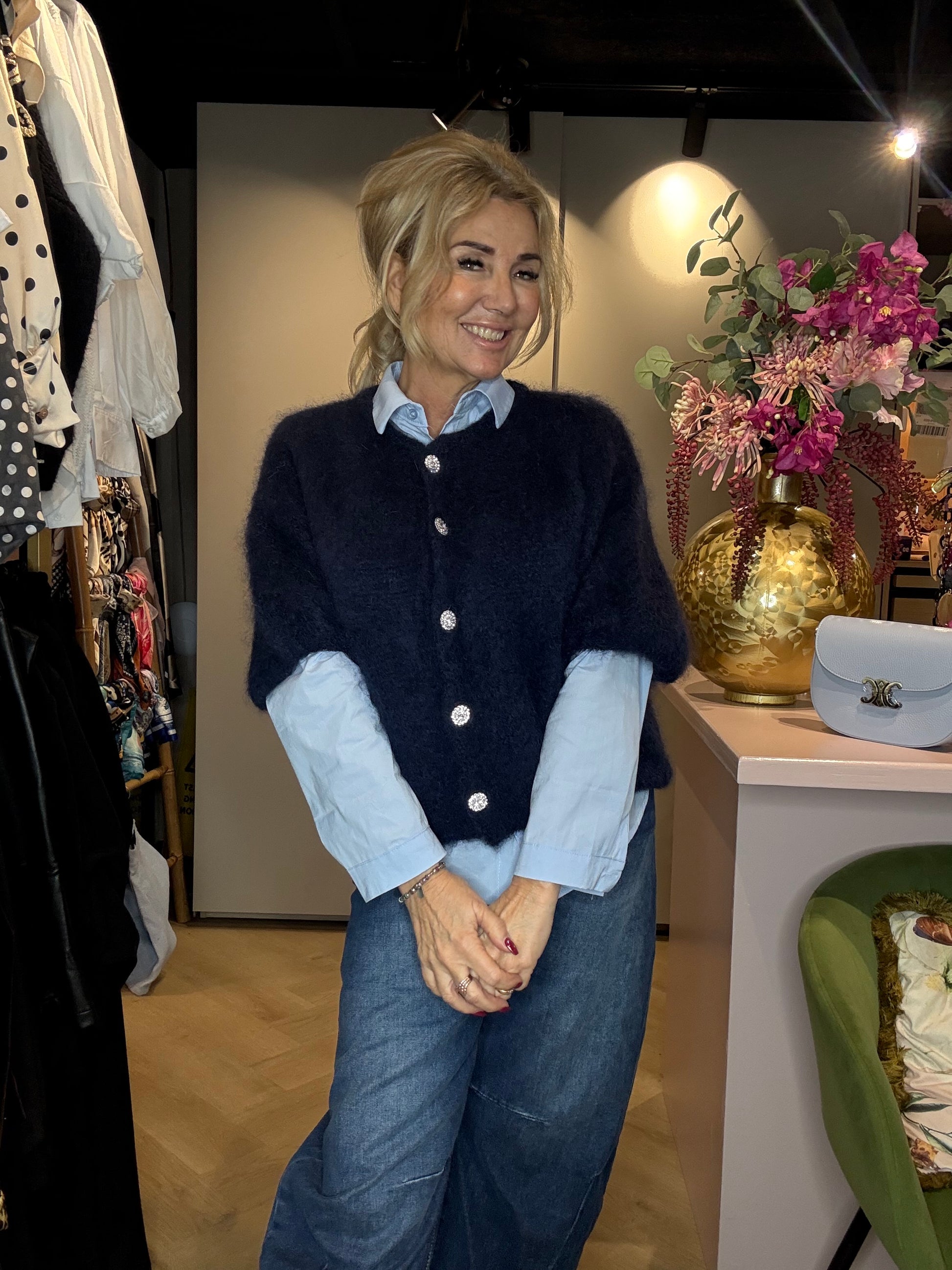 Wauw… dit mohair vestje in diep donkerblauw straalt pure elegantie uit. De rijke kleur, de zachte fluffy mohairmix en de verfijnde afwerking maken dit vestje een tijdloze musthave in je garderobe. Hij voelt heerlijk licht aan, draagt comfortabel en geeft elke outfit een chique, warme uitstraling.