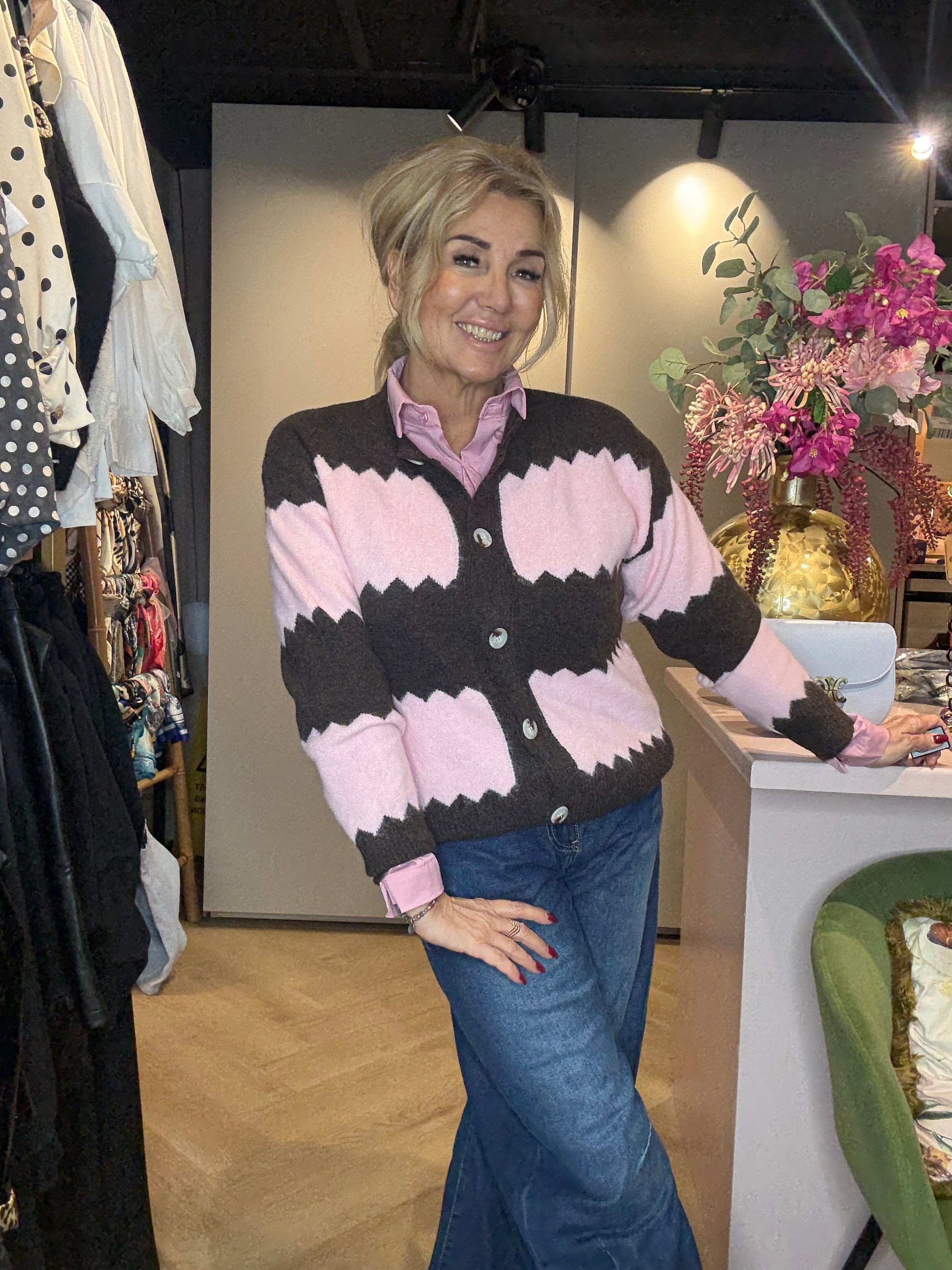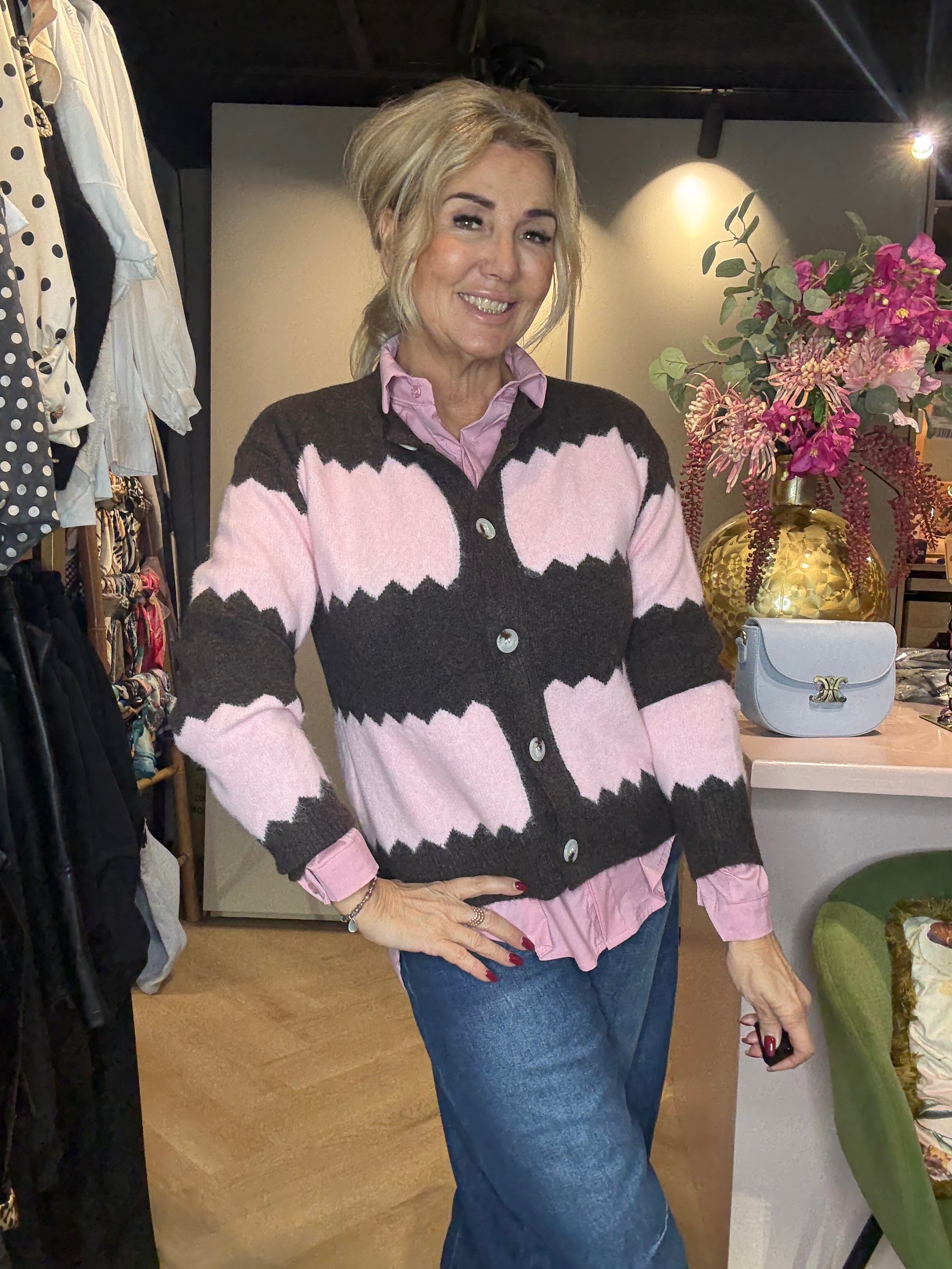 - Vest in zachtroze met donkerbruin zigzagmotief